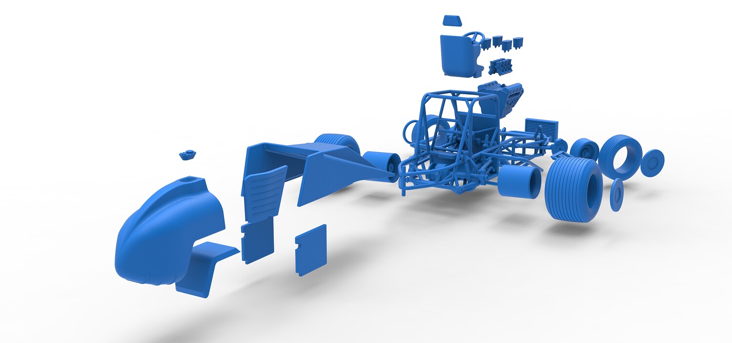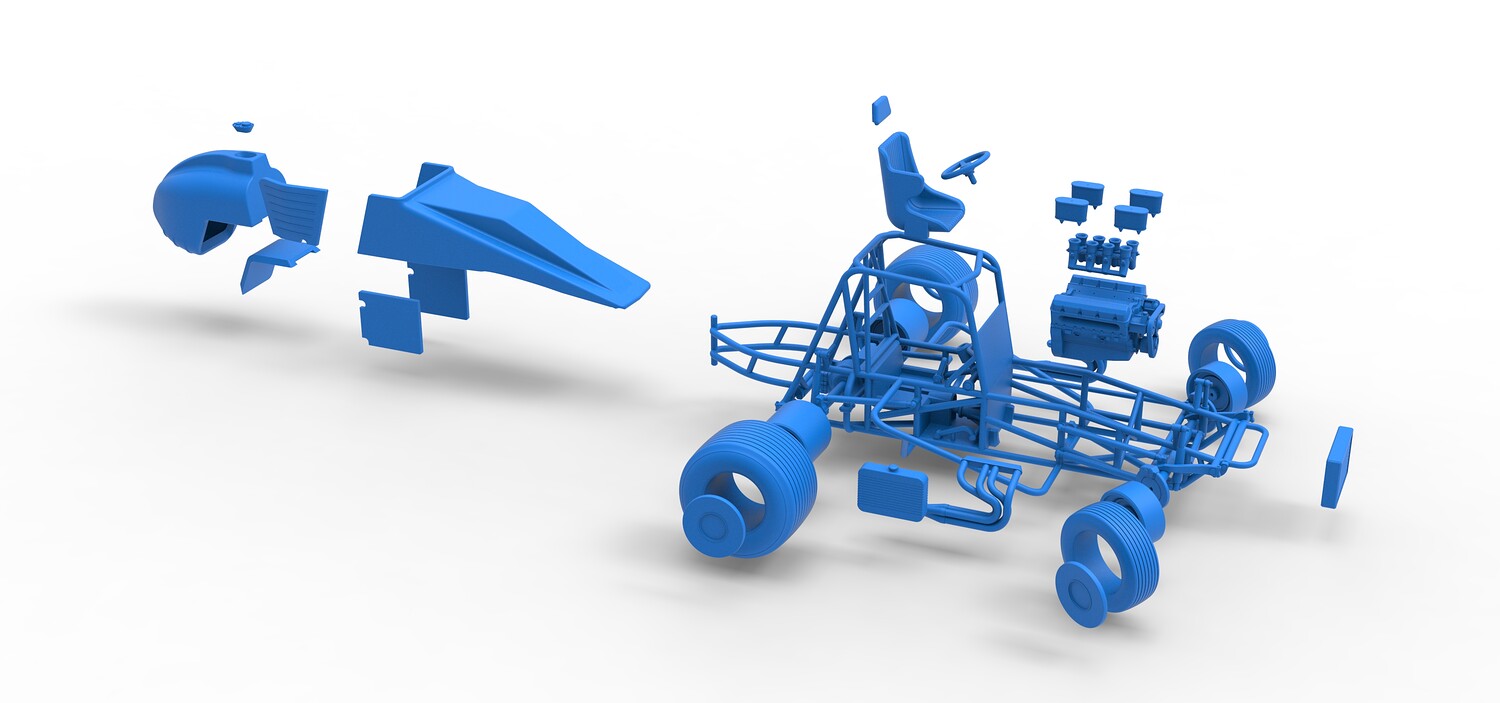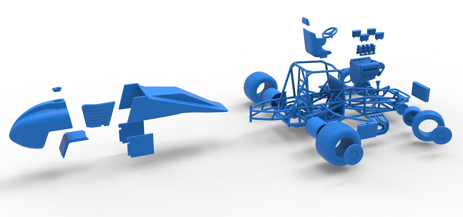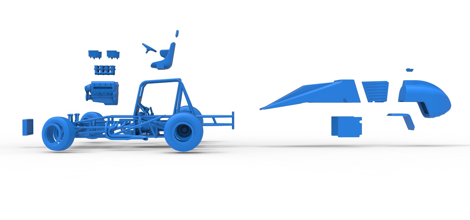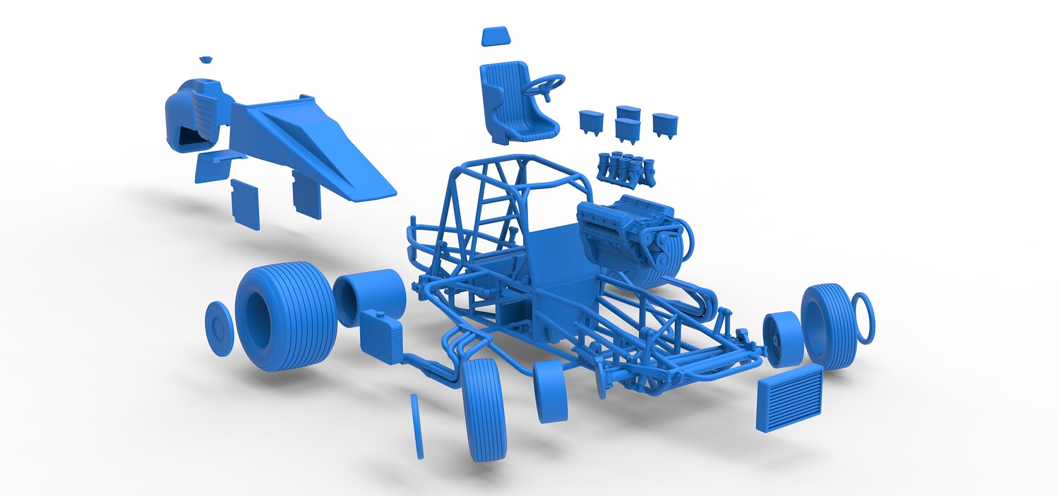 The model consists of parts: Air filters, Air intake, Beadlock rings, Engine, Frame, Front rims, Front tires, Fuel tank bottom plate, Fuel tank insert, Fuel tank, Headrest, Hood, Left exhaust, Oil tank, Radiator, Rear left tire, Rear right tire, Rear rims, Right exhaust, Right side shield, Rim covers, Seat, Side plates, Steering wheel.