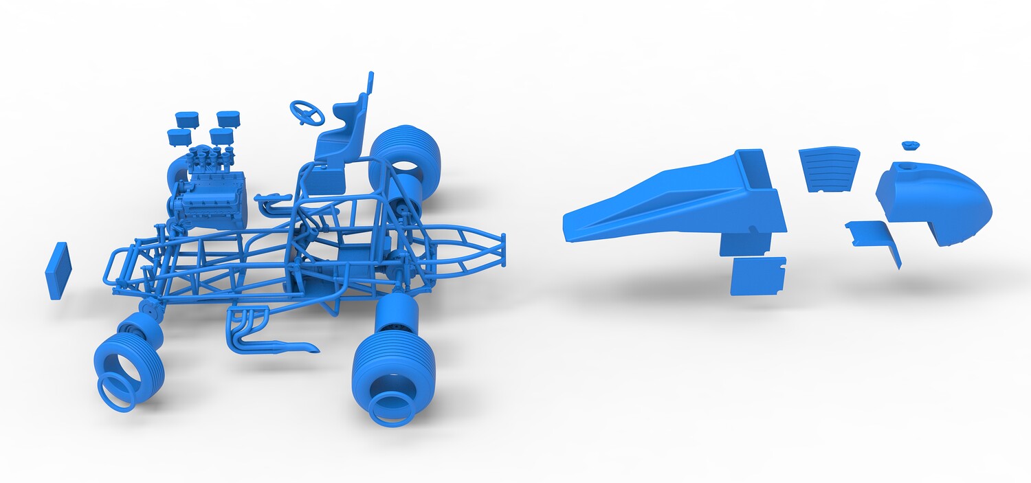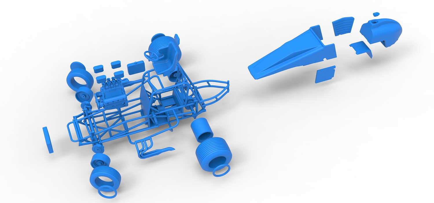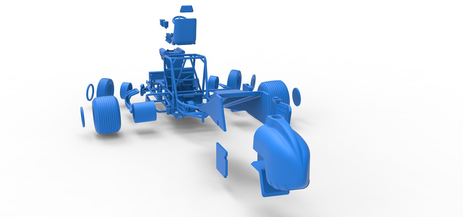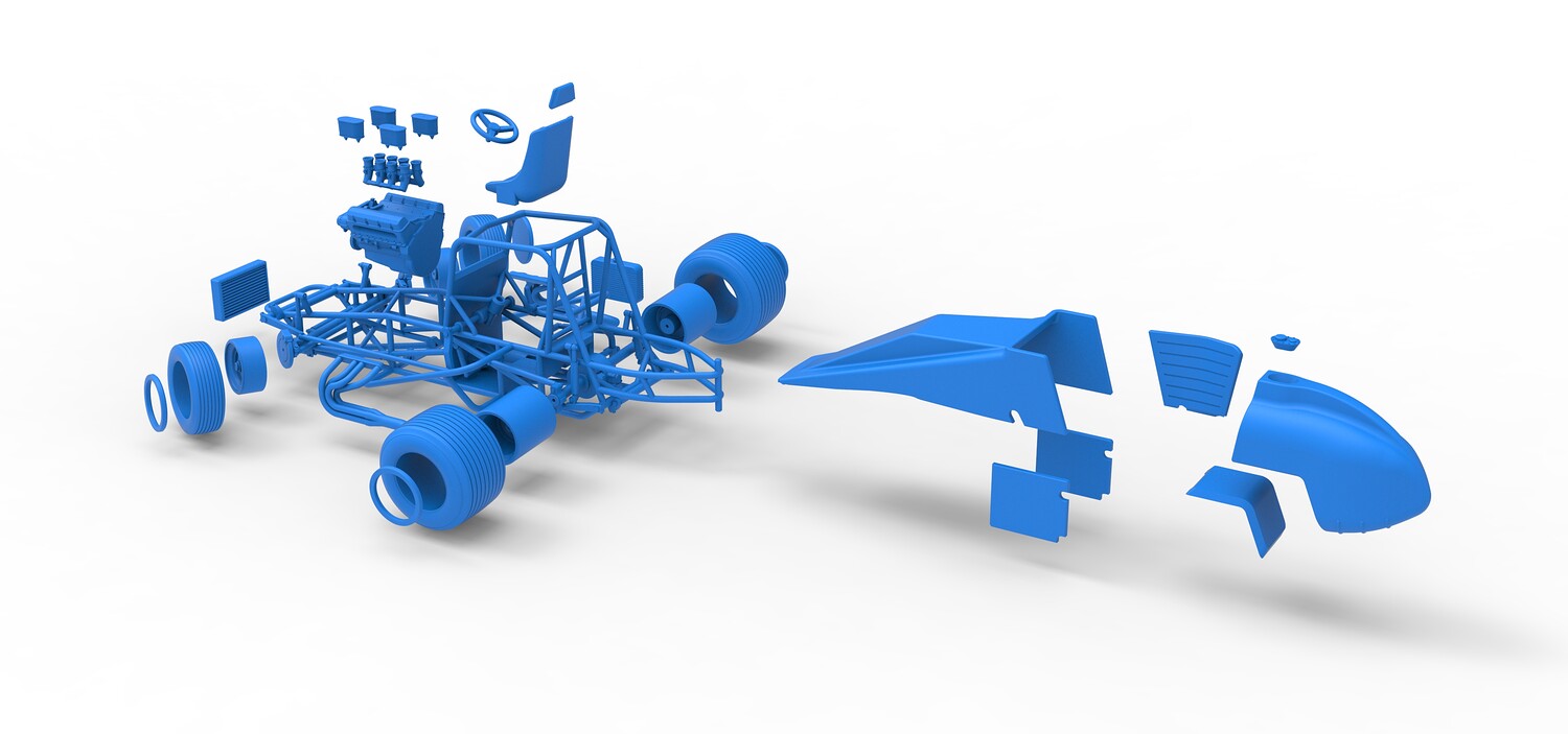 The model consists of parts: Air filters, Air intake, Beadlock rings, Engine, Frame, Front rims, Front tires, Fuel tank bottom plate, Fuel tank insert, Fuel tank, Headrest, Hood, Left exhaust, Oil tank, Radiator, Rear left tire, Rear right tire, Rear rims, Right exhaust, Right side shield, Rim covers, Seat, Side plates, Steering wheel.