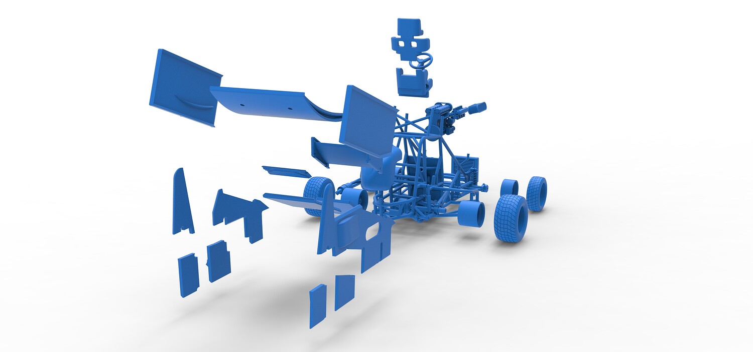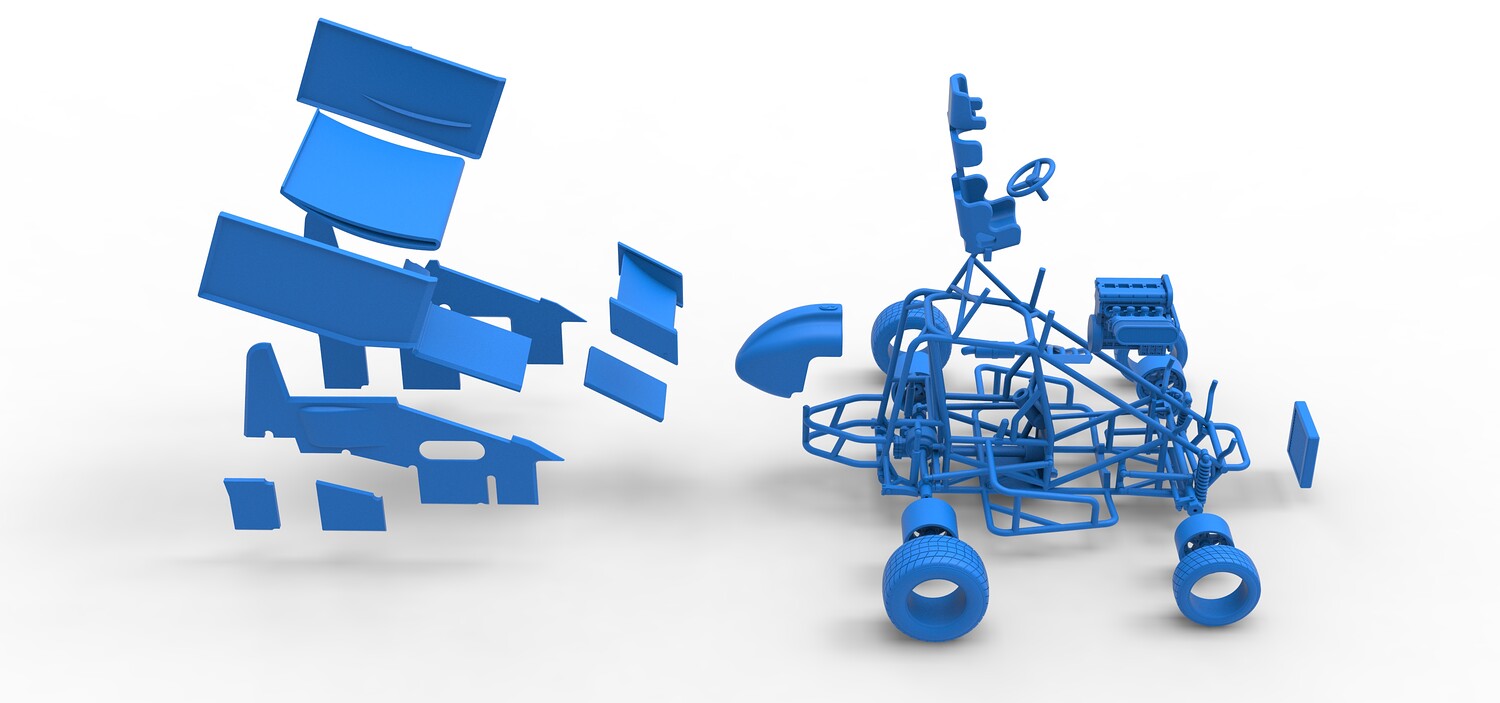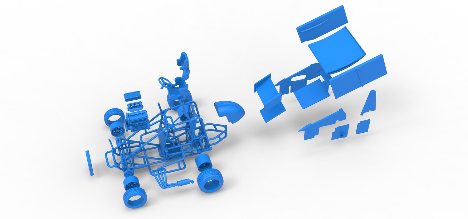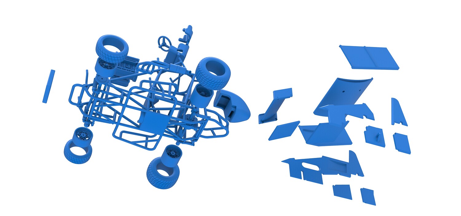 The model consists of parts: Air filter, Air intake, Engine, Exhaust, Frame, Front rims, Front tires, Front wing, Fuel tank, Hood, Nose, Radiator, Rear left tire, Rear right tire, Rear rims, Seat part 1,2, Shell left part 1-4, Shell right part 1-3, Steering wheel, Top wing central part, Top wing left part, Top wing right part, Visor.