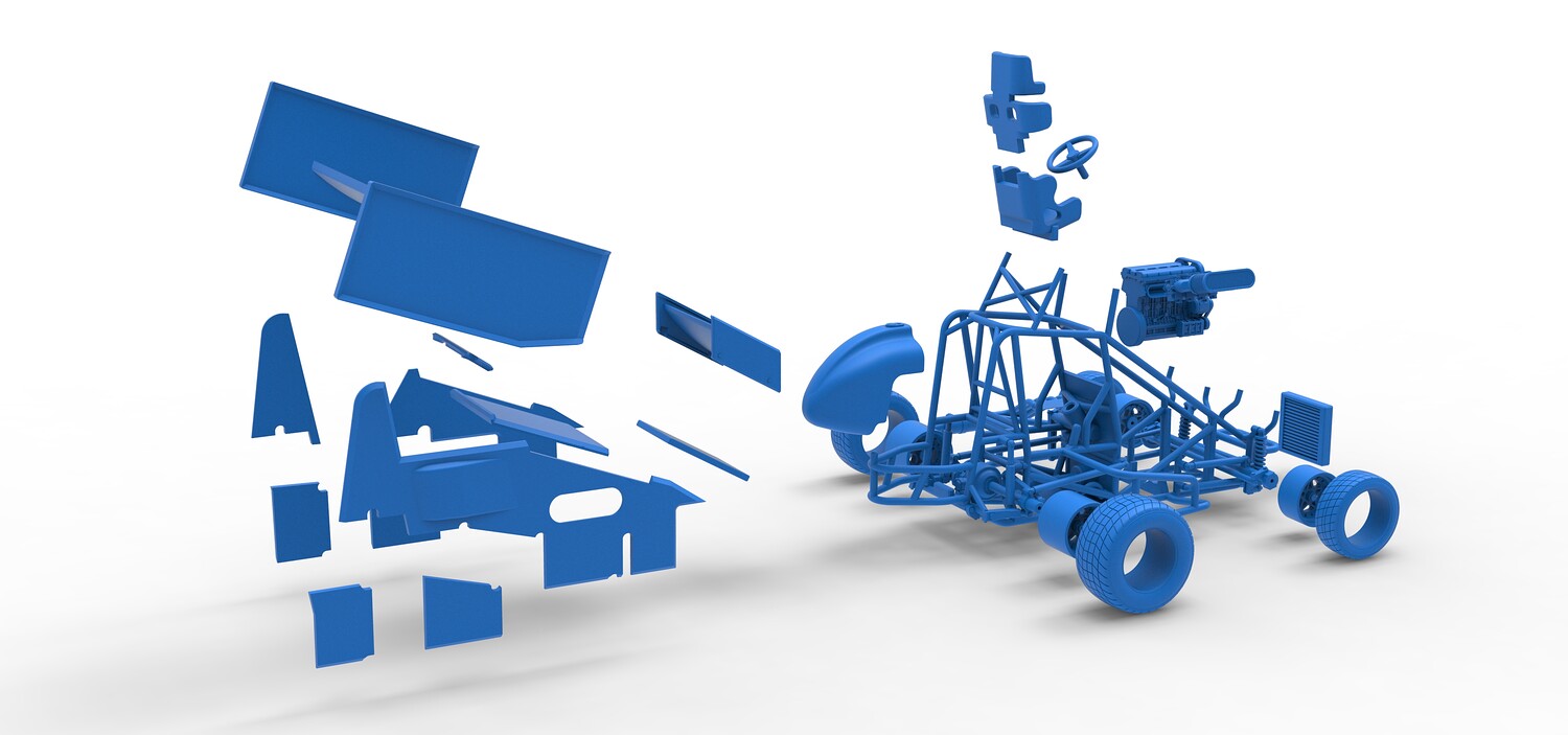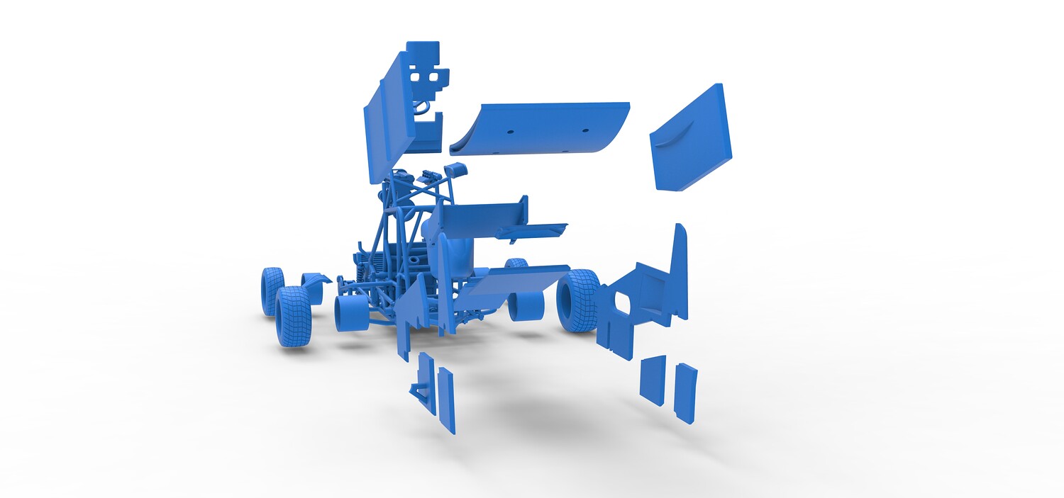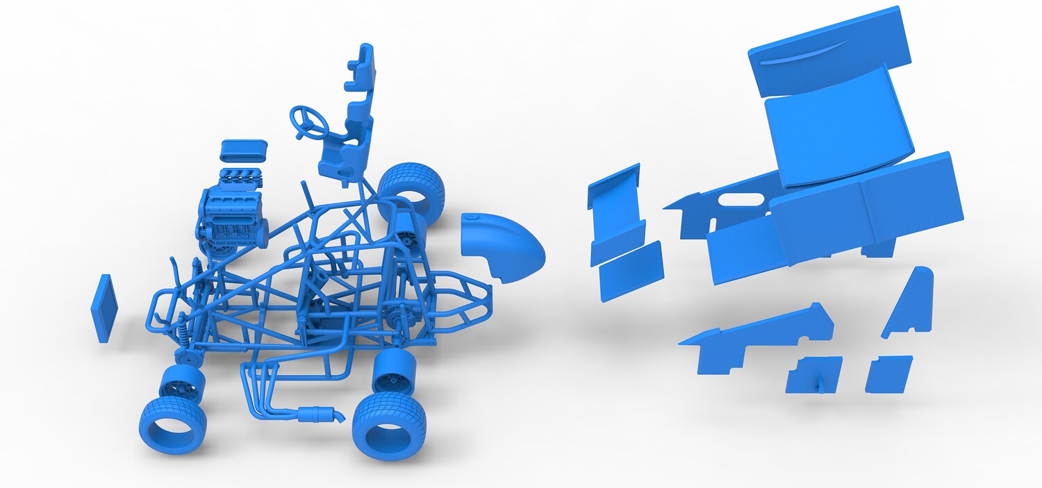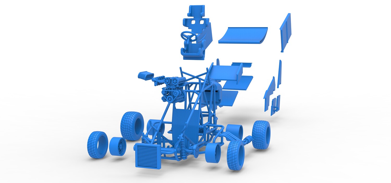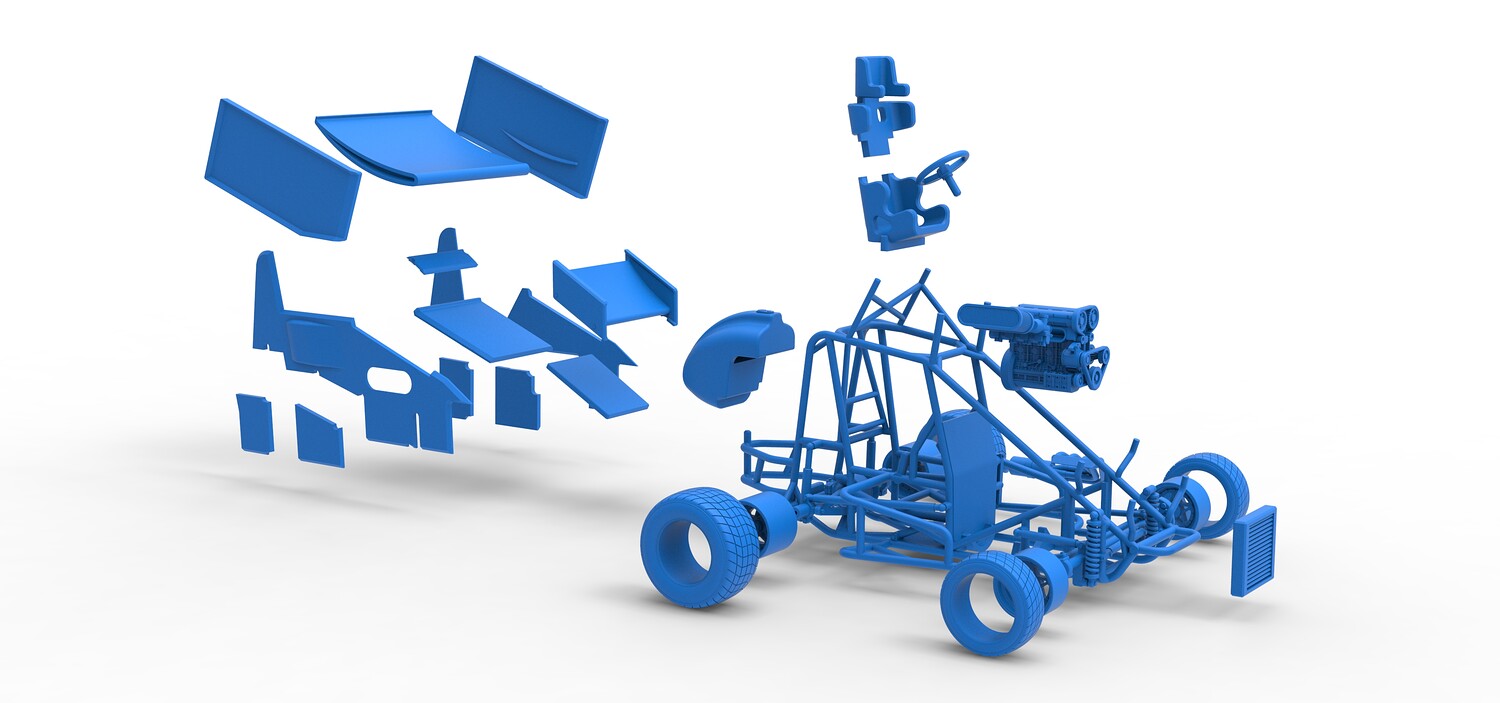 The model consists of parts: Air filter, Air intake, Engine, Exhaust, Frame, Front rims, Front tires, Front wing, Fuel tank, Hood, Nose, Radiator, Rear left tire, Rear right tire, Rear rims, Seat part 1,2, Shell left part 1-4, Shell right part 1-3, Steering wheel, Top wing central part, Top wing left part, Top wing right part, Visor.