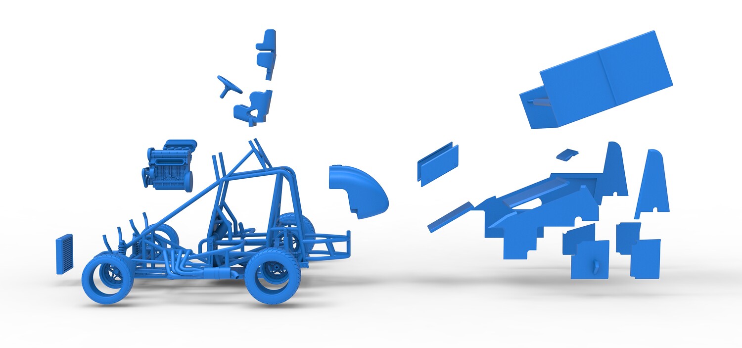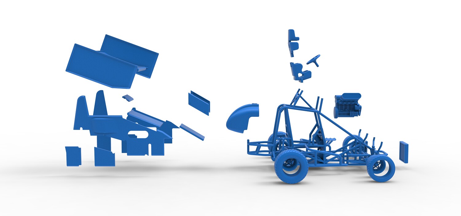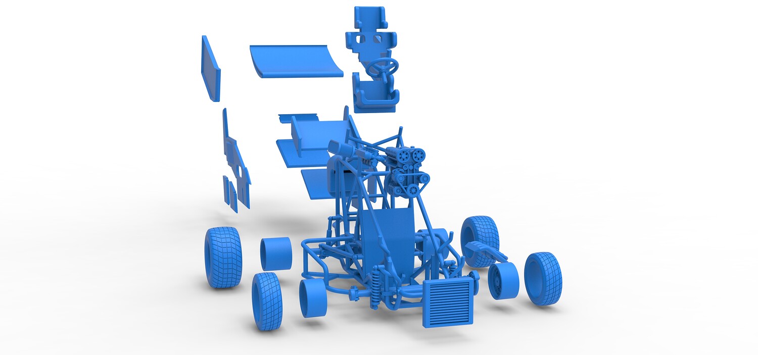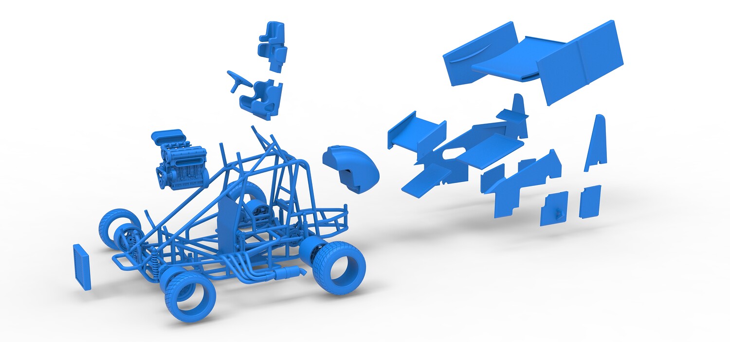 The model consists of parts: Air filter, Air intake, Engine, Exhaust, Frame, Front rims, Front tires, Front wing, Fuel tank, Hood, Nose, Radiator, Rear left tire, Rear right tire, Rear rims, Seat part 1,2, Shell left part 1-4, Shell right part 1-3, Steering wheel, Top wing central part, Top wing left part, Top wing right part, Visor.