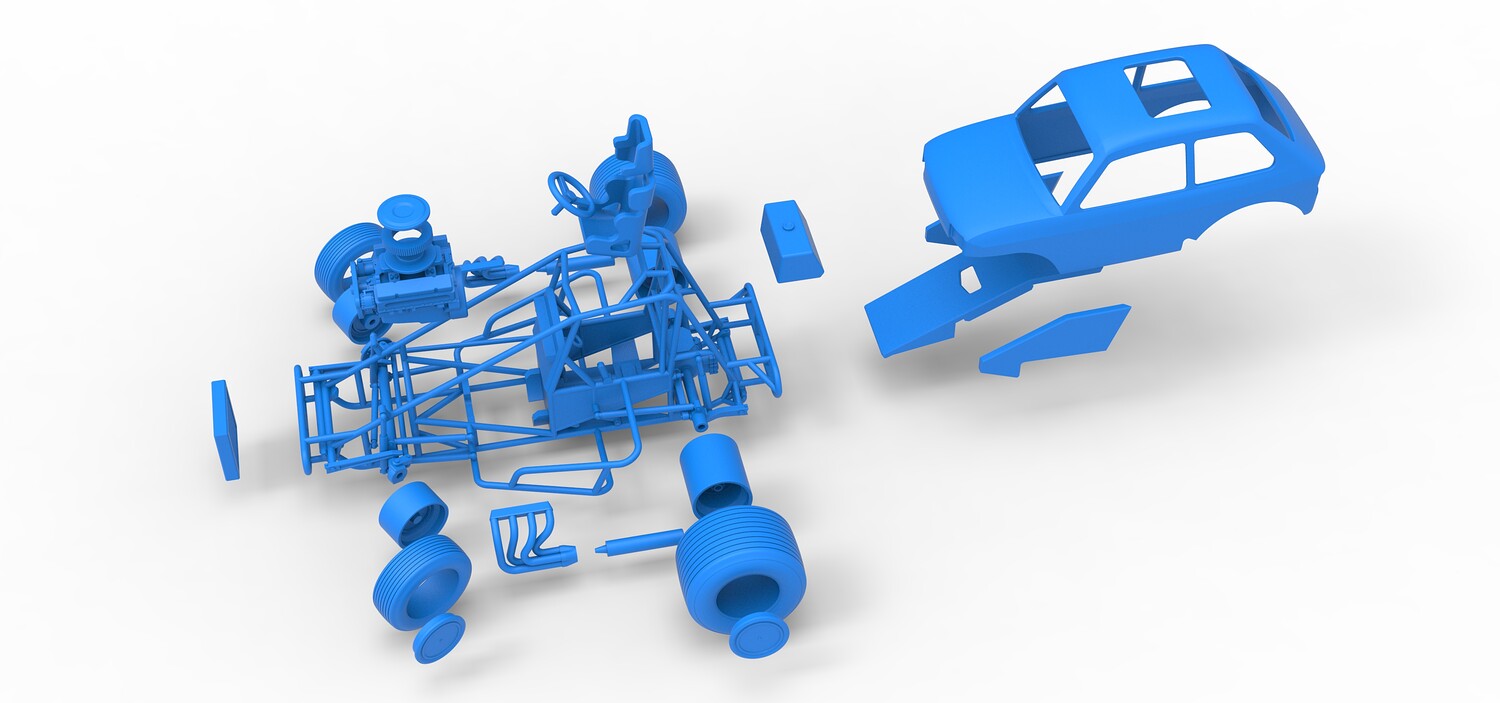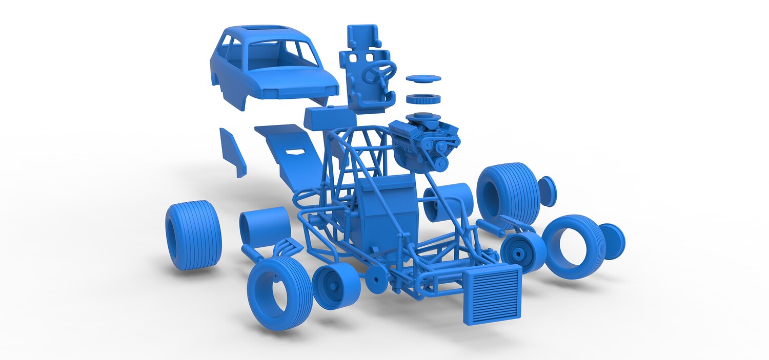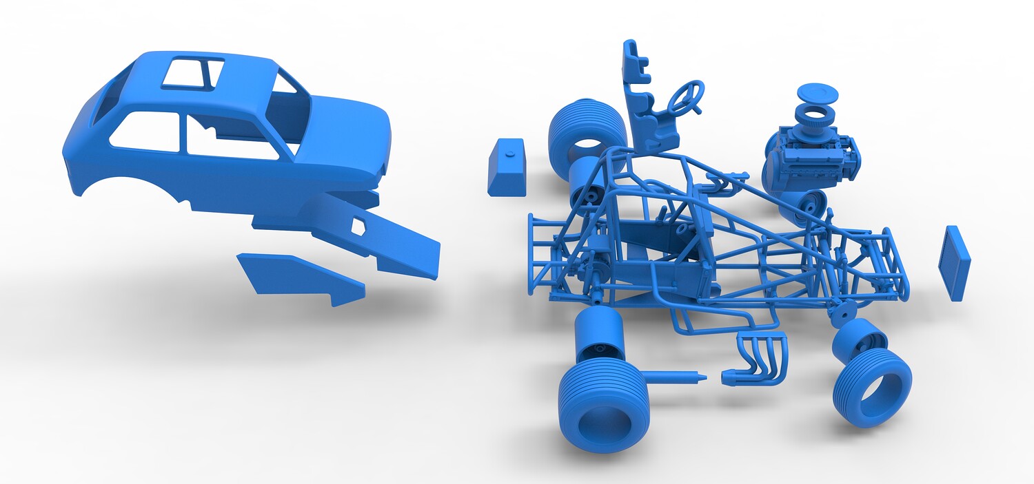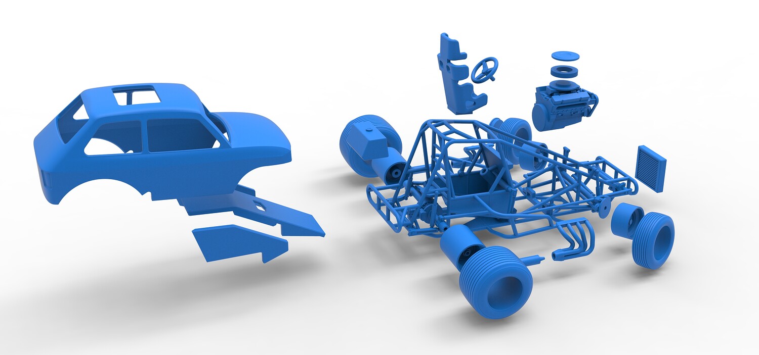 The model consists of parts: Air filter cap, Air filter, Body, Engine, Exhaust tubes, Front rims, Front tires, Hood central part, Hood left part, Hood right part, Left exhaust pipes, Radiator, Rear left tire, Rear right tire, Rear rims, Right exhaust pipes, Rim caps, Seat, Shell, Steering wheel, Tank.