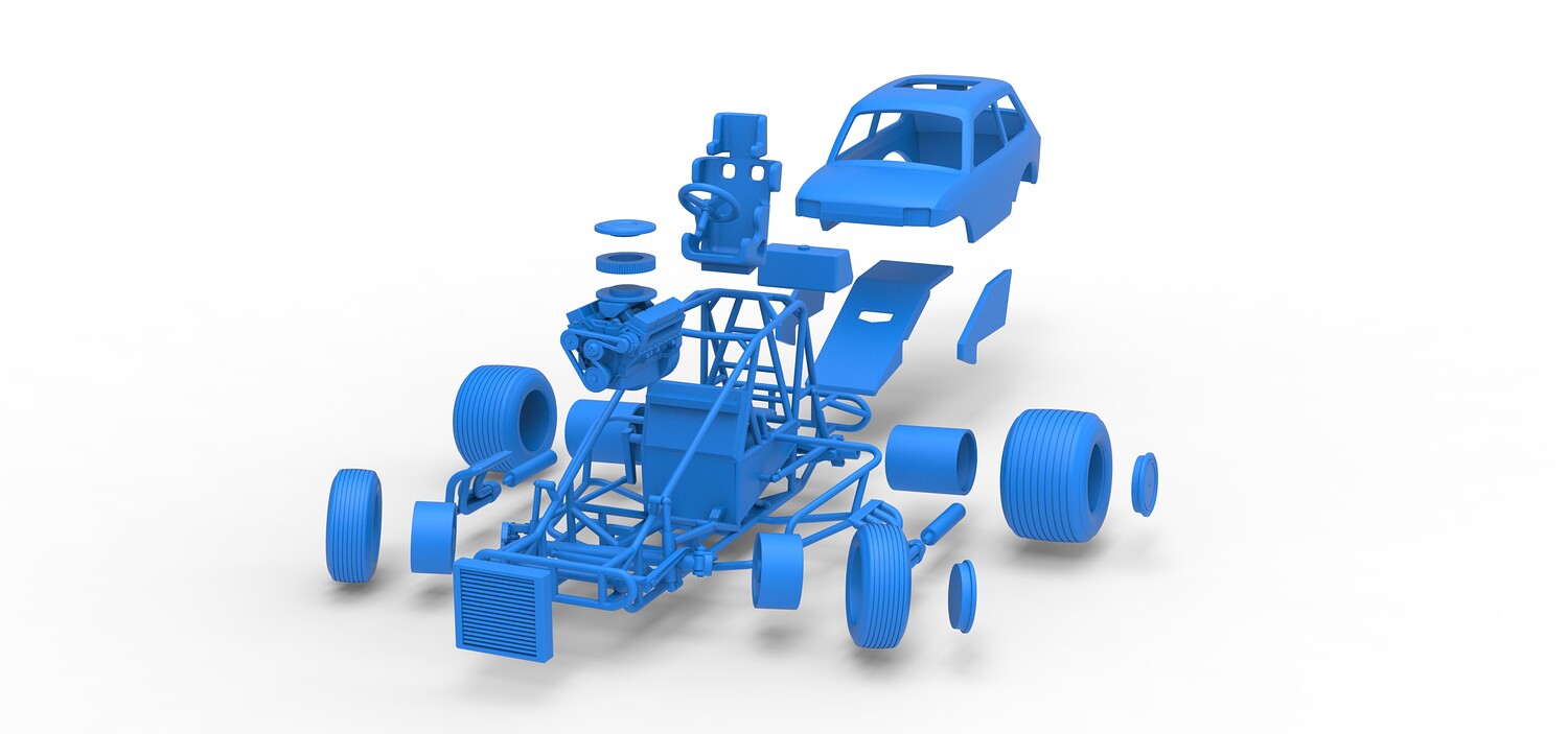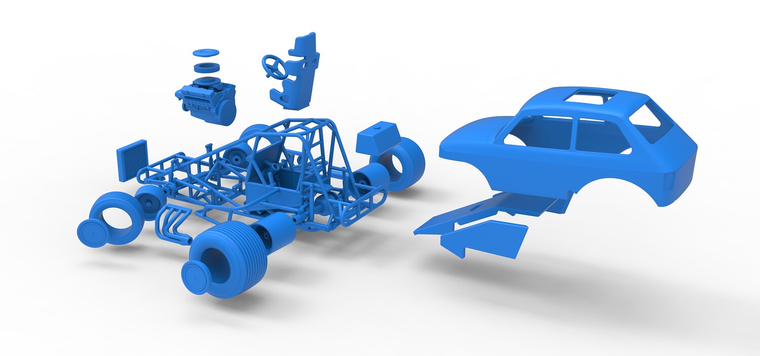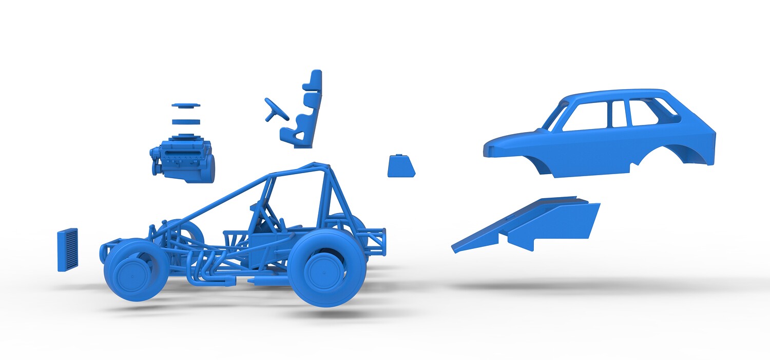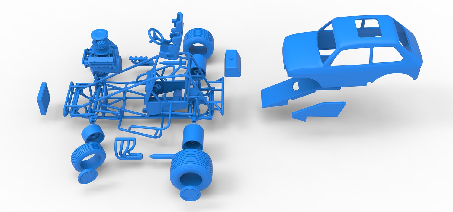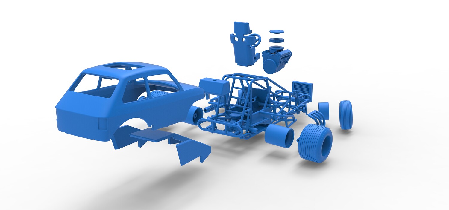 The model consists of parts: Air filter cap, Air filter, Body, Engine, Exhaust tubes, Front rims, Front tires, Hood central part, Hood left part, Hood right part, Left exhaust pipes, Radiator, Rear left tire, Rear right tire, Rear rims, Right exhaust pipes, Rim caps, Seat, Shell, Steering wheel, Tank.