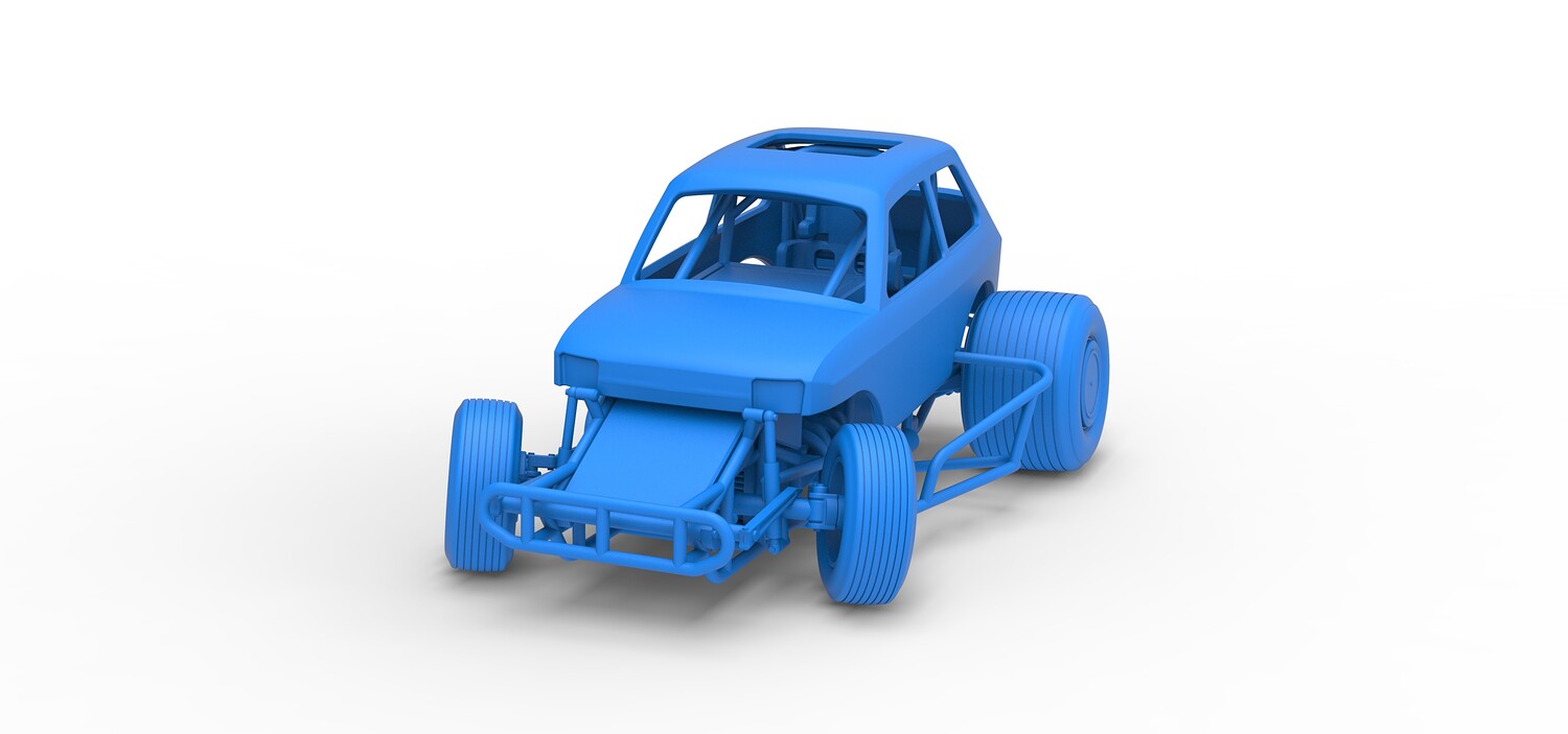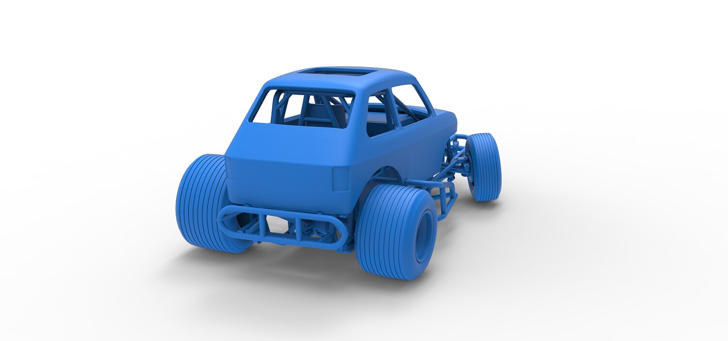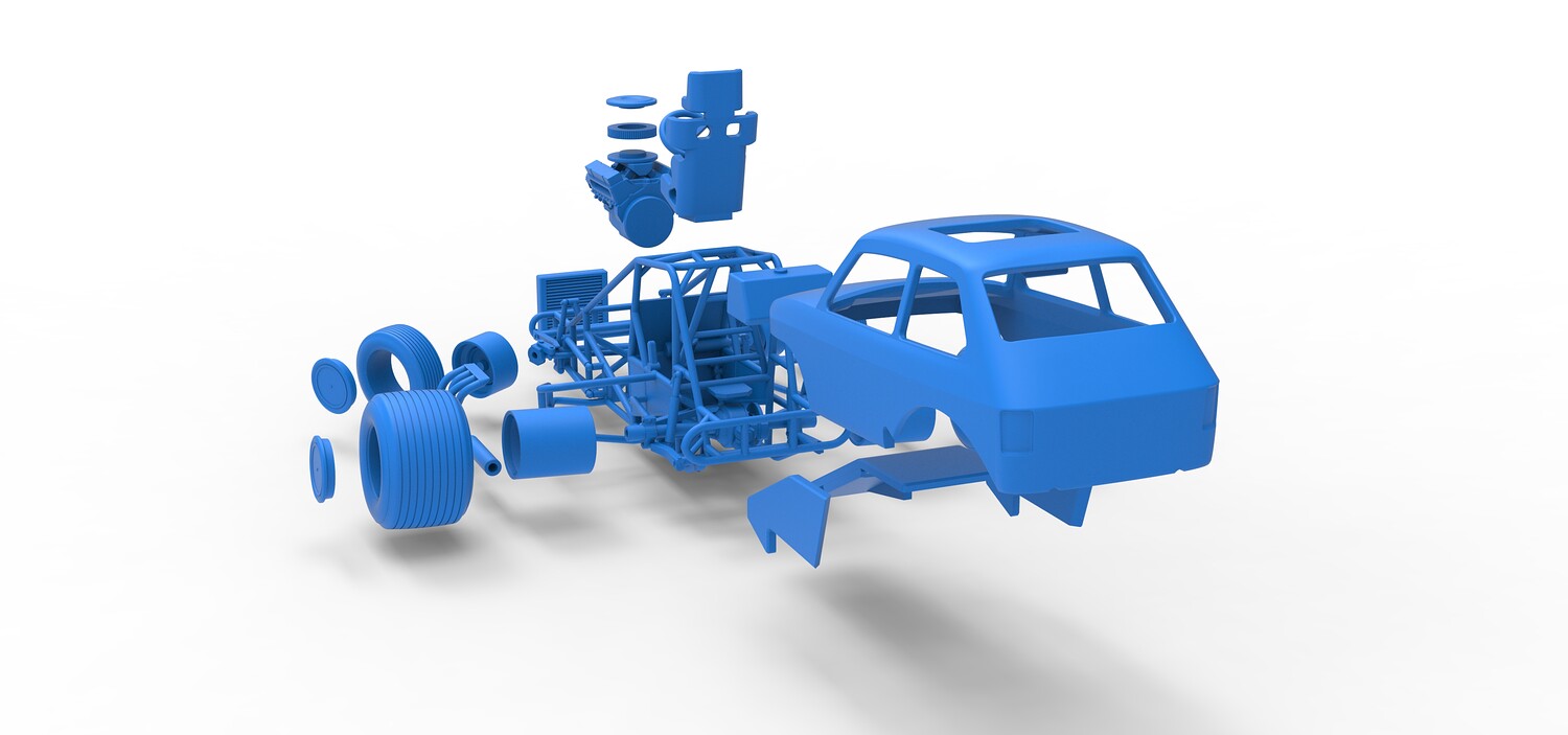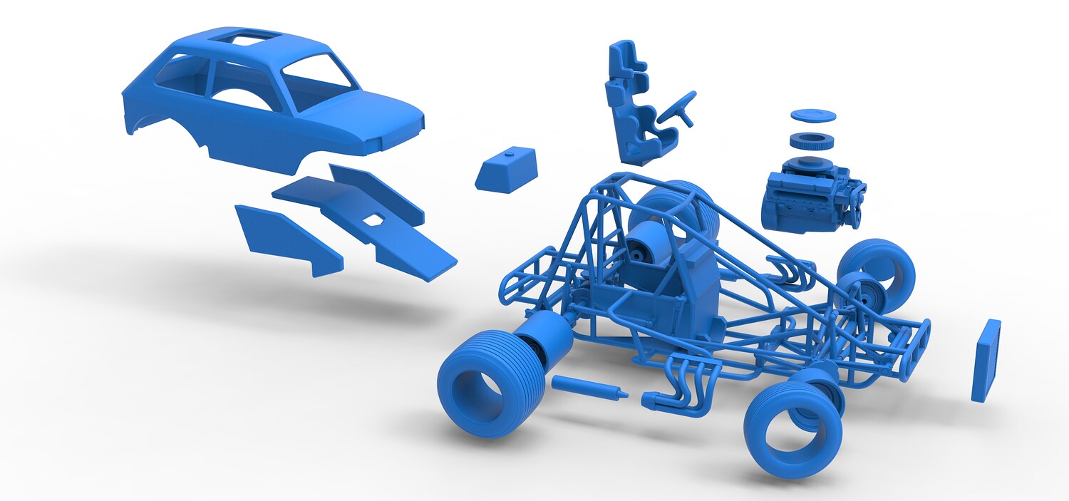 The model consists of parts: Air filter cap, Air filter, Body, Engine, Exhaust tubes, Front rims, Front tires, Hood central part, Hood left part, Hood right part, Left exhaust pipes, Radiator, Rear left tire, Rear right tire, Rear rims, Right exhaust pipes, Rim caps, Seat, Shell, Steering wheel, Tank.