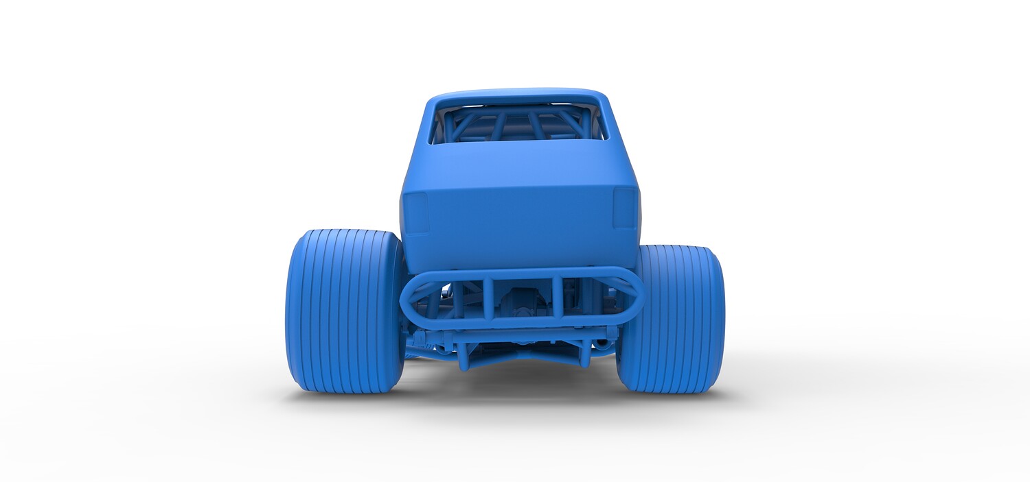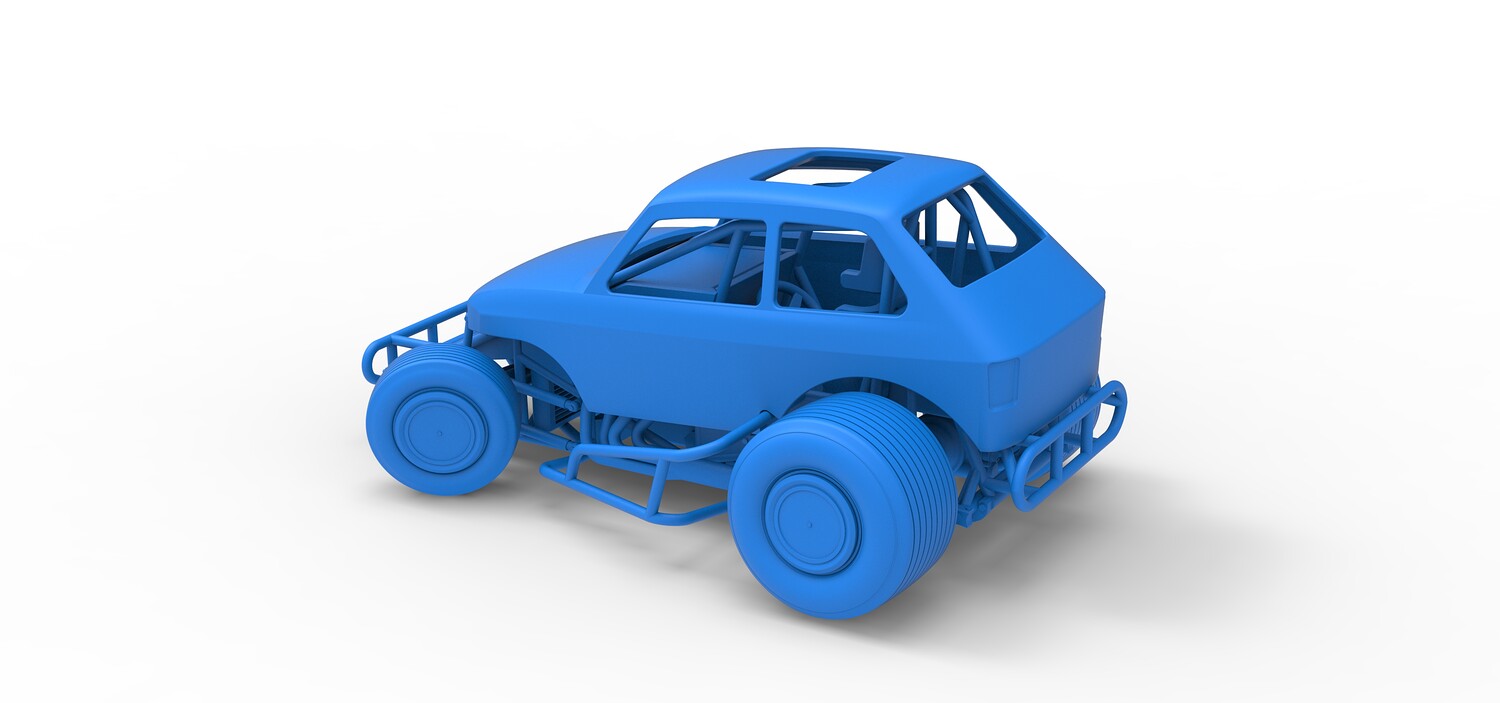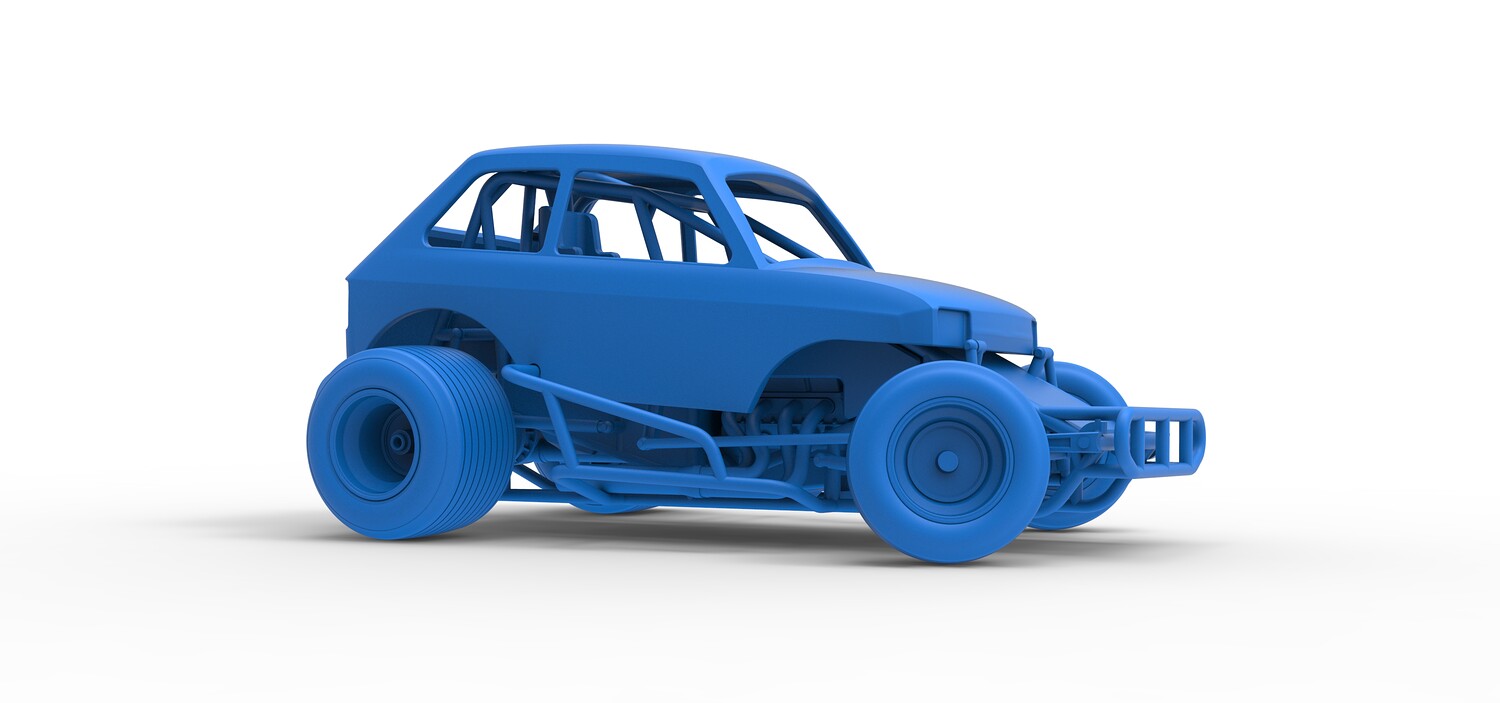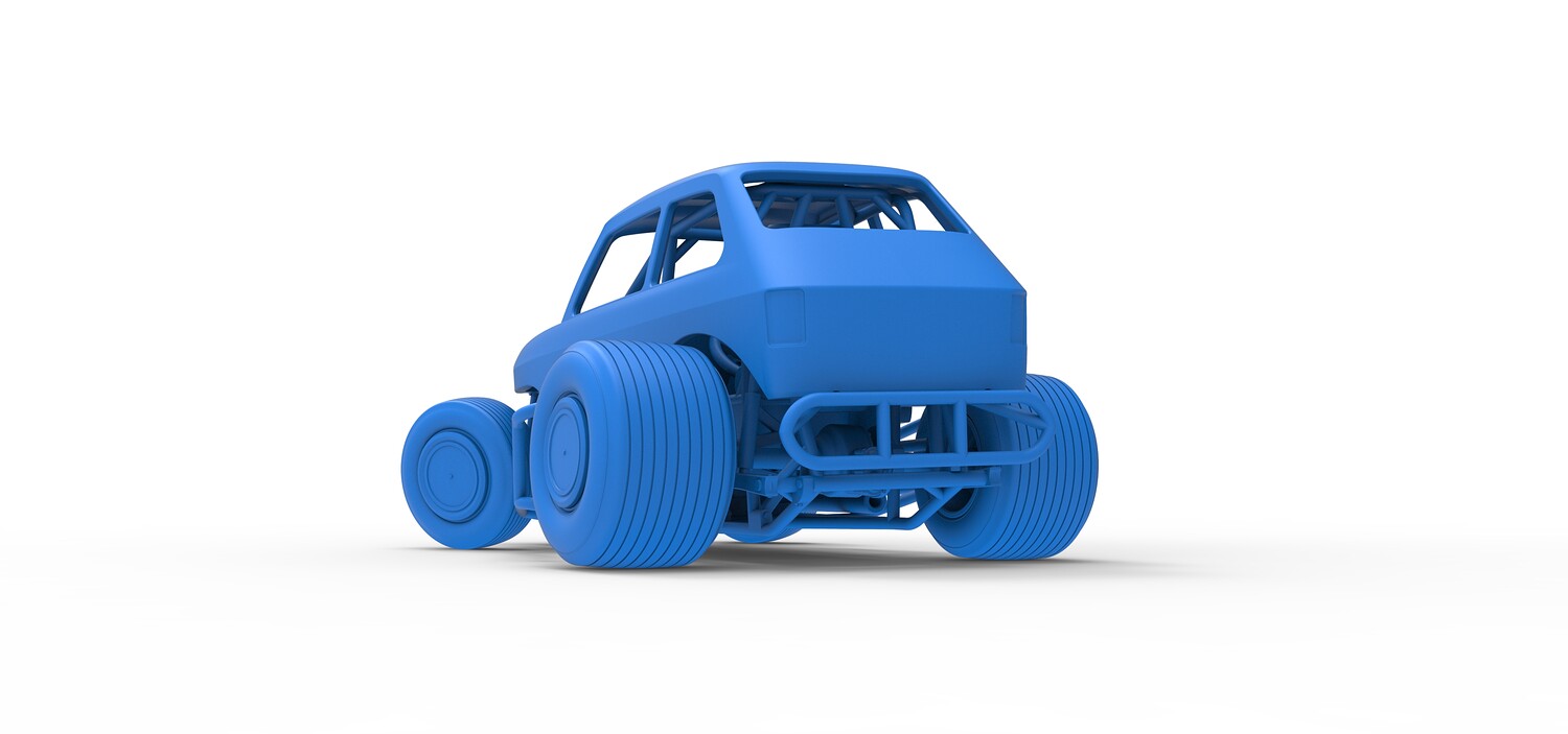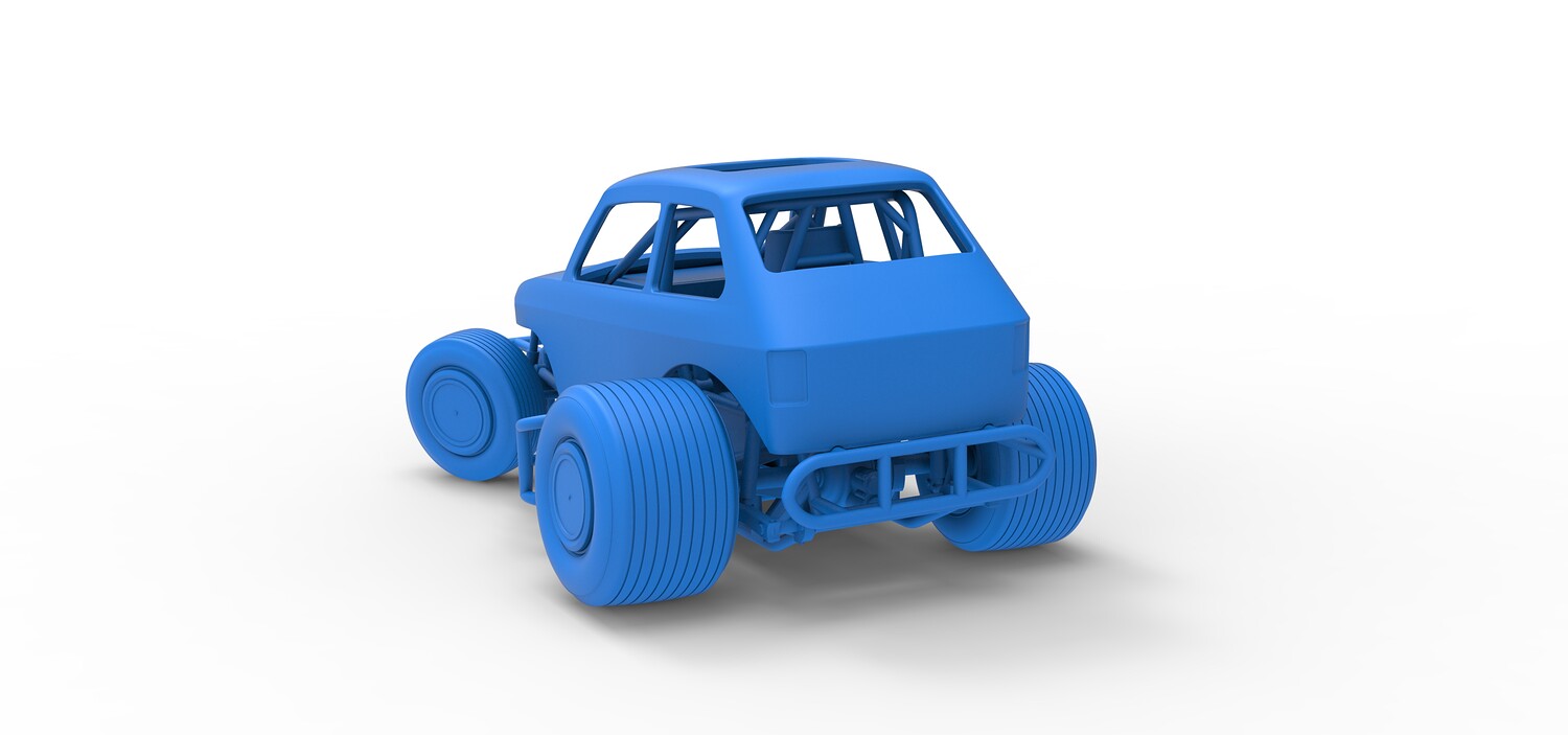 The model consists of parts: Air filter cap, Air filter, Body, Engine, Exhaust tubes, Front rims, Front tires, Hood central part, Hood left part, Hood right part, Left exhaust pipes, Radiator, Rear left tire, Rear right tire, Rear rims, Right exhaust pipes, Rim caps, Seat, Shell, Steering wheel, Tank.