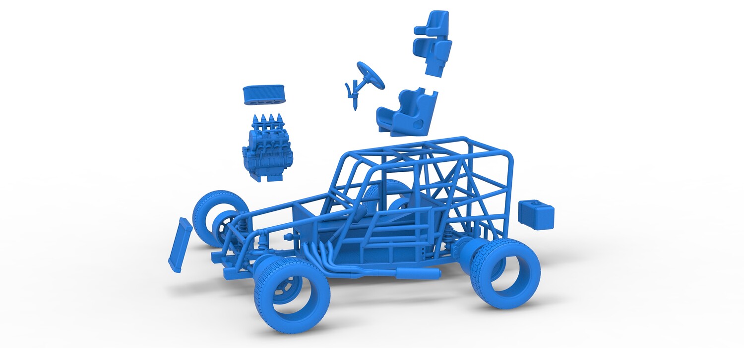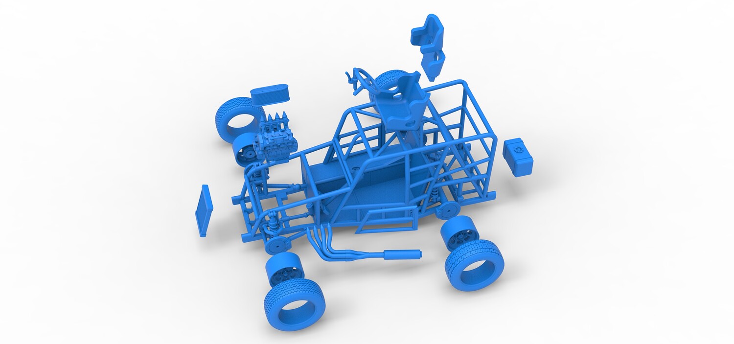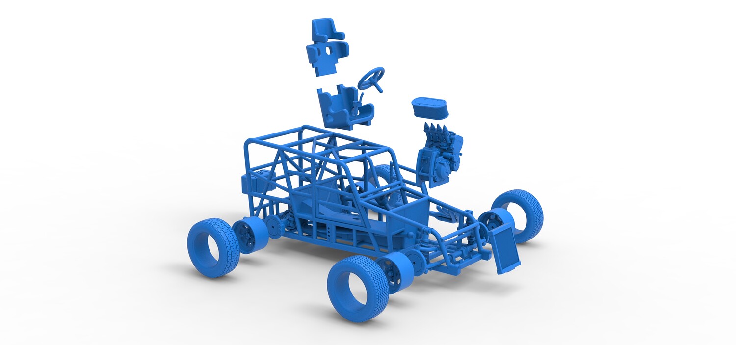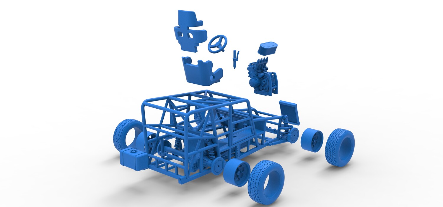 The model consists of parts: Air filter, Engine, Exhaust, Frame door, Frame, Front rims, Front tires, Radiator, Rear rims, Rear tires, Seat part 1,2, Shifter, Steering wheel, Tank.