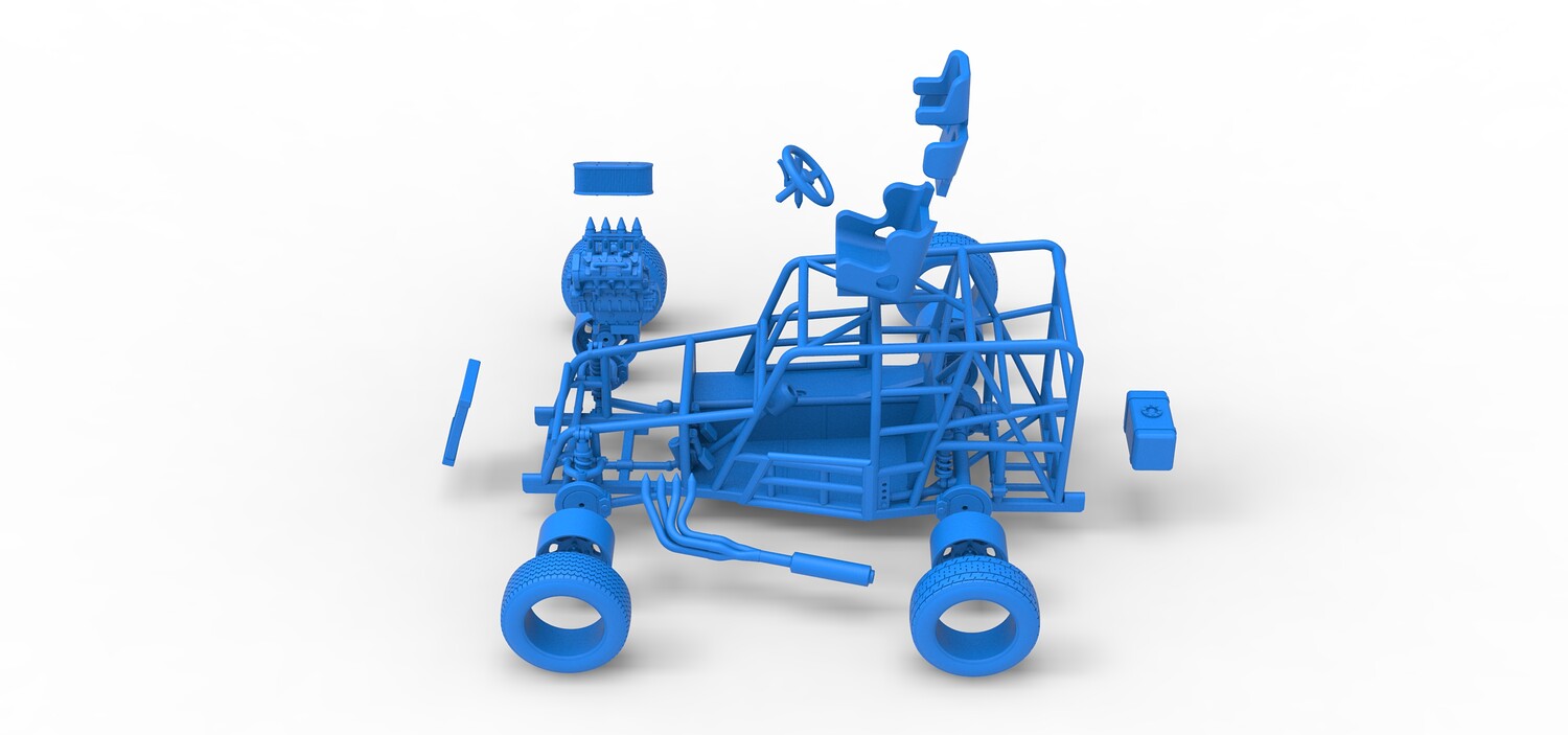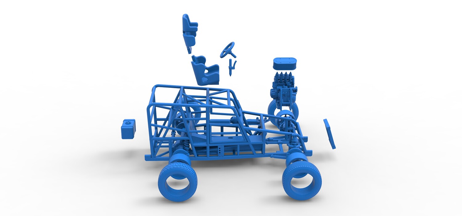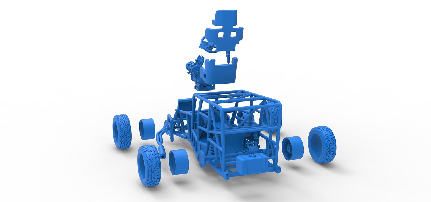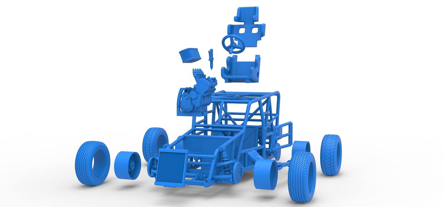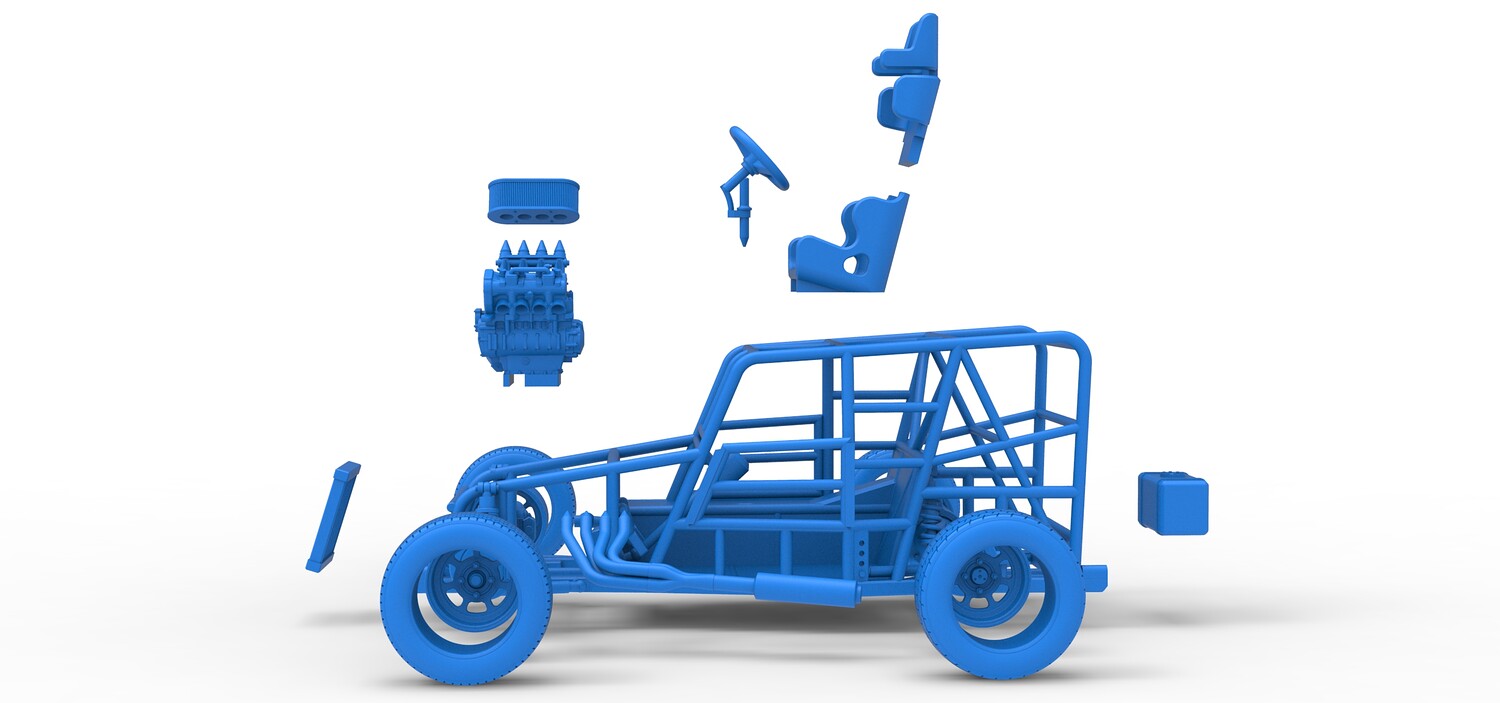 The model consists of parts: Air filter, Engine, Exhaust, Frame door, Frame, Front rims, Front tires, Radiator, Rear rims, Rear tires, Seat part 1,2, Shifter, Steering wheel, Tank.