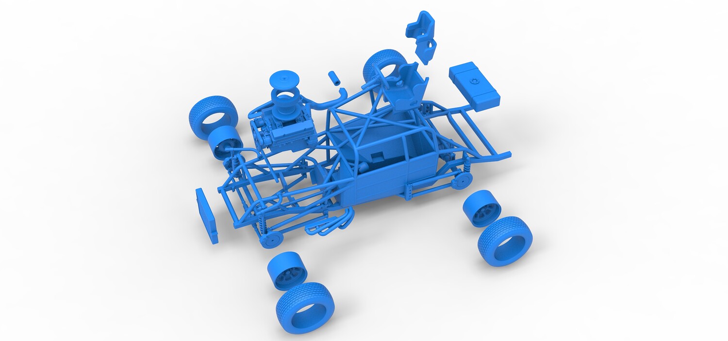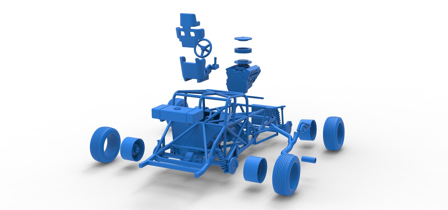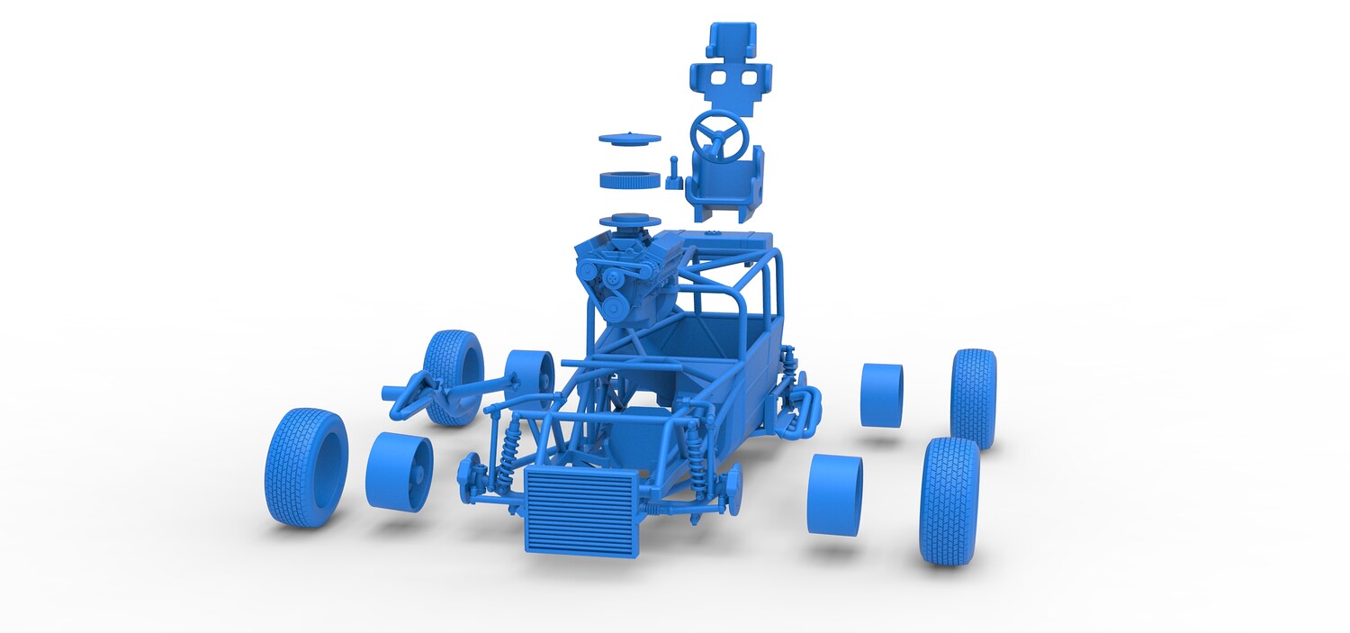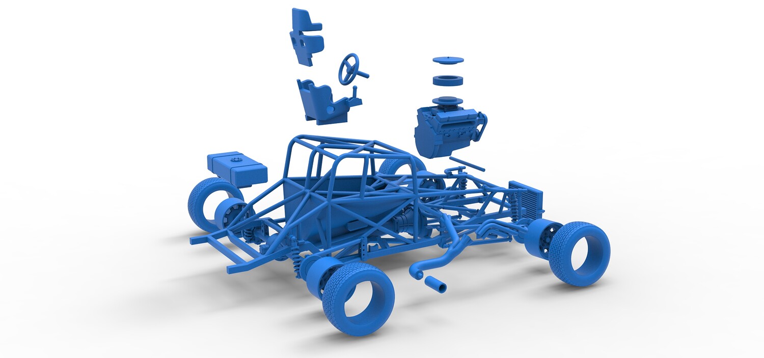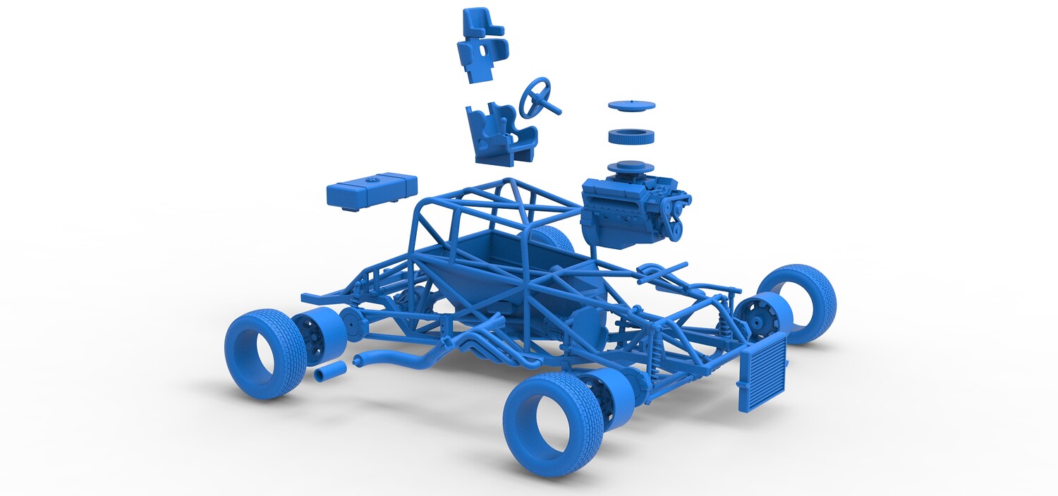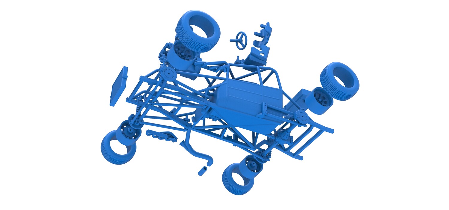 The model consists of parts: Air filter cap, Air filter, Engine, Exhaust pipe part 1,2, Frame, Insert bar, Left exhaust, Radiator, Right exhaust, Rims, Seat part 1,2, Shifter, Steering wheel, Tank, Tires.