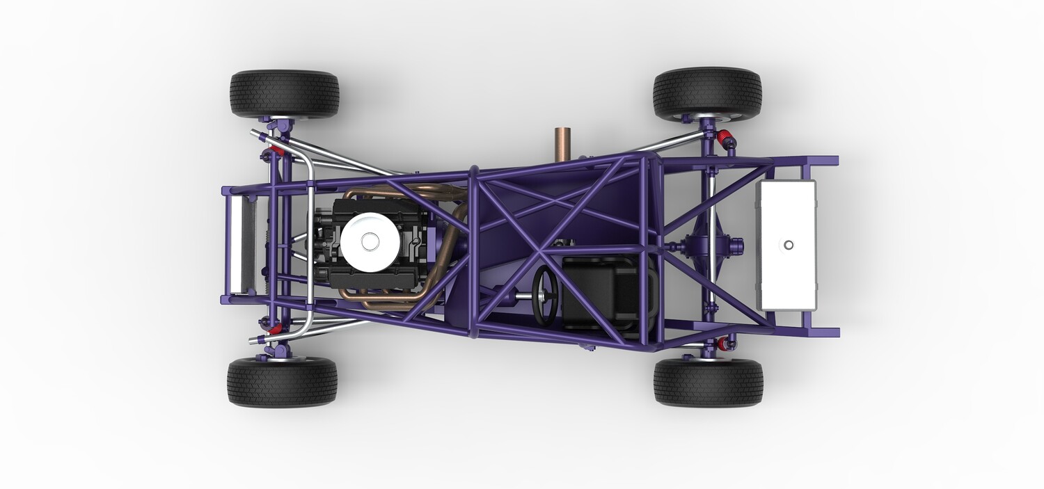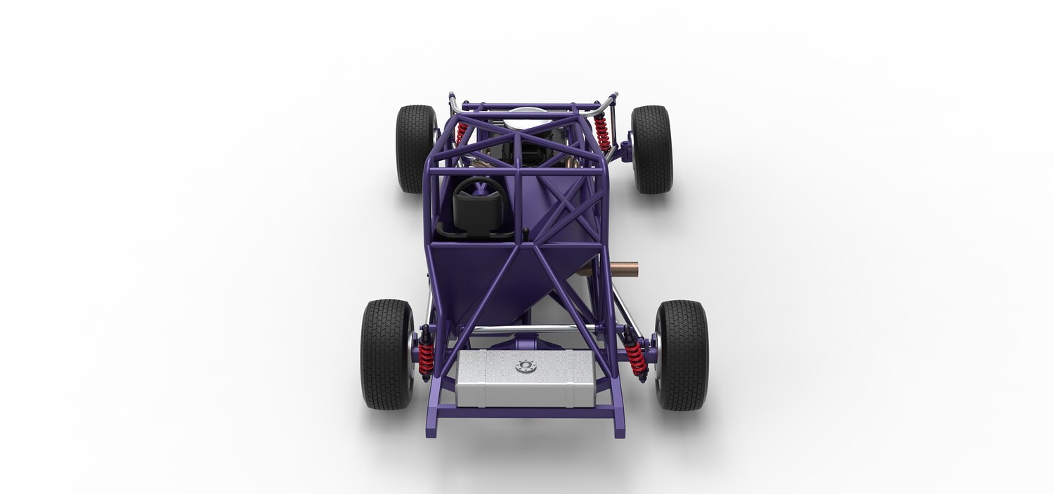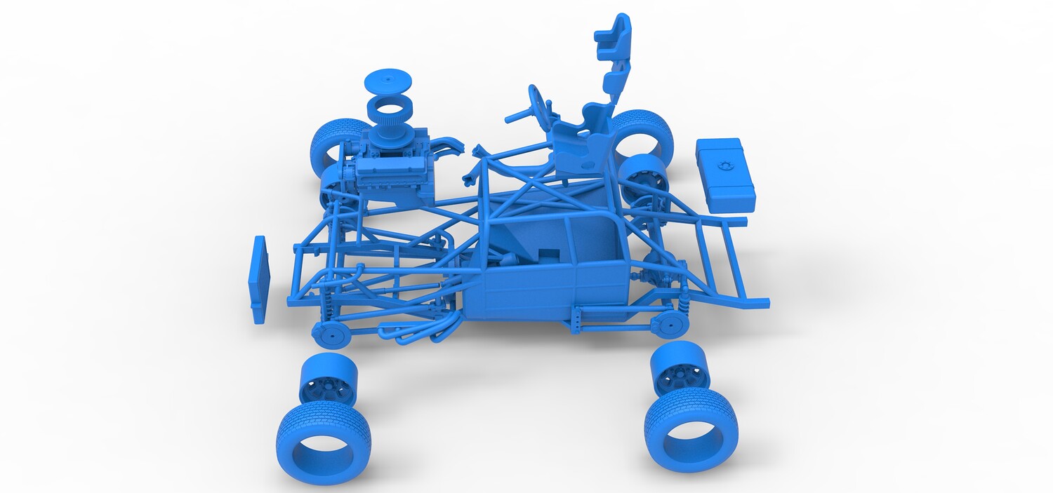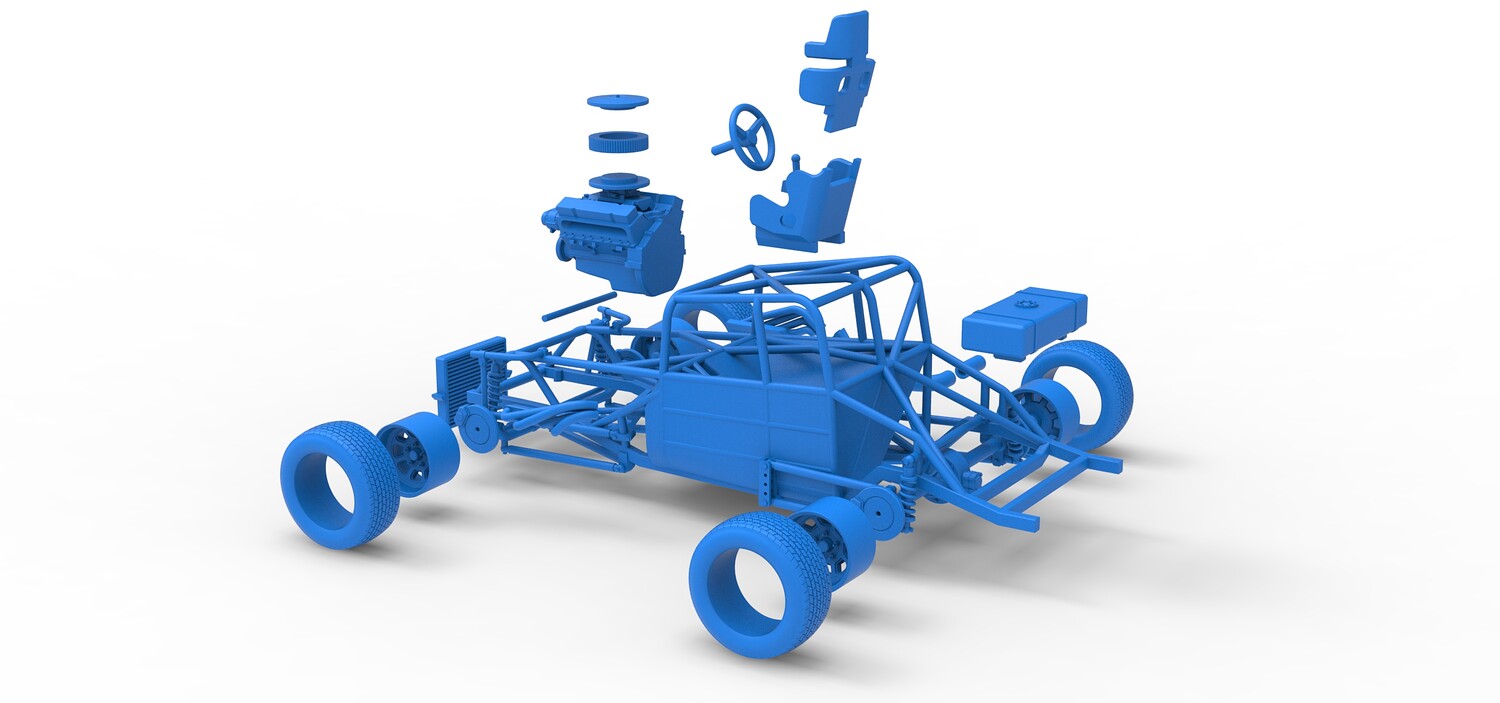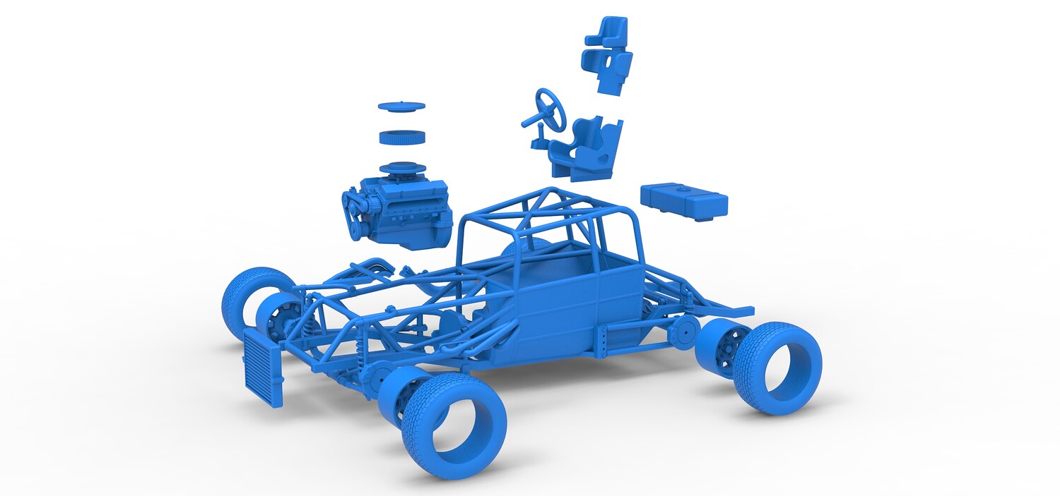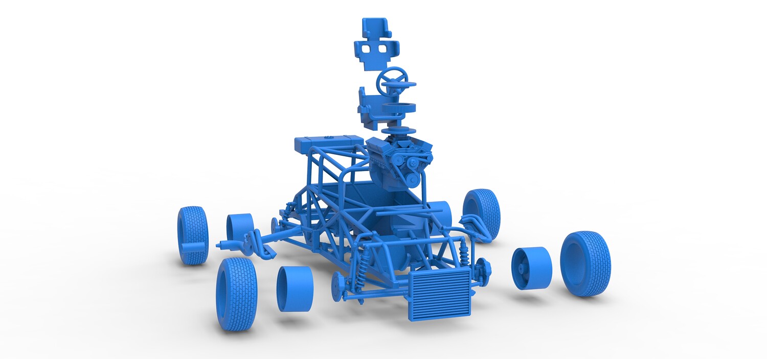 The model consists of parts: Air filter cap, Air filter, Engine, Exhaust pipe part 1,2, Frame, Insert bar, Left exhaust, Radiator, Right exhaust, Rims, Seat part 1,2, Shifter, Steering wheel, Tank, Tires.