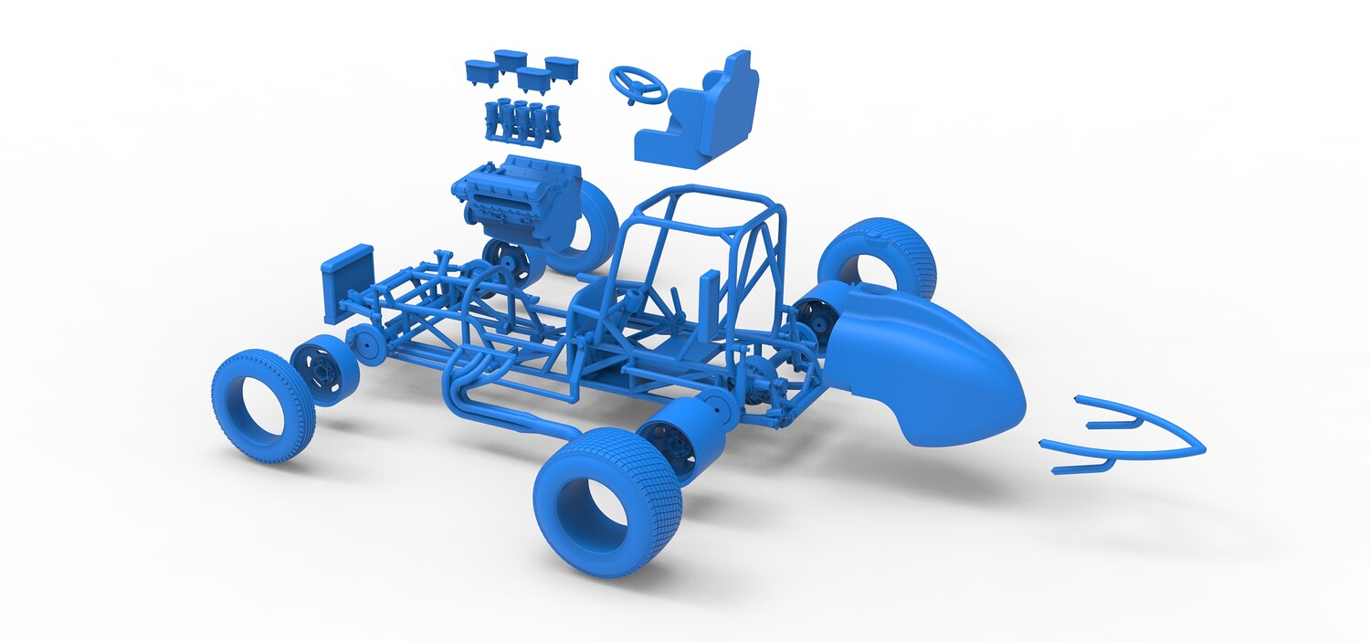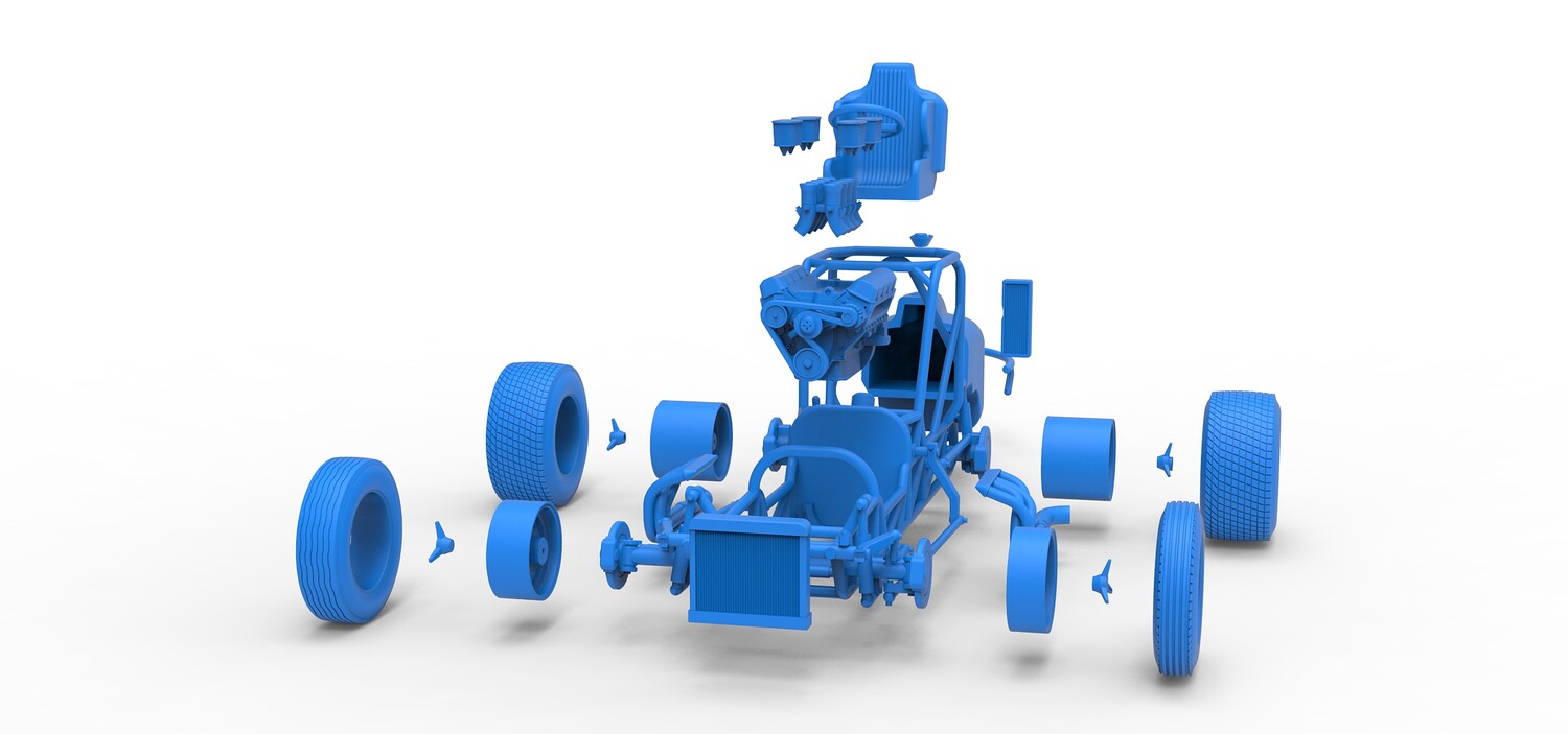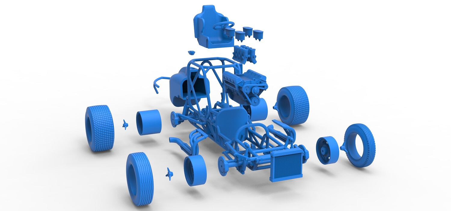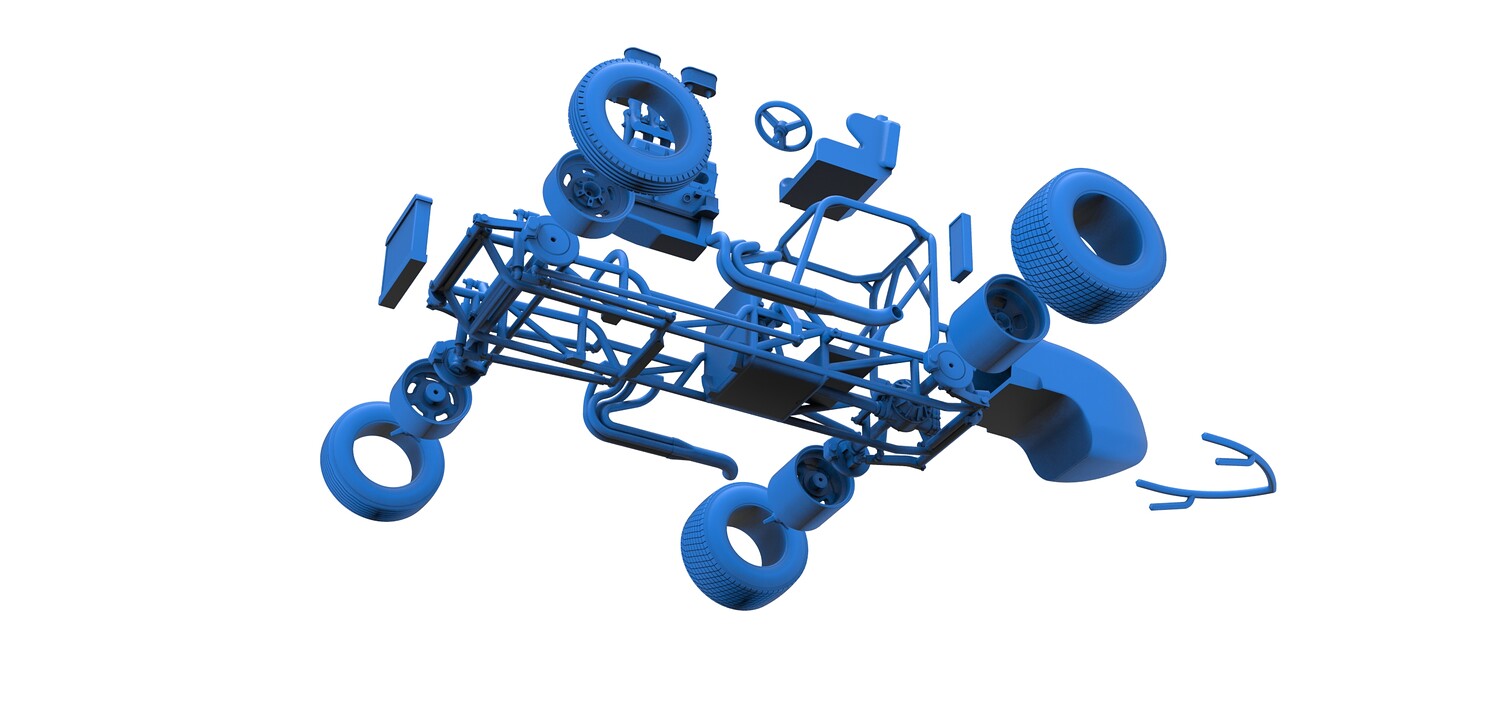 The model consists of parts: Air filters, Air intake, Engine, Frame, Front Centerlock nuts, Front left rim, Front left tire, Front right rim, Front right tire, Fuel cap, Left exhaust, Radiator, Rear bumper, Rear Centerlock nuts, Rear left tire, Rear rims, Rear right tire, Right exhaust, Seat, Side radiator, Steering wheel, Tank.