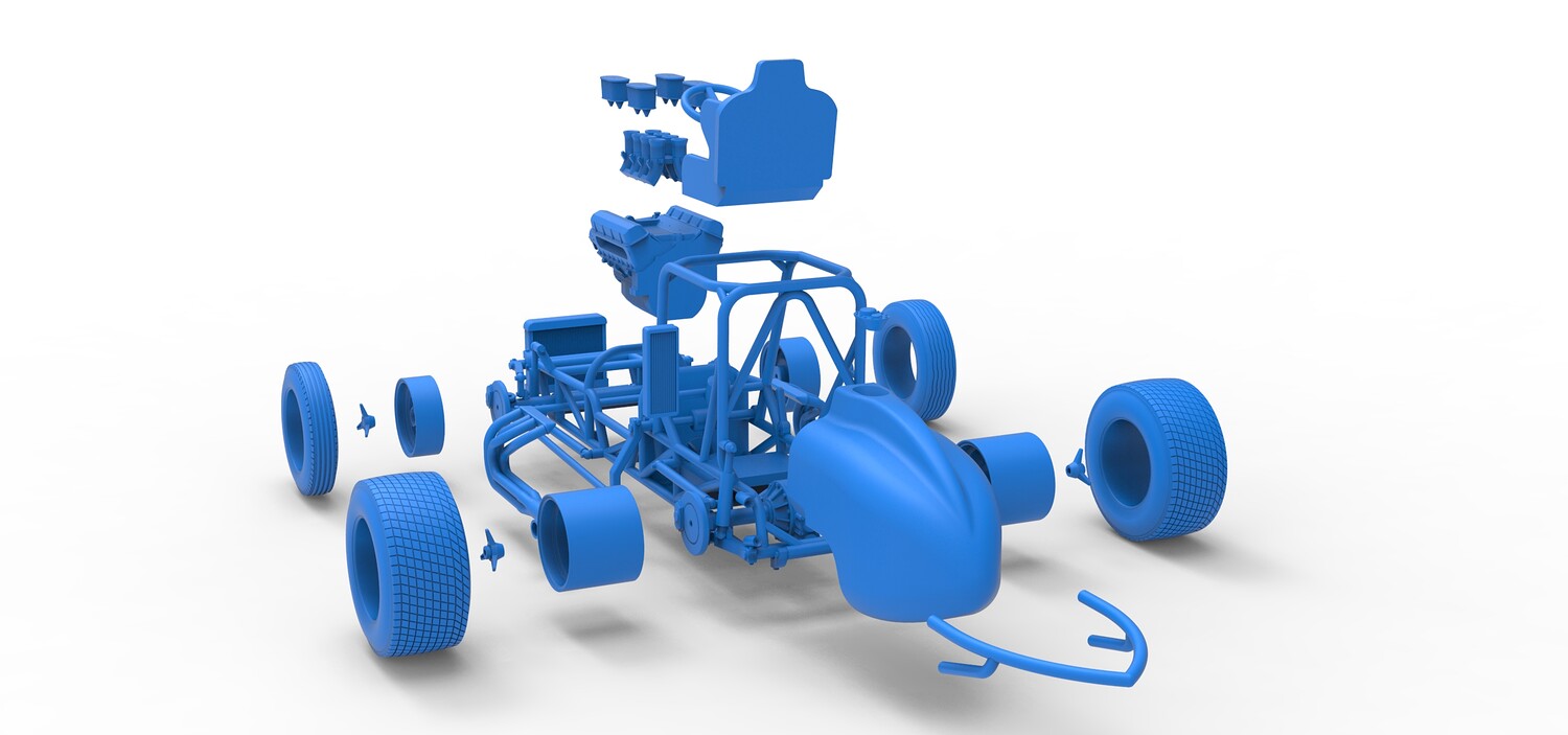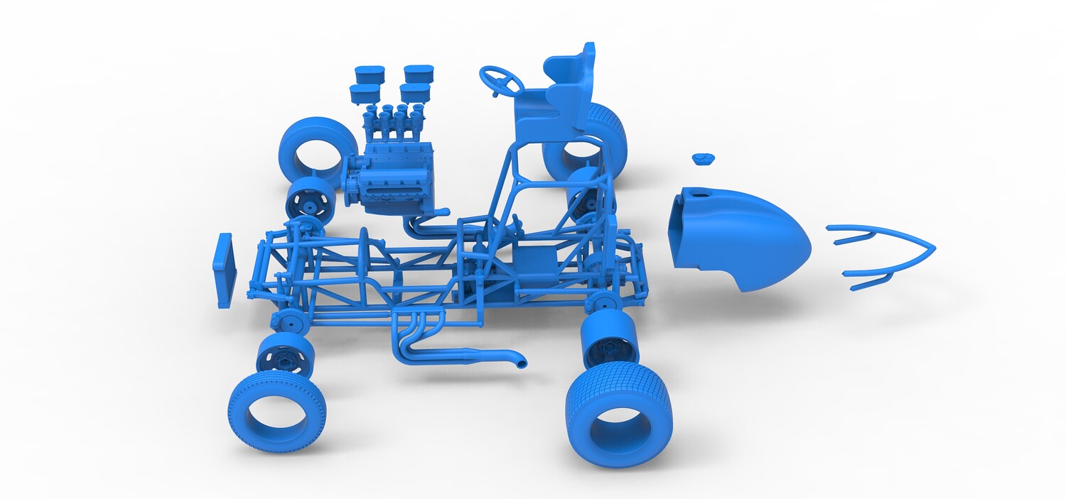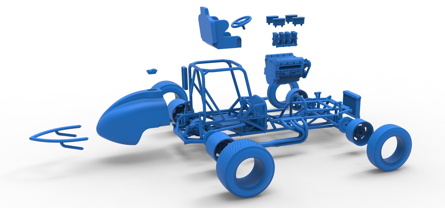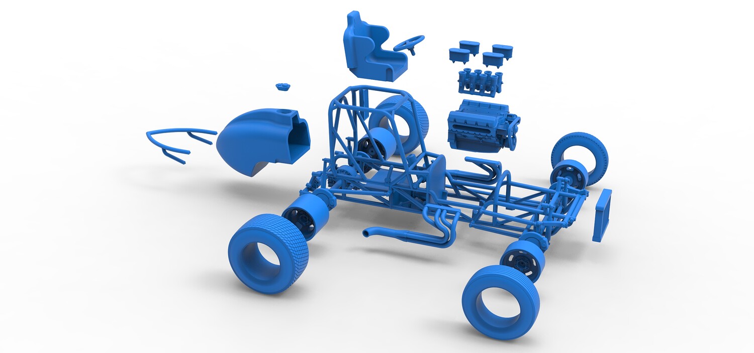 The model consists of parts: Air filters, Air intake, Engine, Frame, Front Centerlock nuts, Front left rim, Front left tire, Front right rim, Front right tire, Fuel cap, Left exhaust, Radiator, Rear bumper, Rear Centerlock nuts, Rear left tire, Rear rims, Rear right tire, Right exhaust, Seat, Side radiator, Steering wheel, Tank.