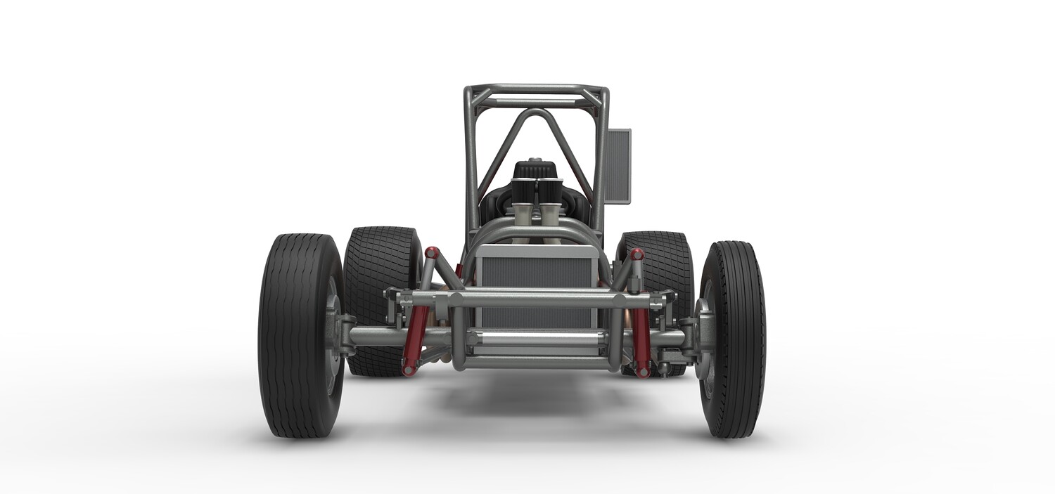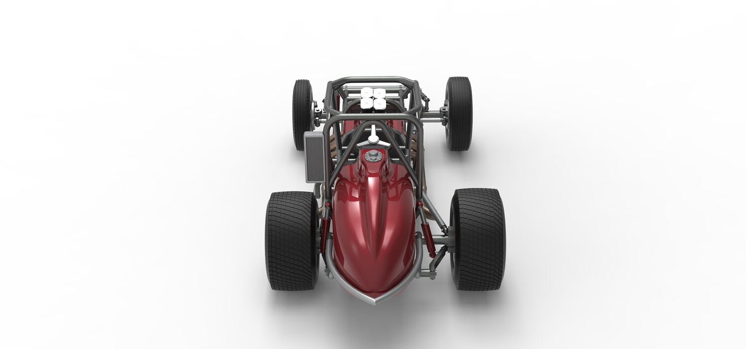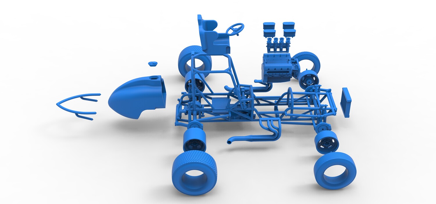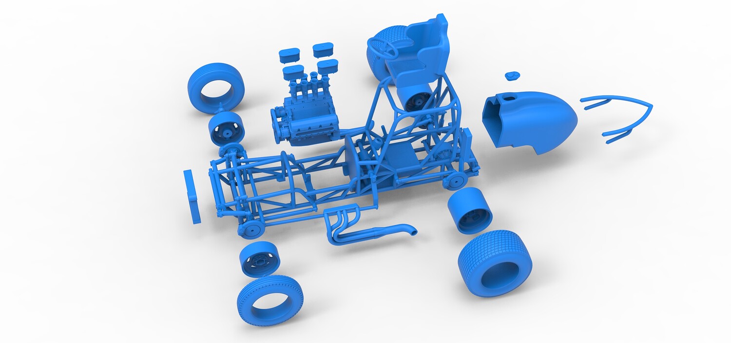 The model consists of parts: Air filters, Air intake, Engine, Frame, Front Centerlock nuts, Front left rim, Front left tire, Front right rim, Front right tire, Fuel cap, Left exhaust, Radiator, Rear bumper, Rear Centerlock nuts, Rear left tire, Rear rims, Rear right tire, Right exhaust, Seat, Side radiator, Steering wheel, Tank.