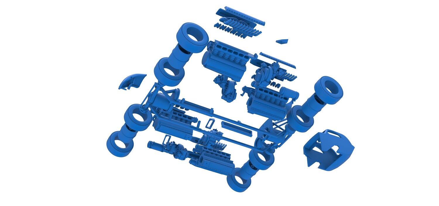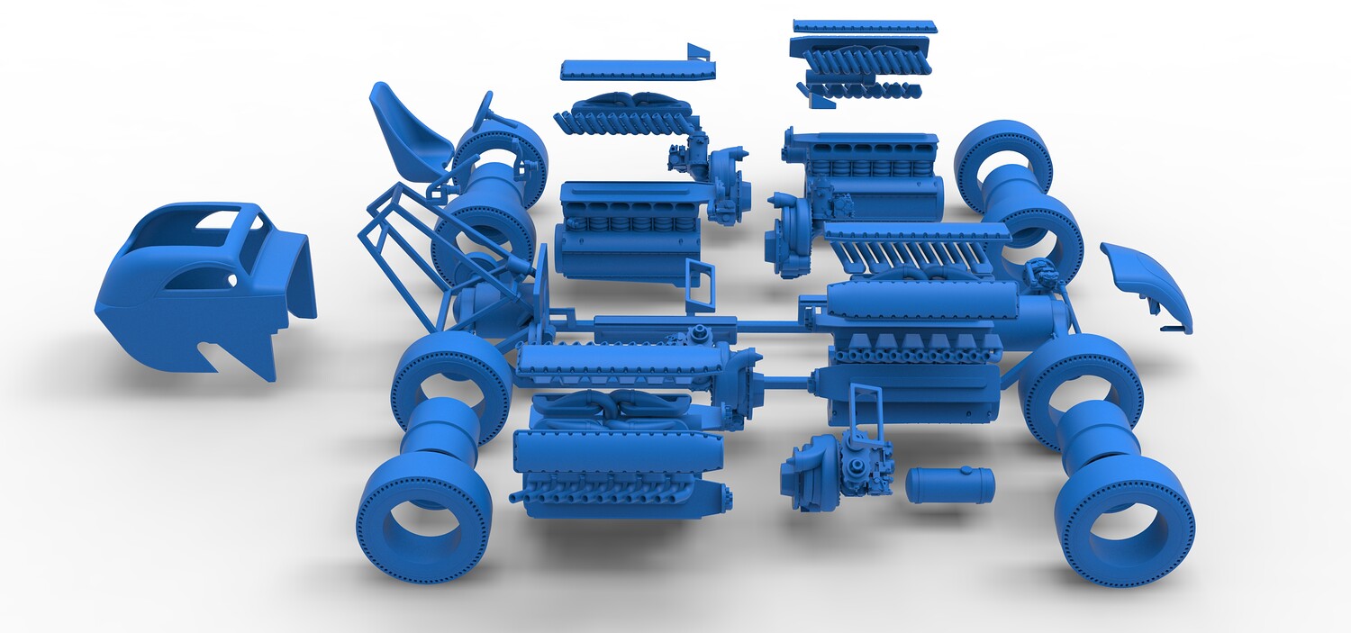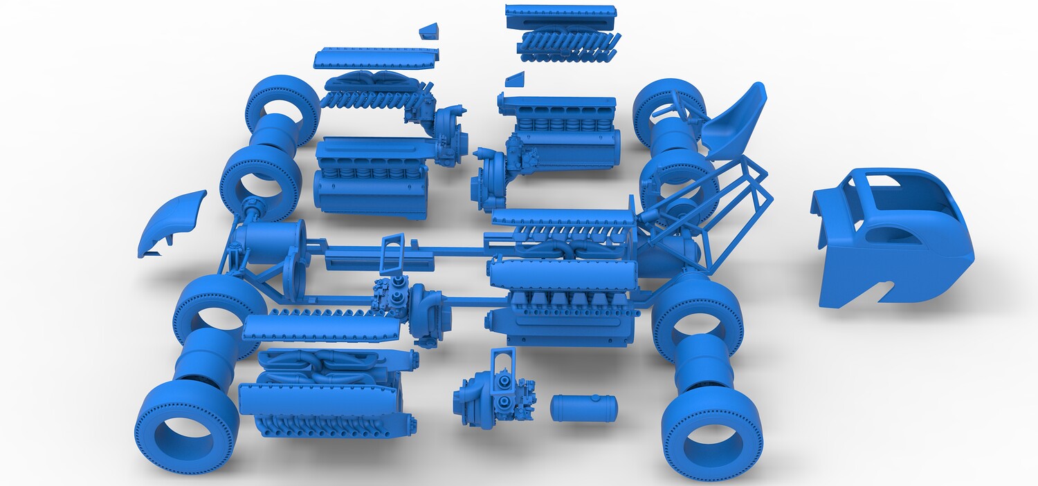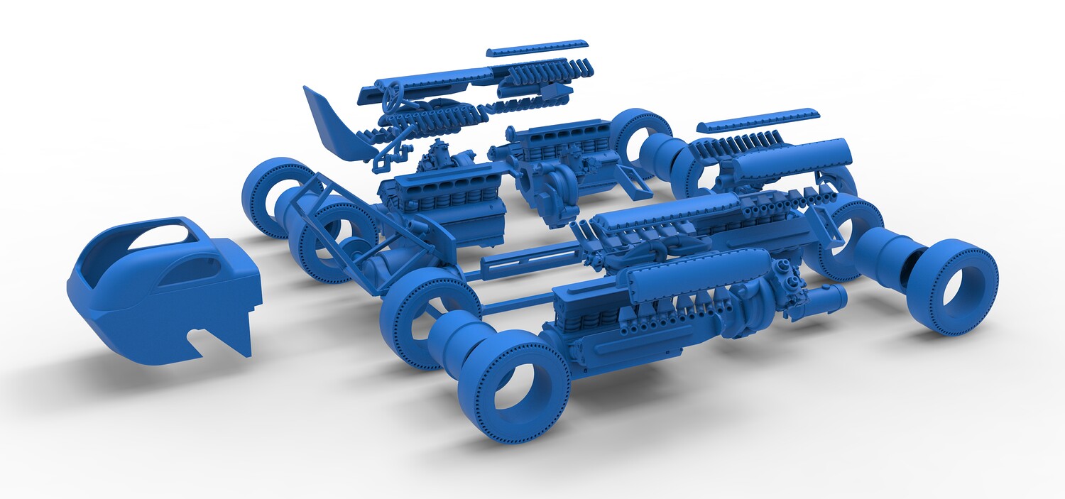 The model consists of parts: Air intakes, Brake pedal, Engine bodys, Engine compressors, Engine head covers, Frame, Front right engine body, Left exhaust pipes, Nose, Rear left engine body, Right exhaust pipes, Rims, Scoops, Seat, Shell, Shifter, Spacers, Steering wheel, Tanks, Tires.