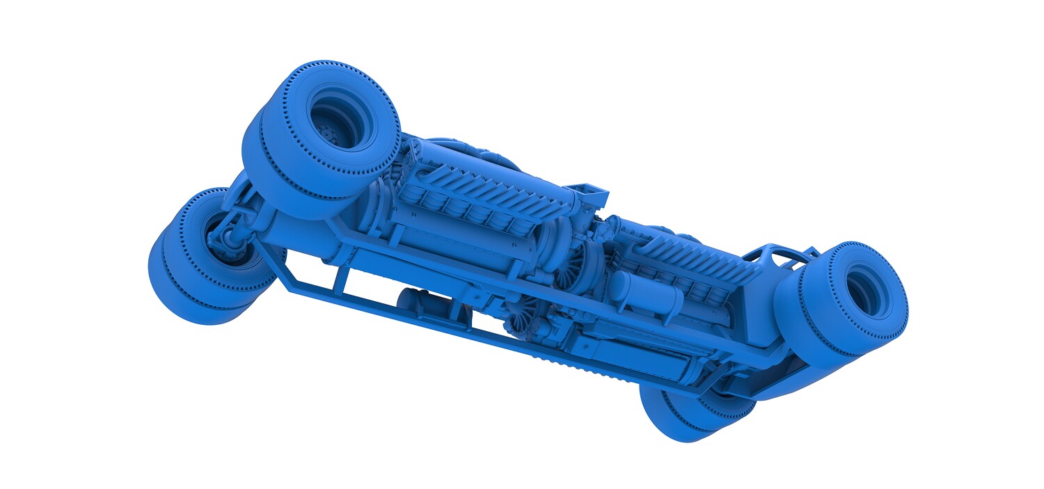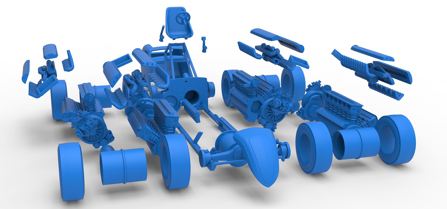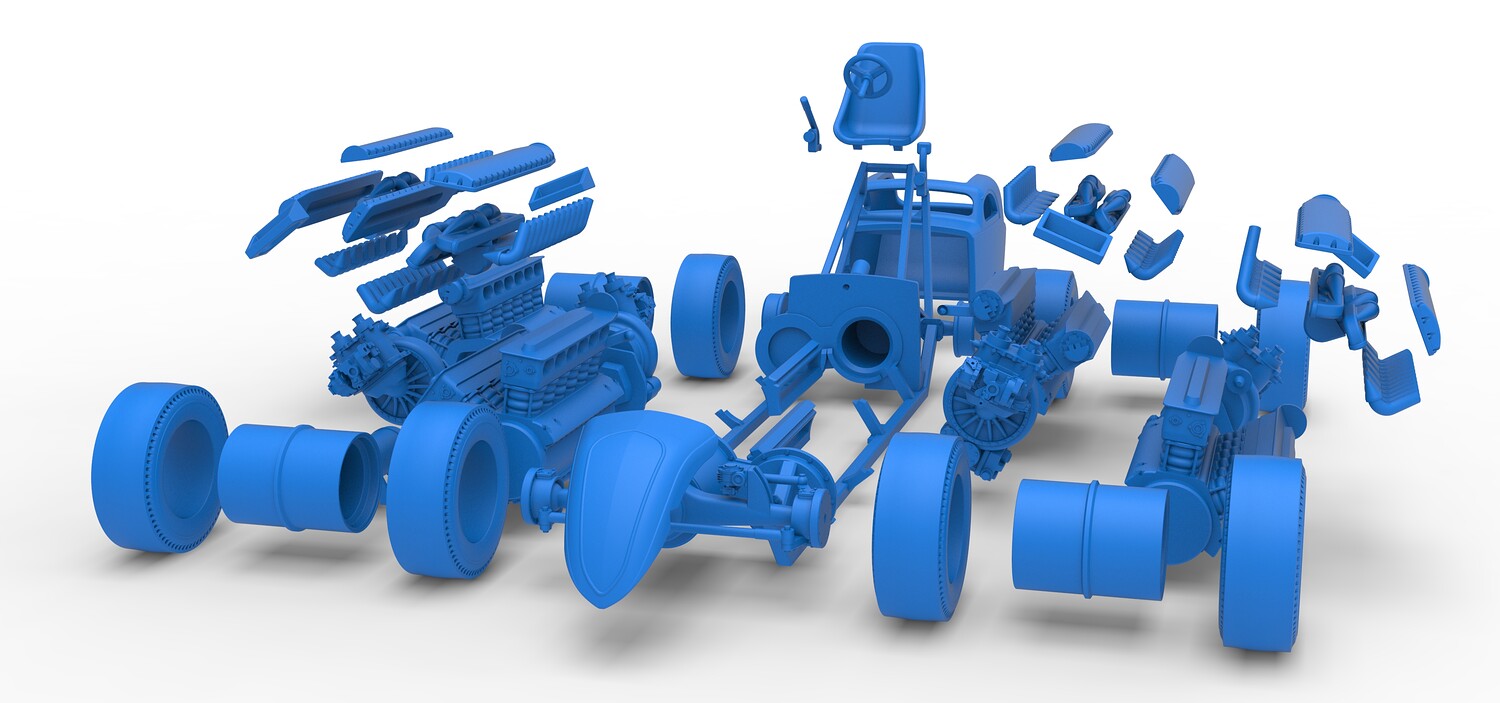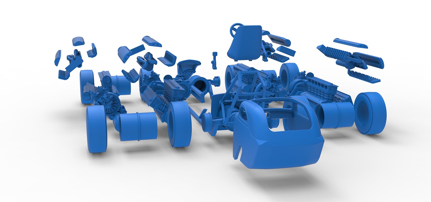 The model consists of parts: Air intakes, Brake pedal, Engine bodys, Engine compressors, Engine head covers, Frame, Front right engine body, Left exhaust pipes, Nose, Rear left engine body, Right exhaust pipes, Rims, Scoops, Seat, Shell, Shifter, Spacers, Steering wheel, Tanks, Tires.