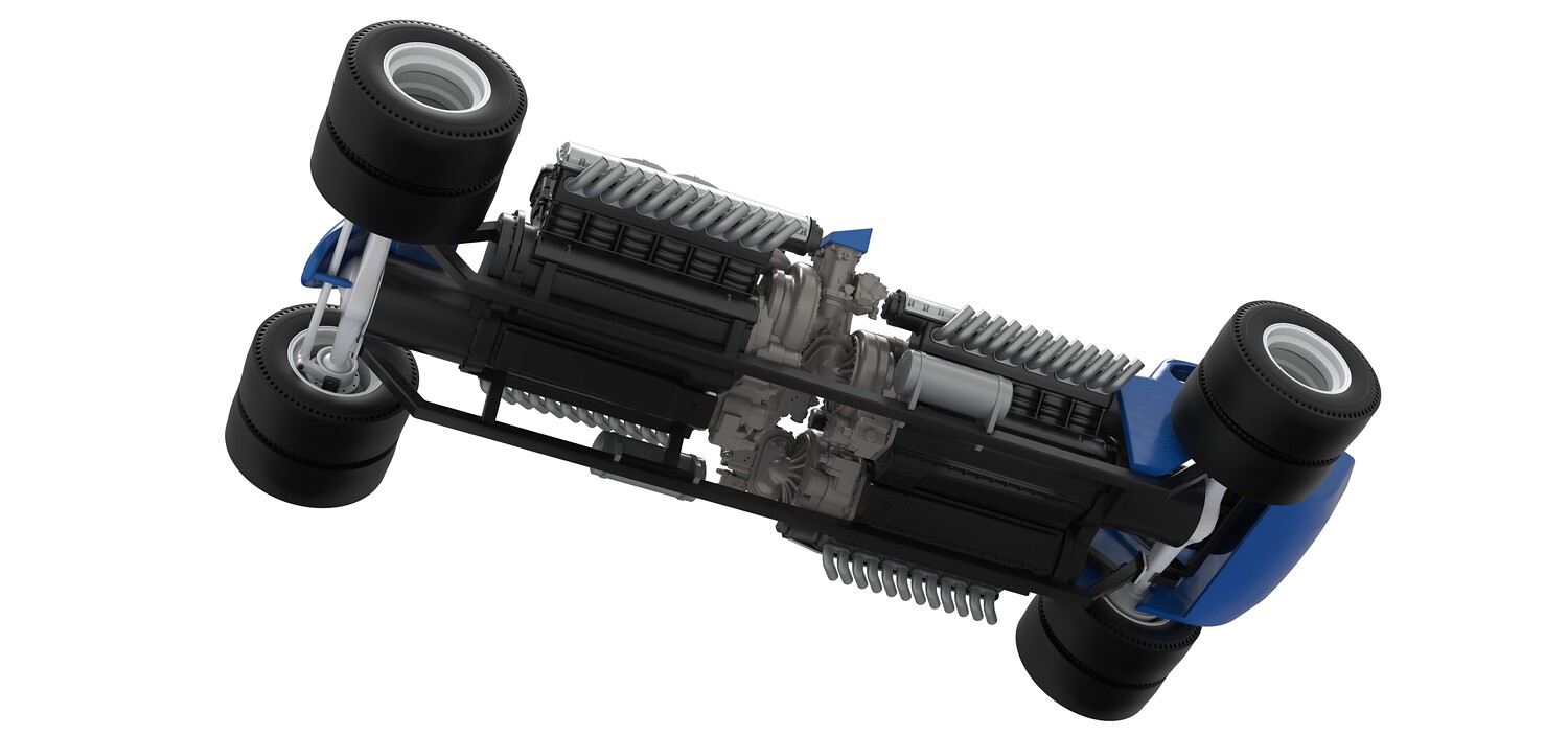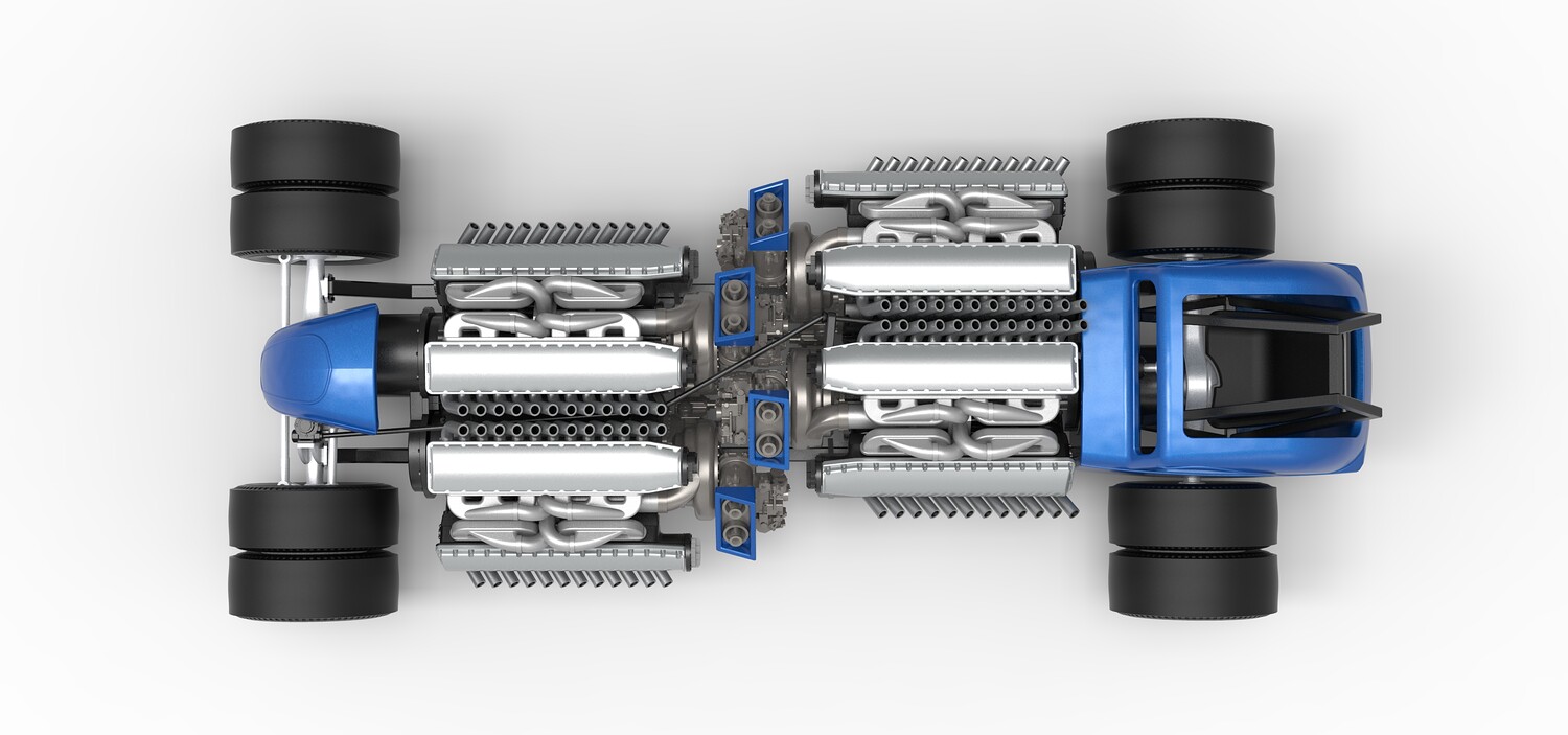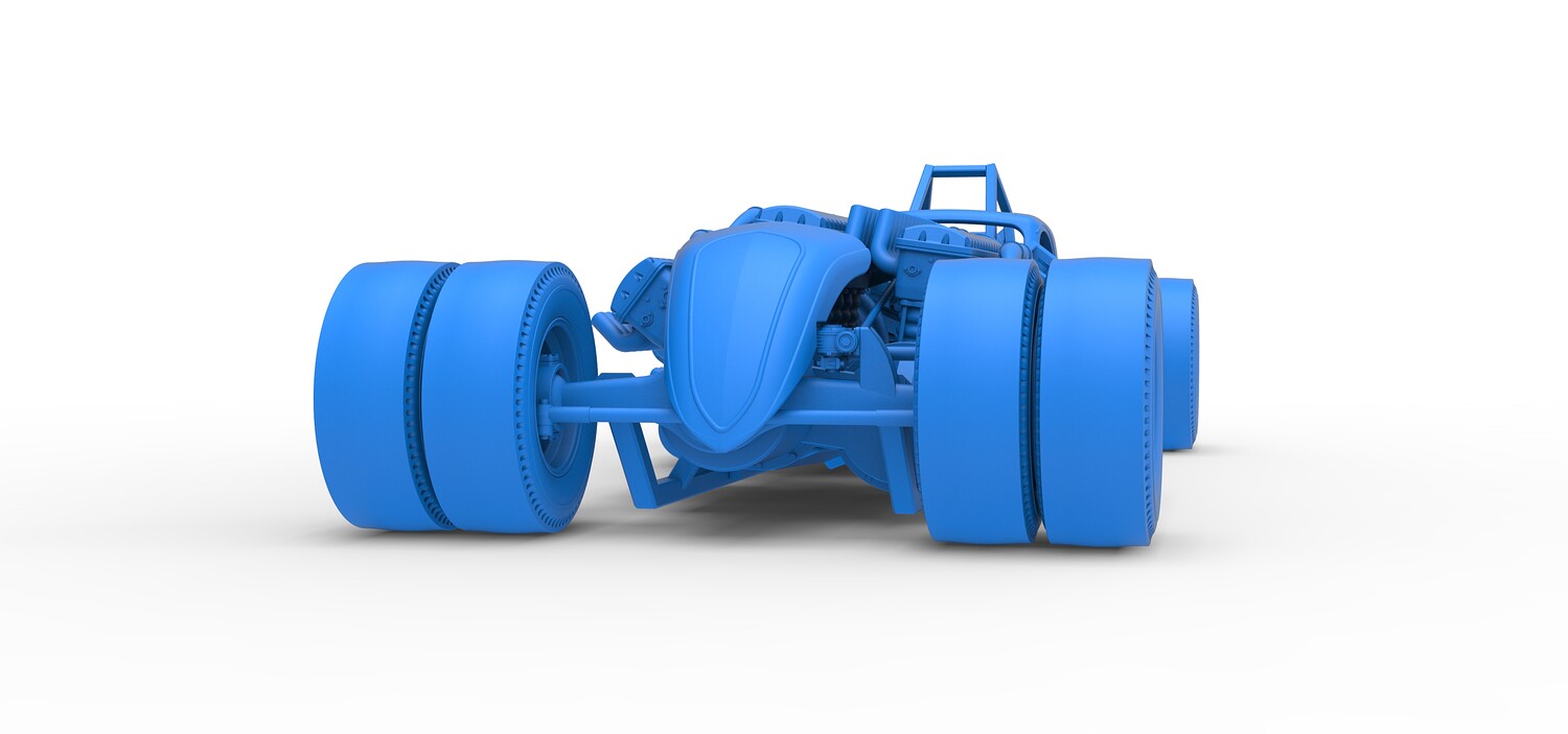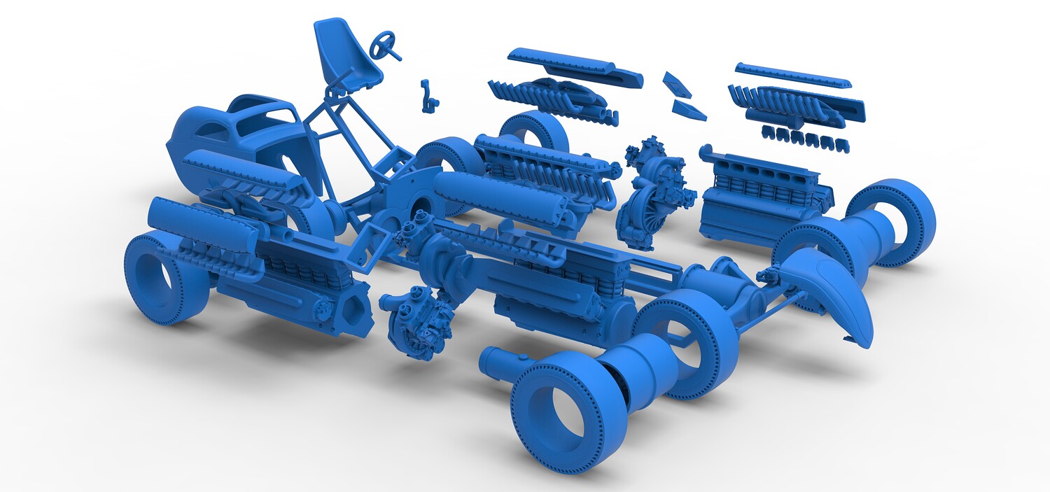 The model consists of parts: Air intakes, Brake pedal, Engine bodys, Engine compressors, Engine head covers, Frame, Front right engine body, Left exhaust pipes, Nose, Rear left engine body, Right exhaust pipes, Rims, Scoops, Seat, Shell, Shifter, Spacers, Steering wheel, Tanks, Tires.