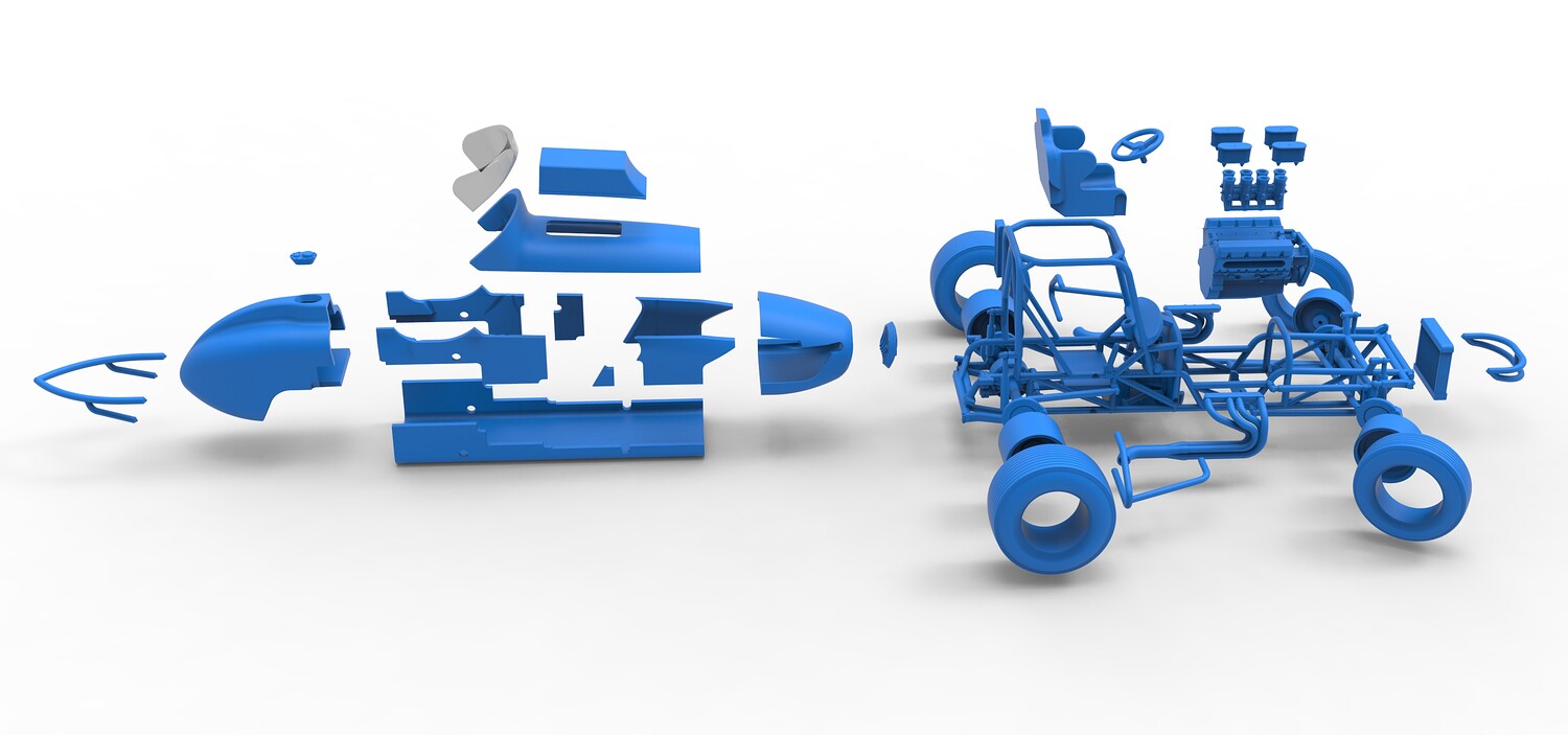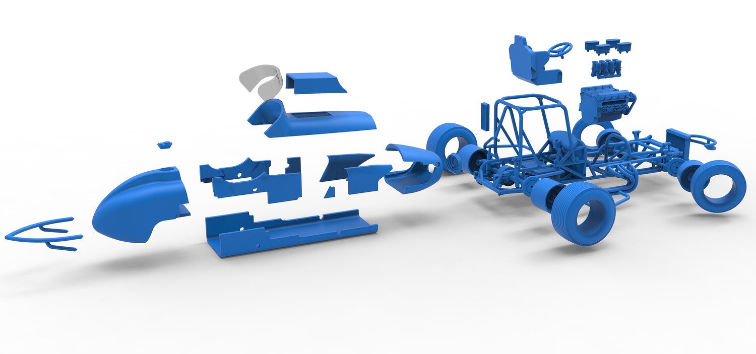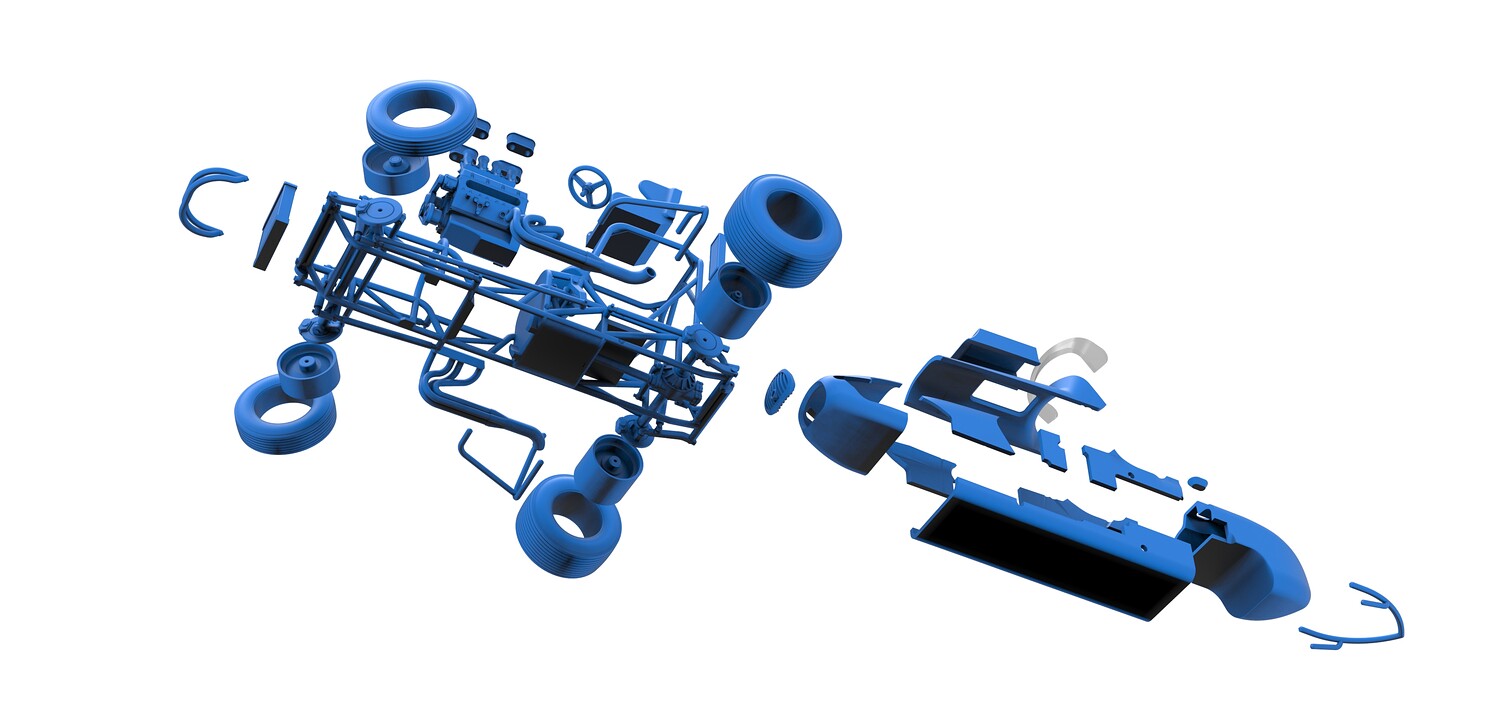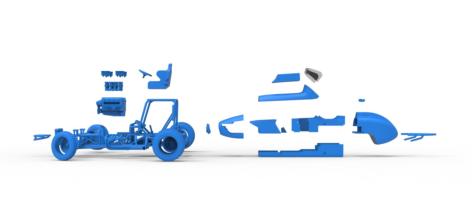 The model consists of parts: Air filters, Air intake, Engine, Frame, Front bumper, Front grid, Front left rim, Front left tire, Front right rim, Front right tire, Fuel cap, Hood, Left bumper, Left exhaust, Nose, Radiator, Rear bumper, Rear left tire, Rear rims, Rear right tire, Right bumper, Right exhaust, Scoop, Seat, Shell bottom part, Shell left part 1-3, Shell right part 1-3, Side radiator, Steering wheel, Tank, Windshield.