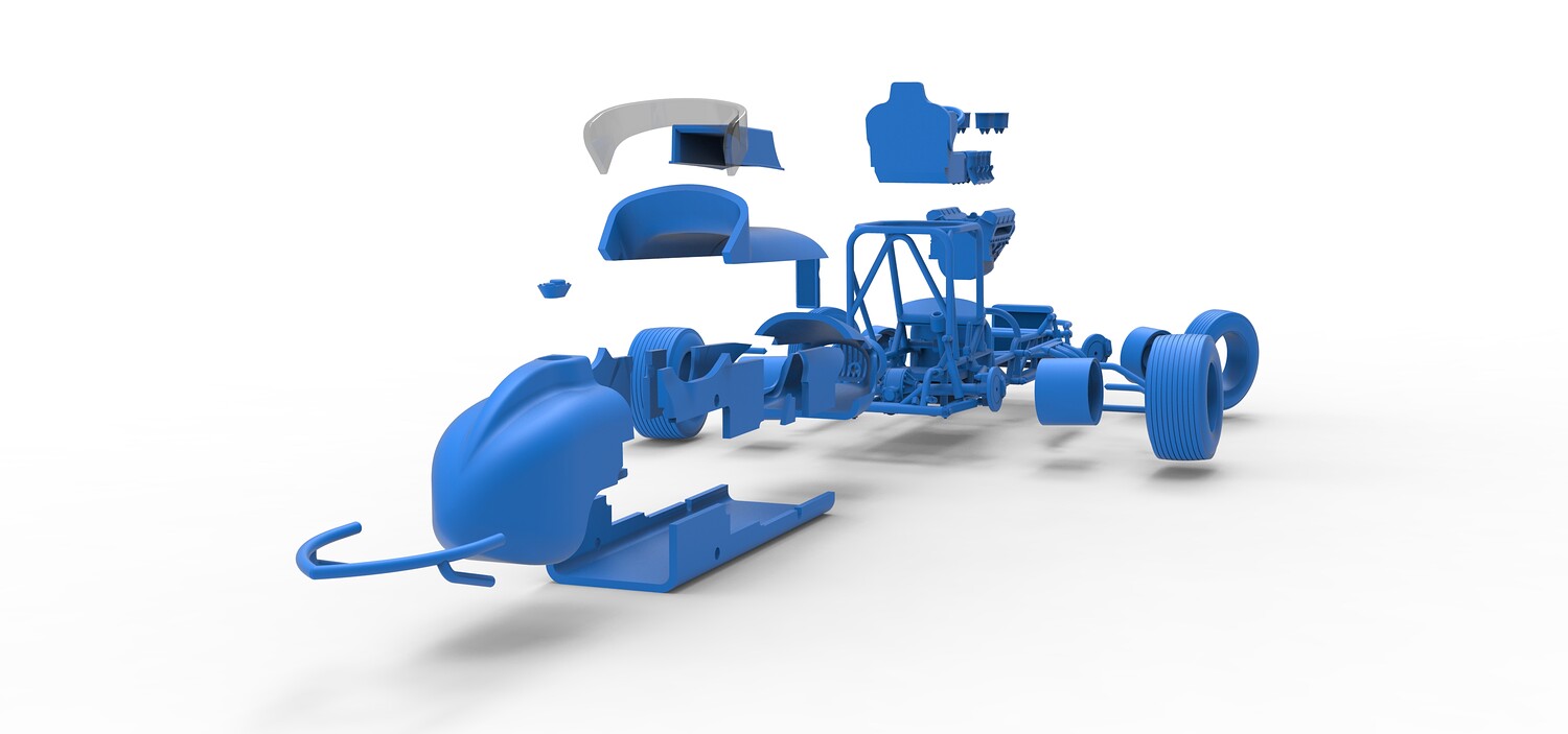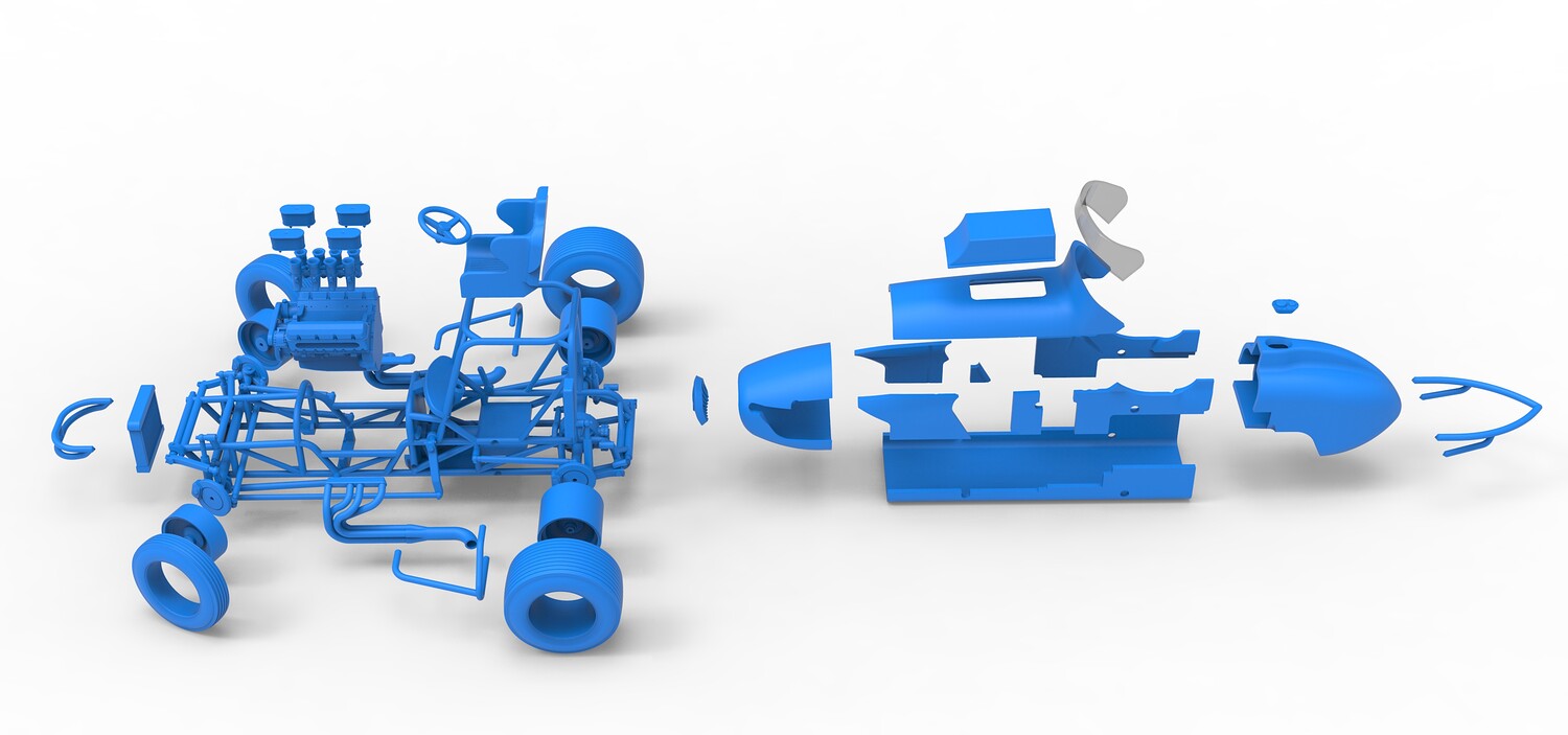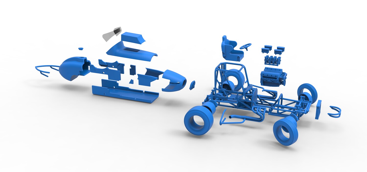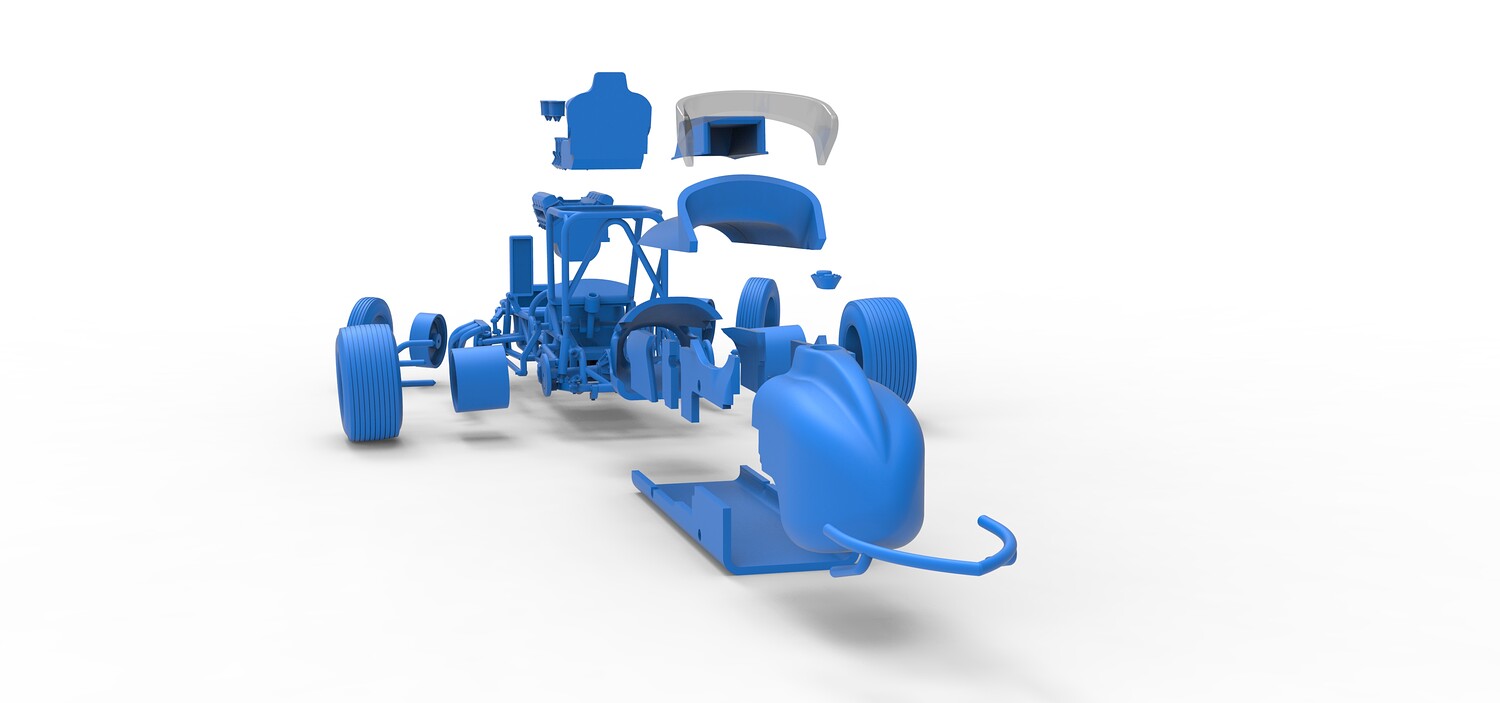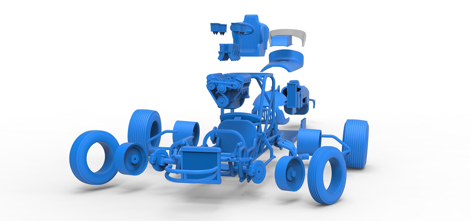 The model consists of parts: Air filters, Air intake, Engine, Frame, Front bumper, Front grid, Front left rim, Front left tire, Front right rim, Front right tire, Fuel cap, Hood, Left bumper, Left exhaust, Nose, Radiator, Rear bumper, Rear left tire, Rear rims, Rear right tire, Right bumper, Right exhaust, Scoop, Seat, Shell bottom part, Shell left part 1-3, Shell right part 1-3, Side radiator, Steering wheel, Tank, Windshield.
