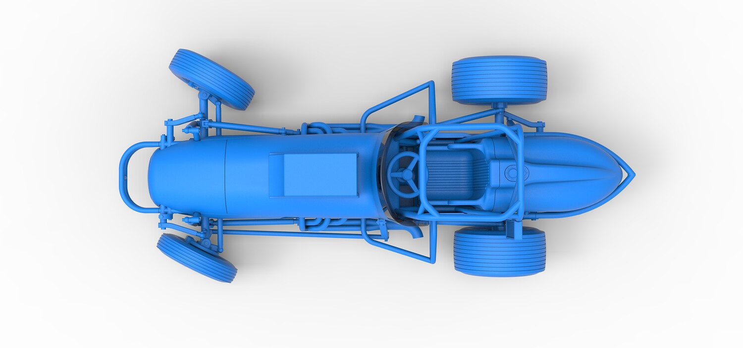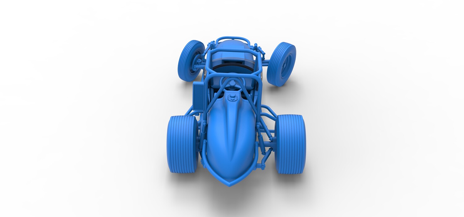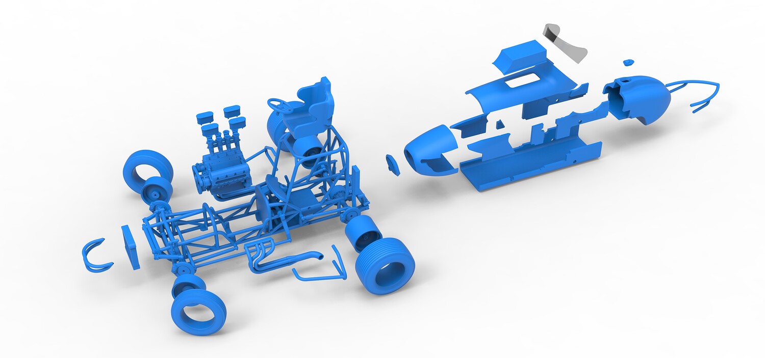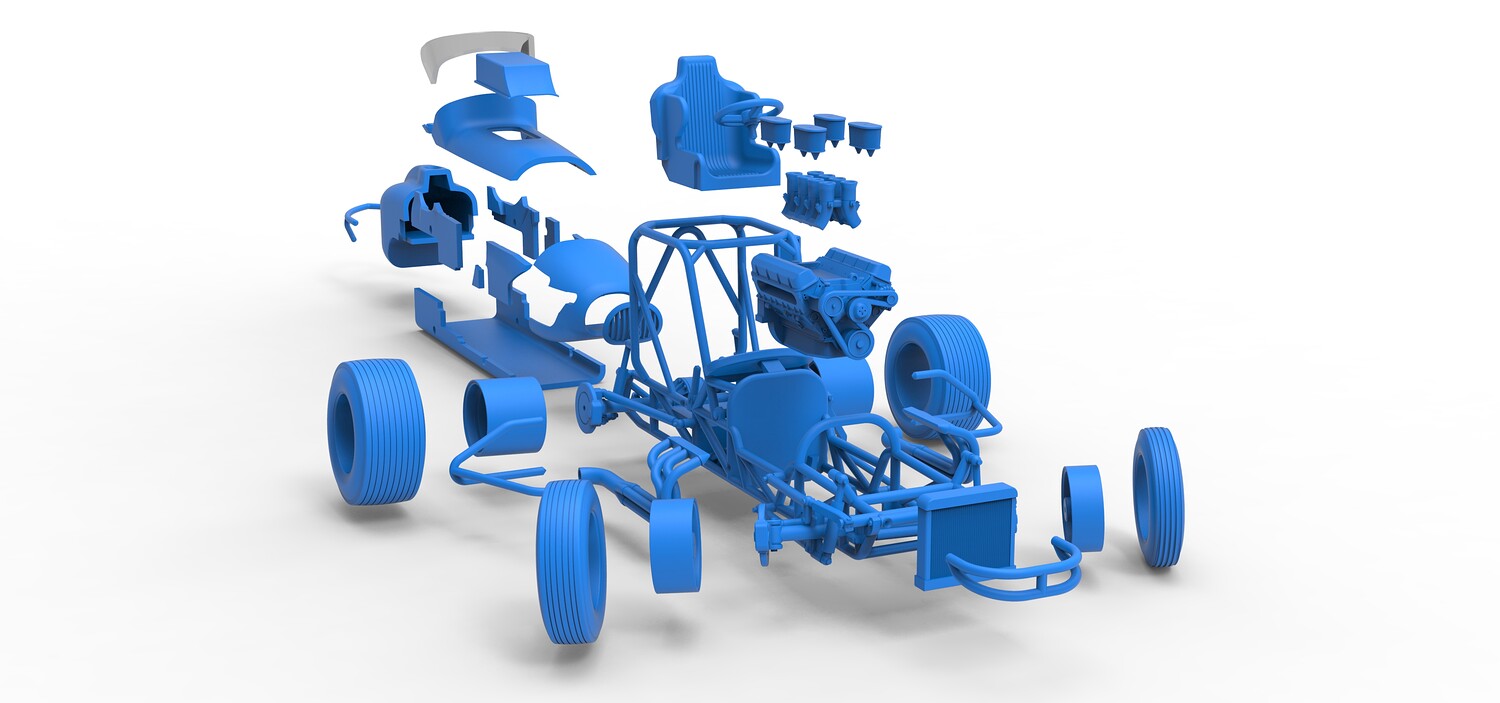 The model consists of parts: Air filters, Air intake, Engine, Frame, Front bumper, Front grid, Front left rim, Front left tire, Front right rim, Front right tire, Fuel cap, Hood, Left bumper, Left exhaust, Nose, Radiator, Rear bumper, Rear left tire, Rear rims, Rear right tire, Right bumper, Right exhaust, Scoop, Seat, Shell bottom part, Shell left part 1-3, Shell right part 1-3, Side radiator, Steering wheel, Tank, Windshield.