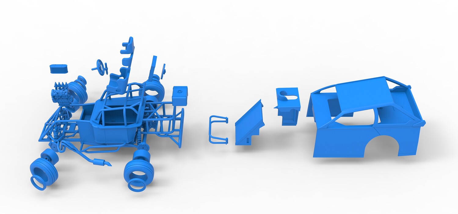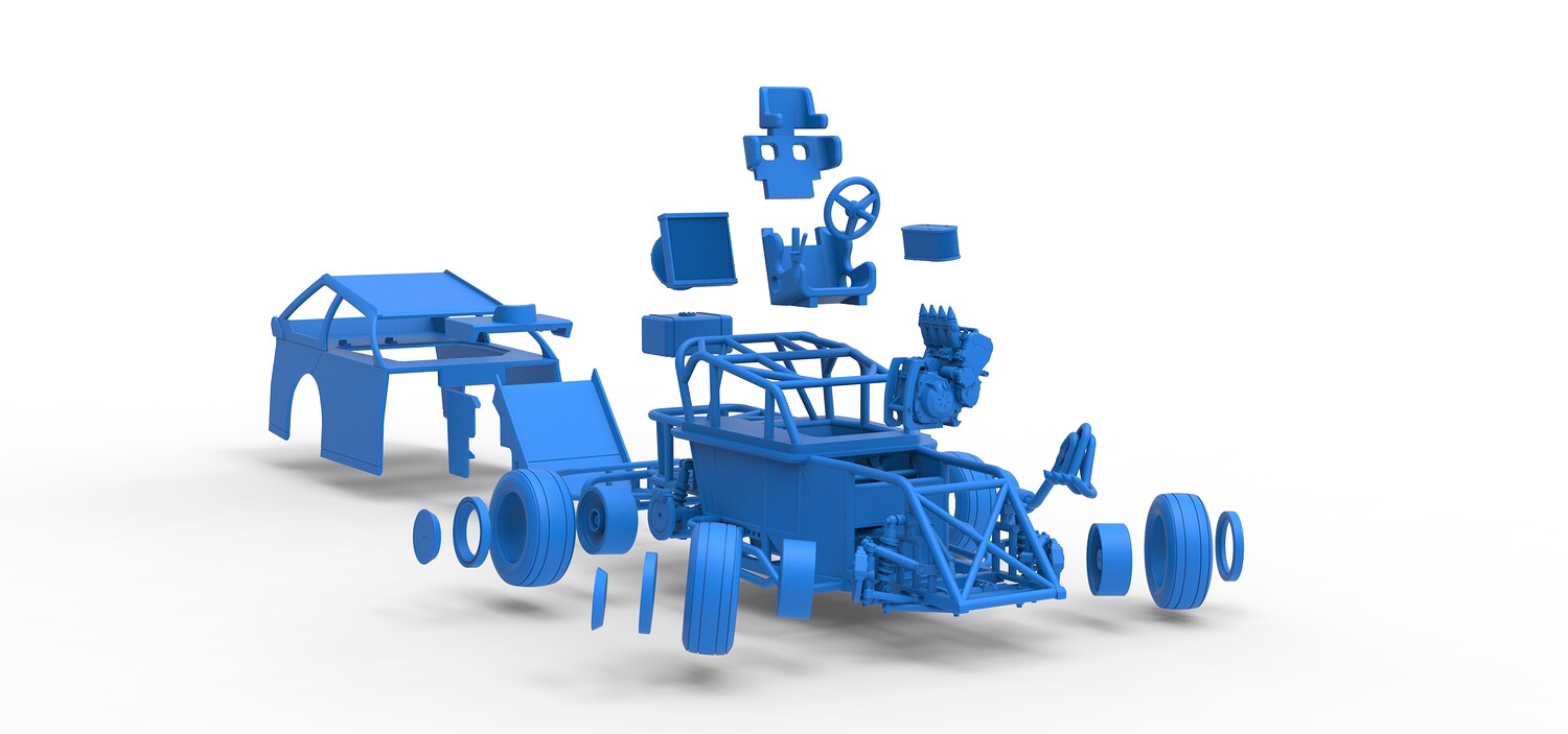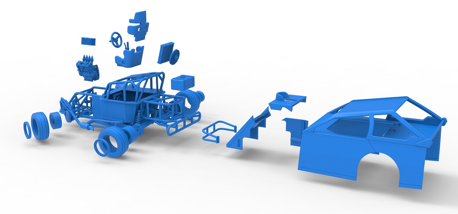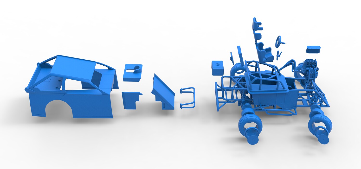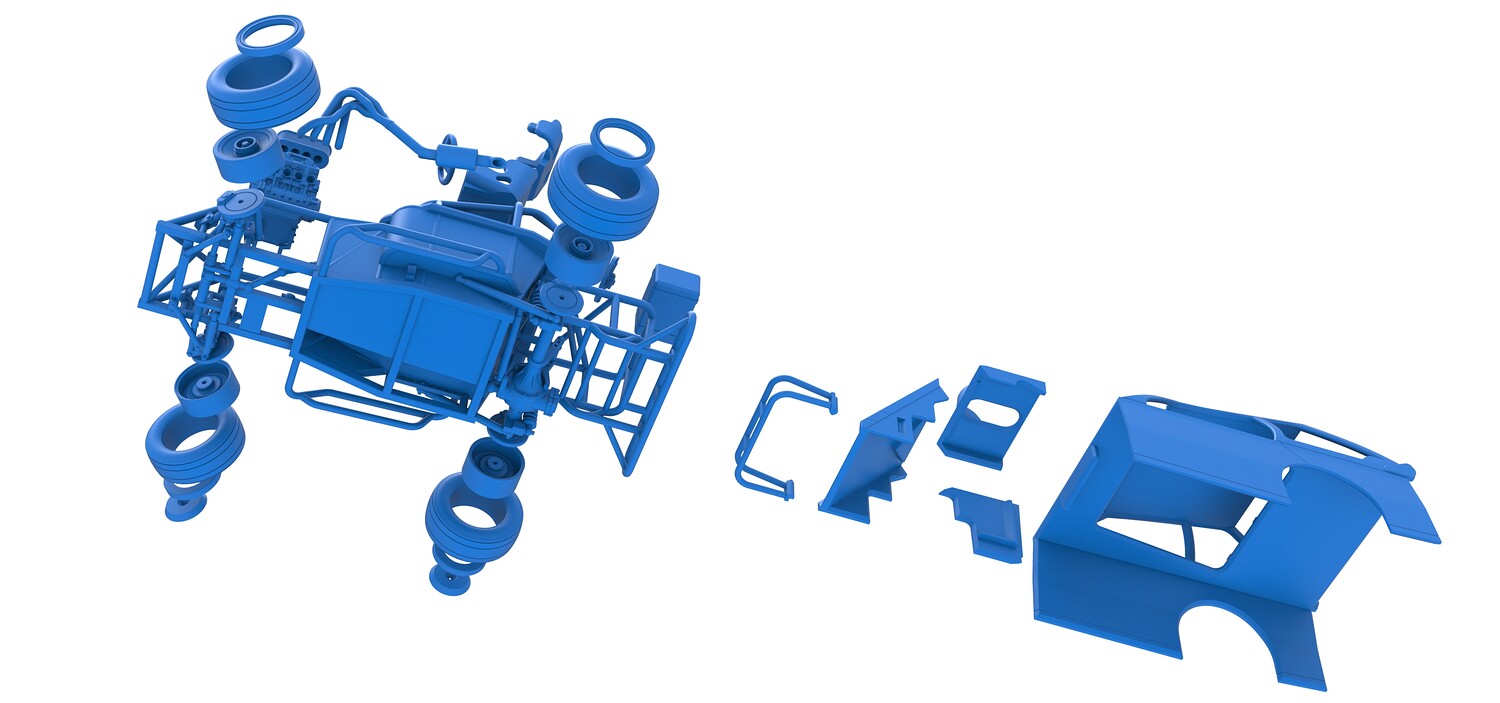 The model consists of parts: Air filter, Beadlock rings, Beadlock rings for mud guard, Engine, Exhaust, Fan, Frame, Front bumper, Front rims, Front tires, Hood, Mud guards, Nose, Radiator, Rear rims, Rear tires, Seat part 1,2, Shell main part, Shell side pannel, Shifter, Steering wheel, Tank.