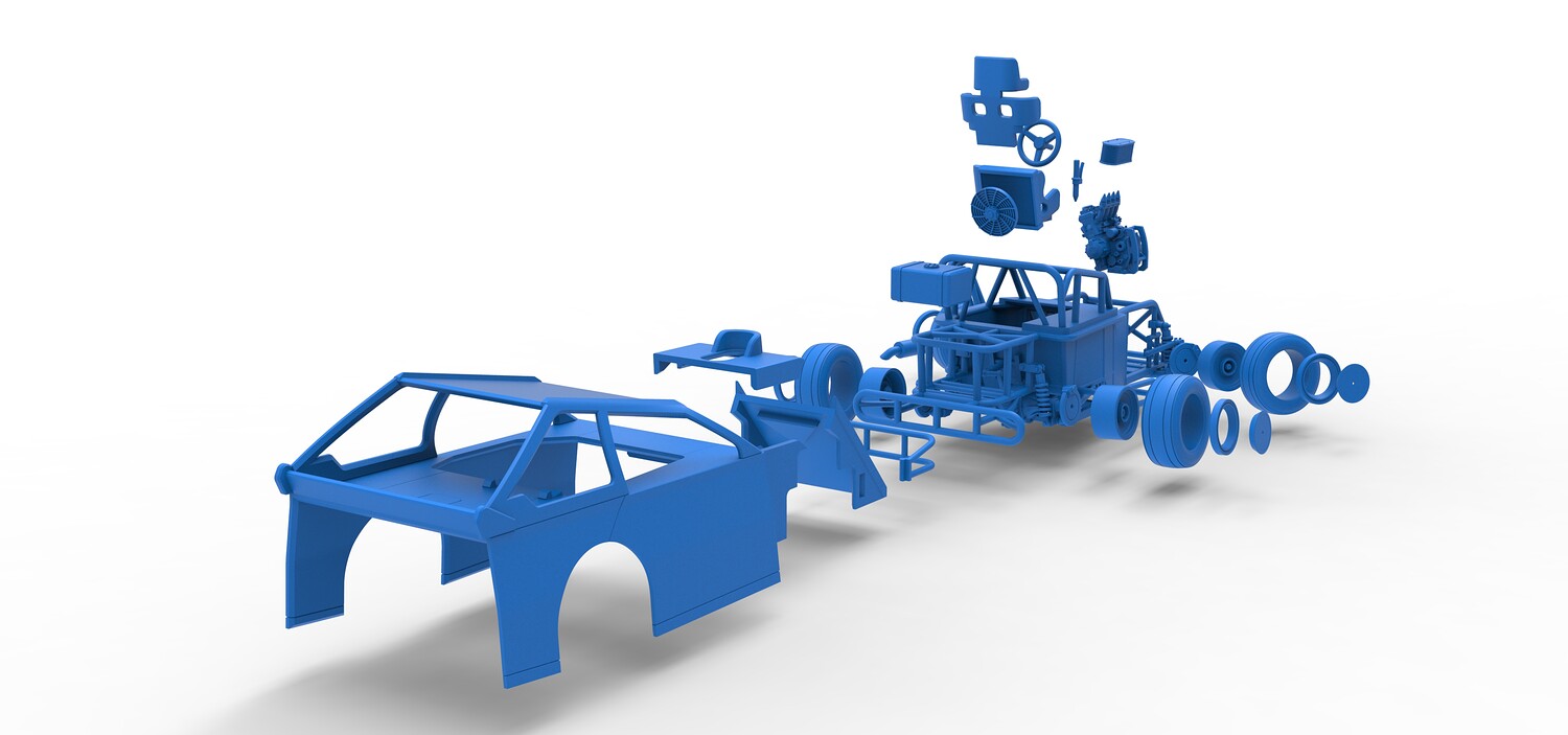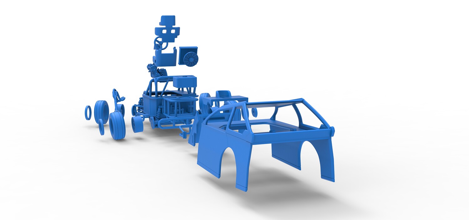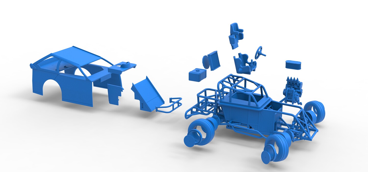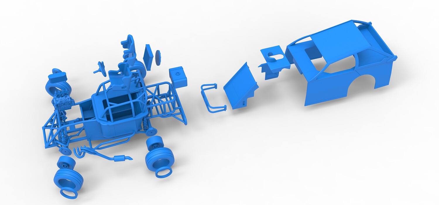 The model consists of parts: Air filter, Beadlock rings, Beadlock rings for mud guard, Engine, Exhaust, Fan, Frame, Front bumper, Front rims, Front tires, Hood, Mud guards, Nose, Radiator, Rear rims, Rear tires, Seat part 1,2, Shell main part, Shell side pannel, Shifter, Steering wheel, Tank.