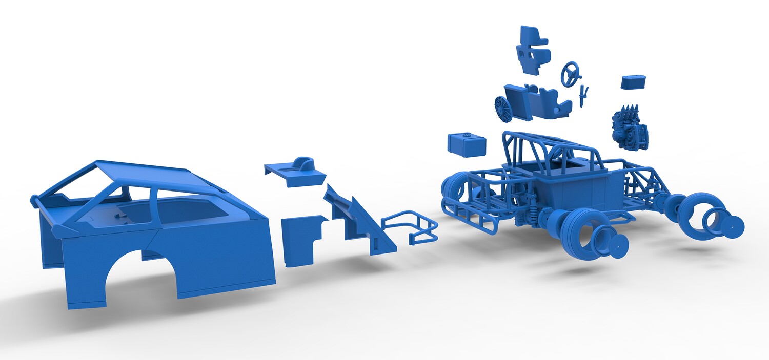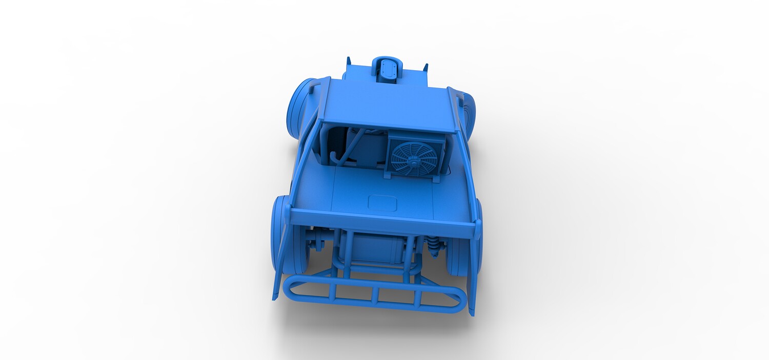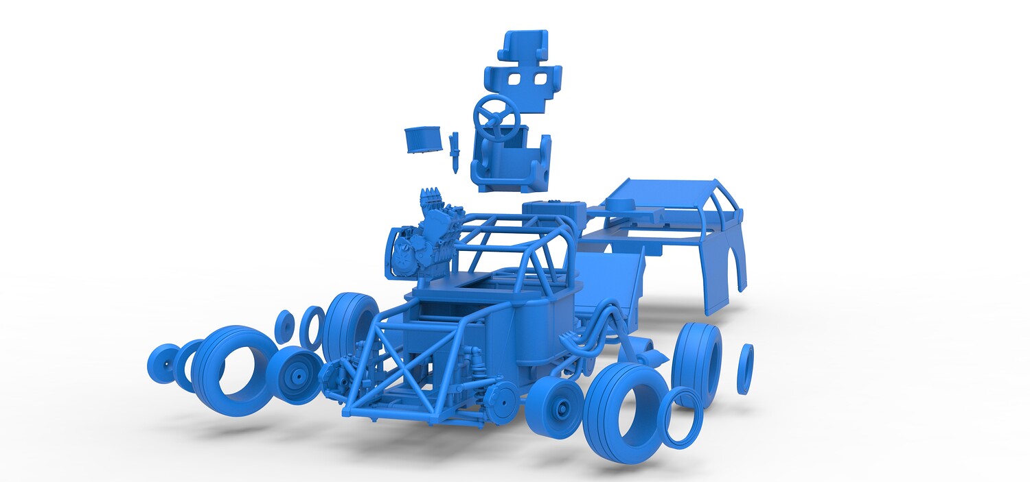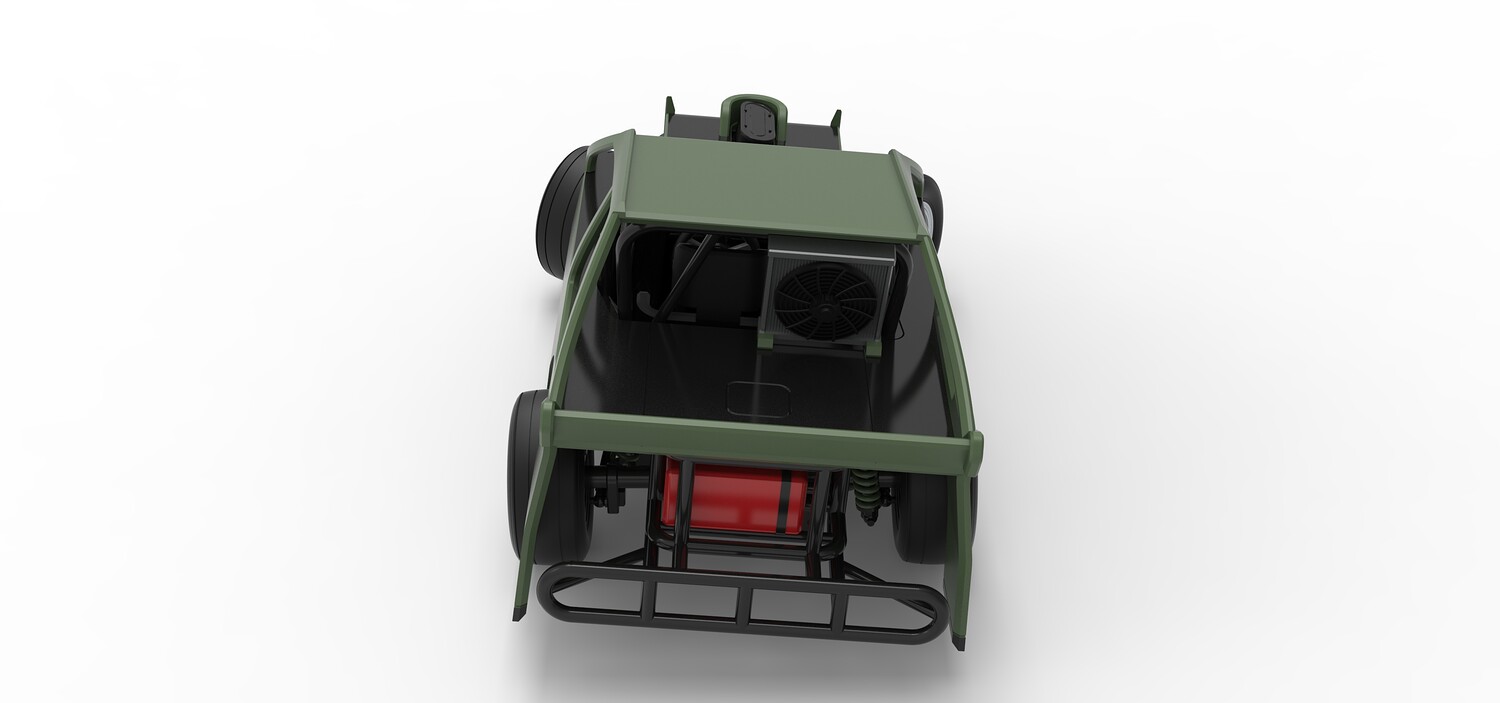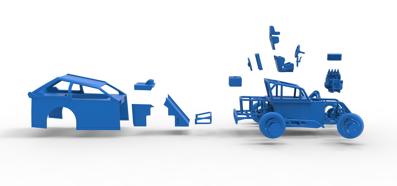 The model consists of parts: Air filter, Beadlock rings, Beadlock rings for mud guard, Engine, Exhaust, Fan, Frame, Front bumper, Front rims, Front tires, Hood, Mud guards, Nose, Radiator, Rear rims, Rear tires, Seat part 1,2, Shell main part, Shell side pannel, Shifter, Steering wheel, Tank.