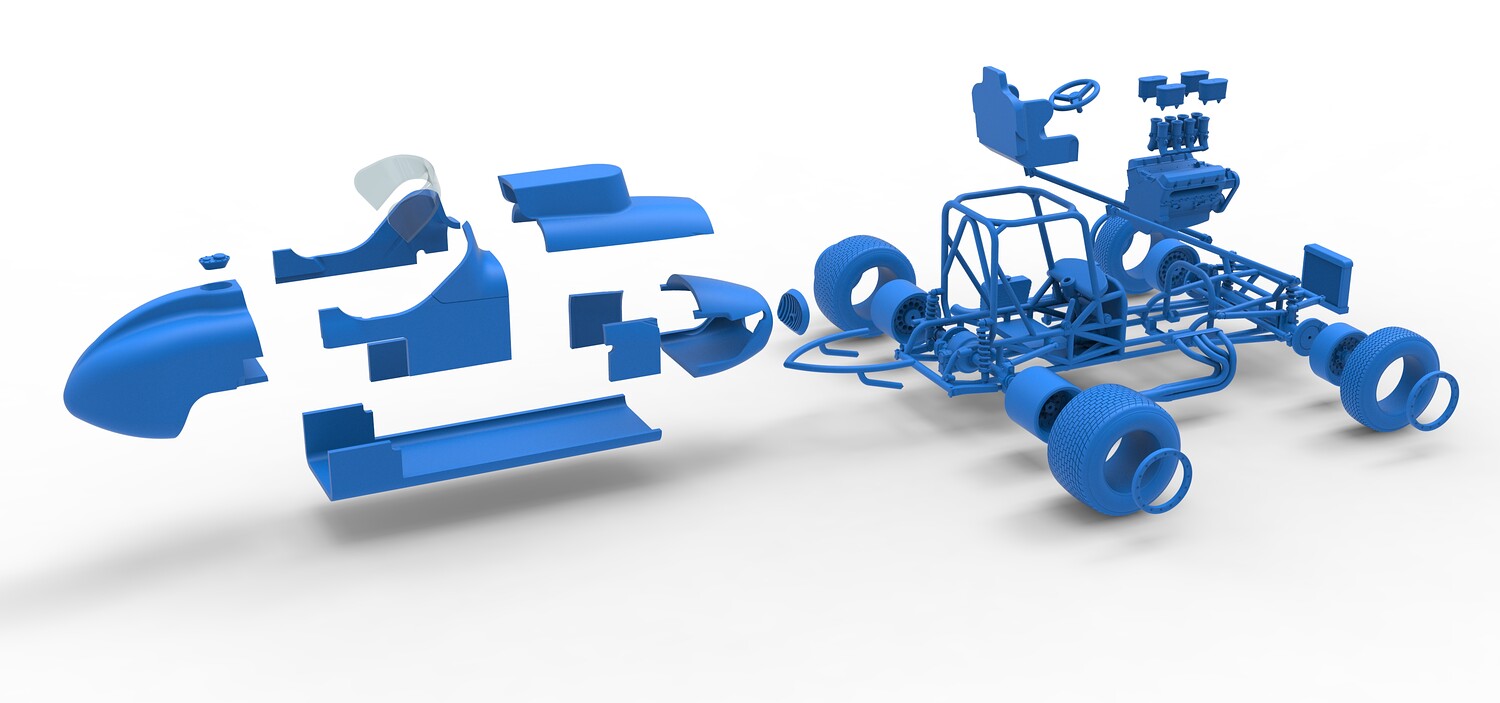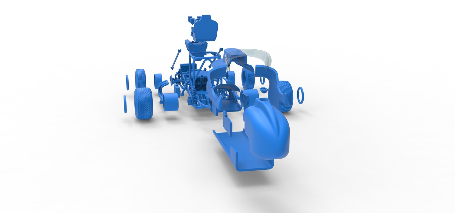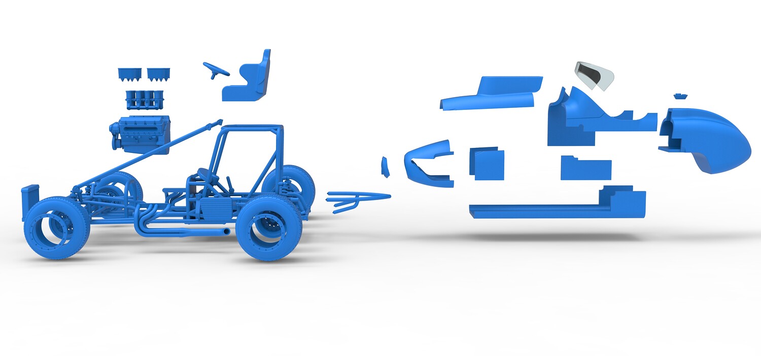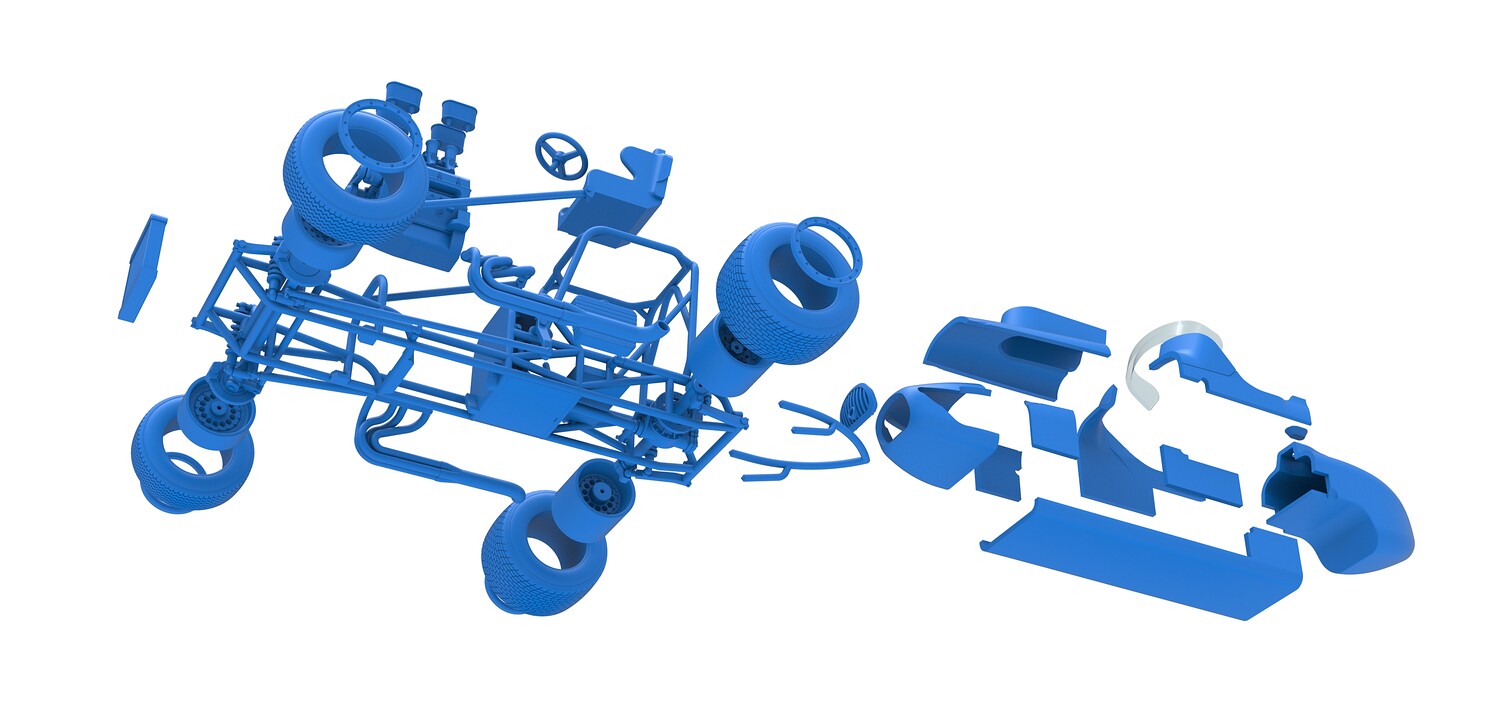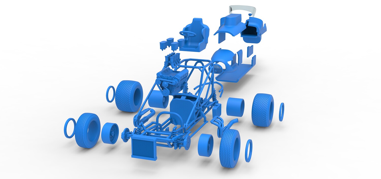 The model consists of parts: Air filters, Air intake, Beadlock rings, Engine, Frame, Front grid, Front rims, Front tires, Fuel cap, Hood, Left bar, Left exhaust, Nose, Oil tank, Radiator, Rear bumper, Rear left rim, Rear left tire, Rear right rim, Rear right tire, Right bar, Right exhaust, Seat, Shell bottom part, Shell left part 1-3, Shell right part 1,2, Steering wheel, Tank, Windshield.