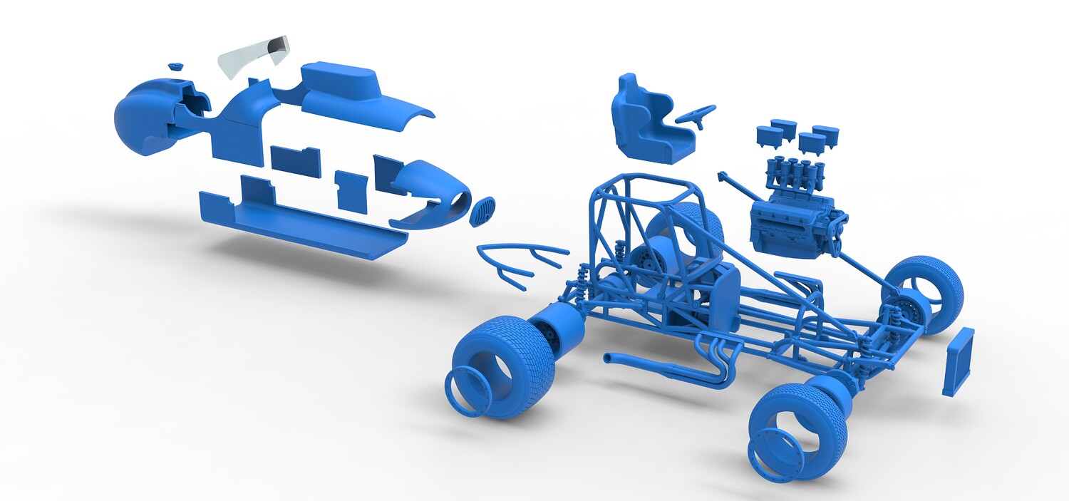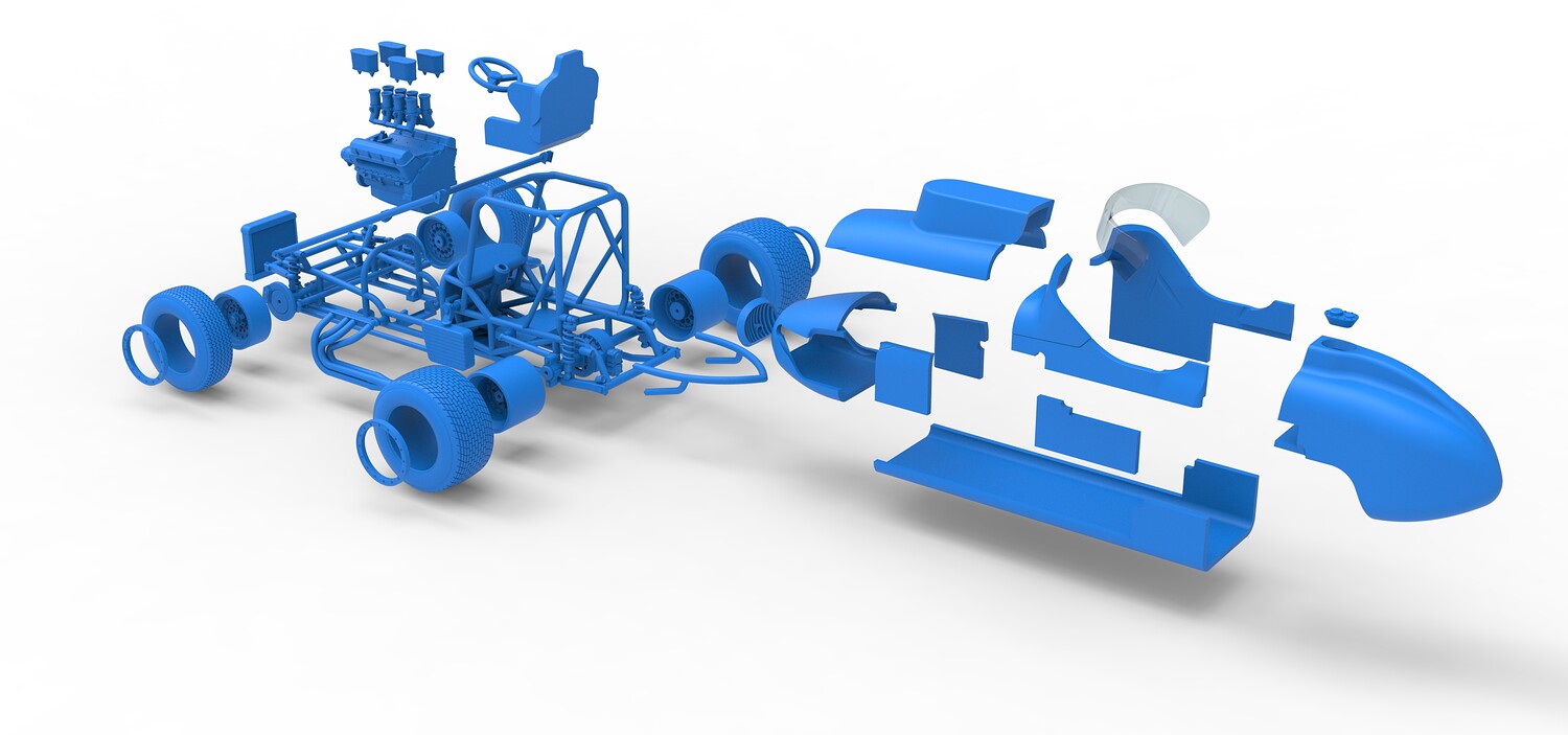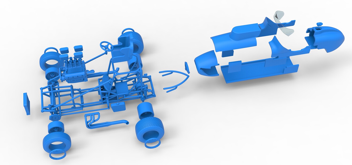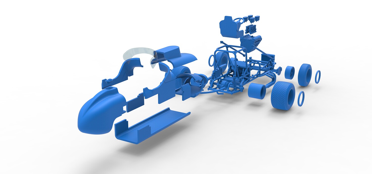 The model consists of parts: Air filters, Air intake, Beadlock rings, Engine, Frame, Front grid, Front rims, Front tires, Fuel cap, Hood, Left bar, Left exhaust, Nose, Oil tank, Radiator, Rear bumper, Rear left rim, Rear left tire, Rear right rim, Rear right tire, Right bar, Right exhaust, Seat, Shell bottom part, Shell left part 1-3, Shell right part 1,2, Steering wheel, Tank, Windshield.