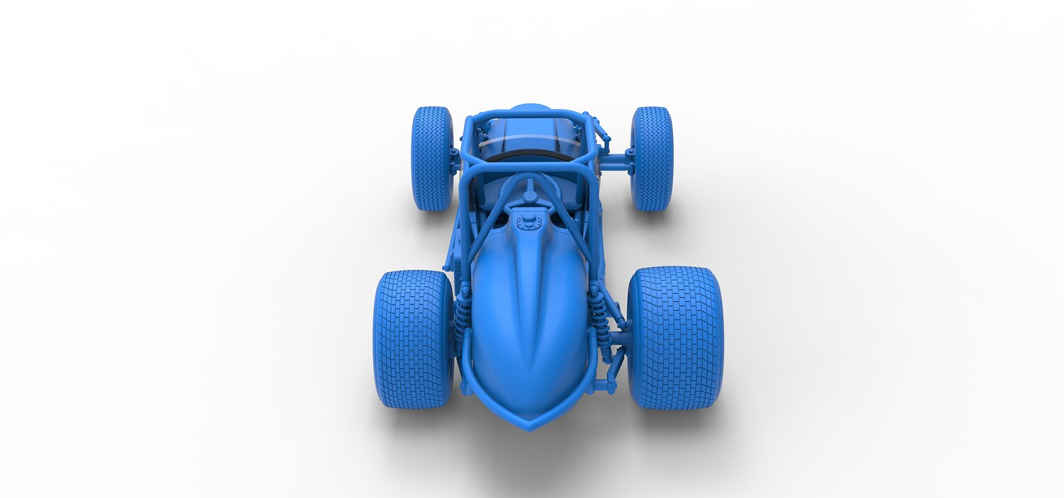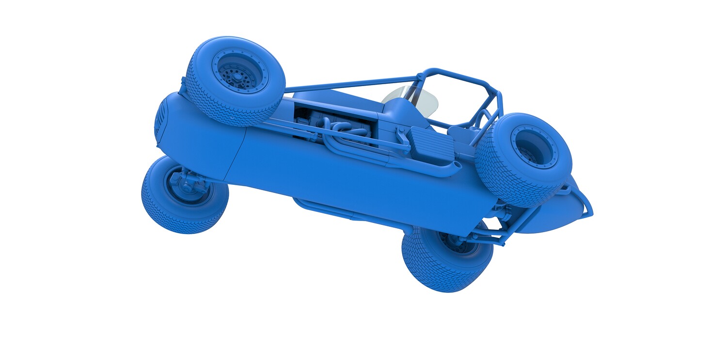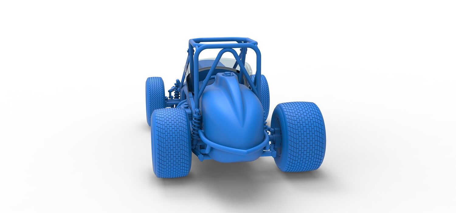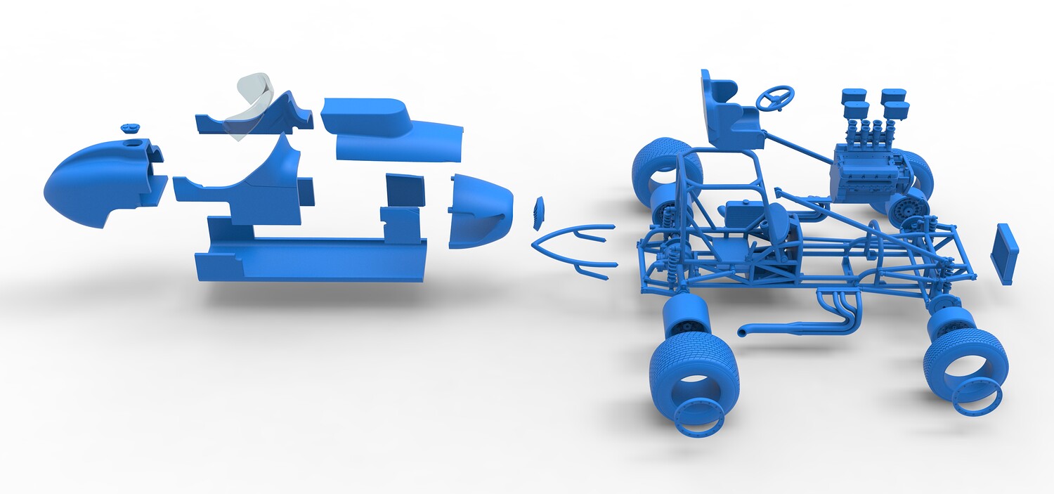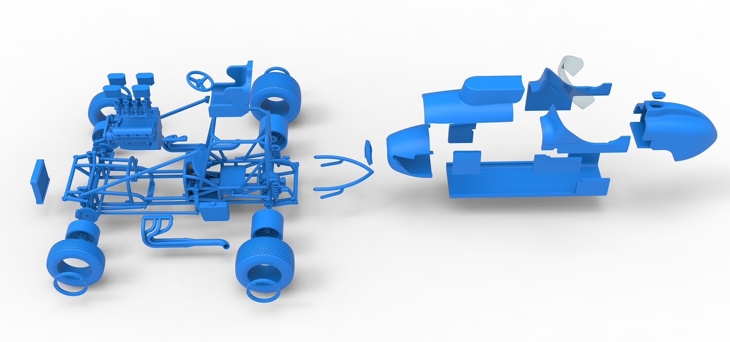 The model consists of parts: Air filters, Air intake, Beadlock rings, Engine, Frame, Front grid, Front rims, Front tires, Fuel cap, Hood, Left bar, Left exhaust, Nose, Oil tank, Radiator, Rear bumper, Rear left rim, Rear left tire, Rear right rim, Rear right tire, Right bar, Right exhaust, Seat, Shell bottom part, Shell left part 1-3, Shell right part 1,2, Steering wheel, Tank, Windshield.