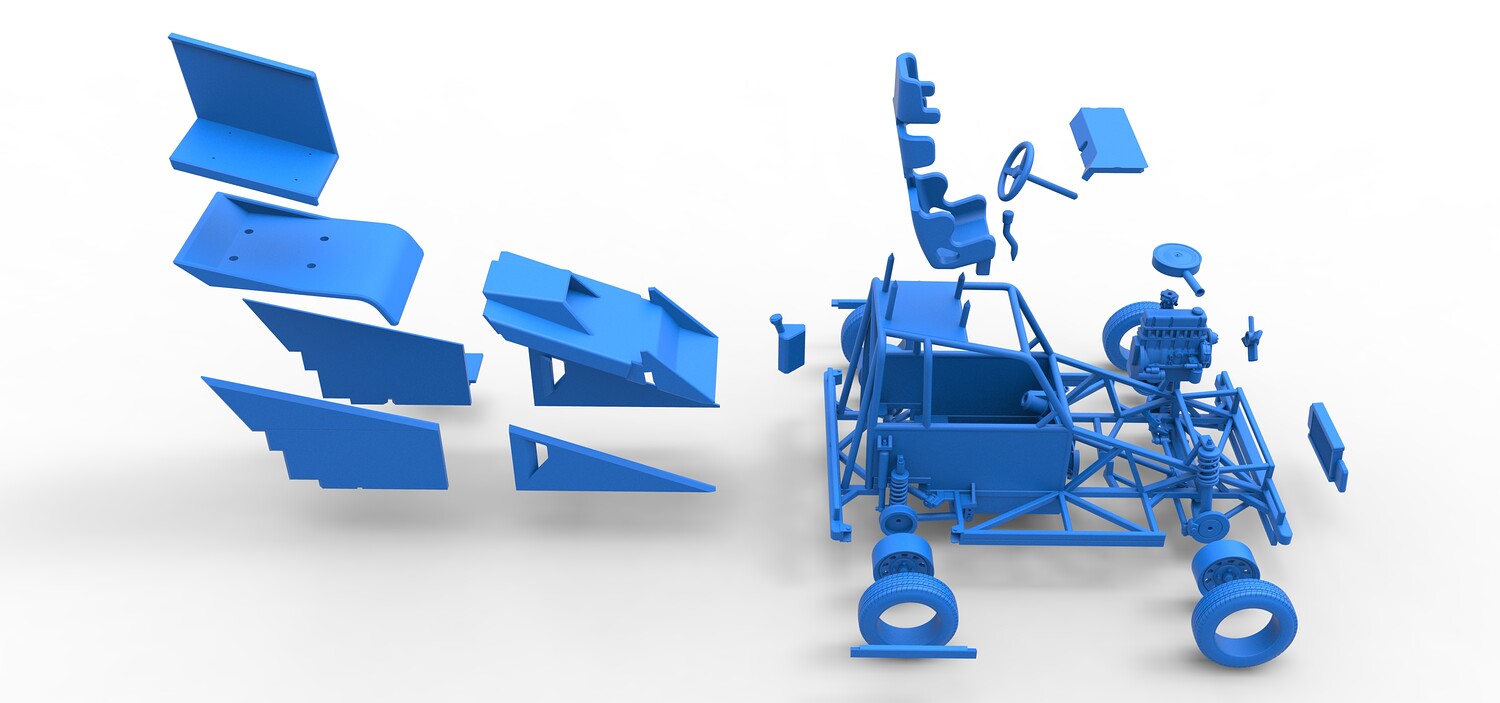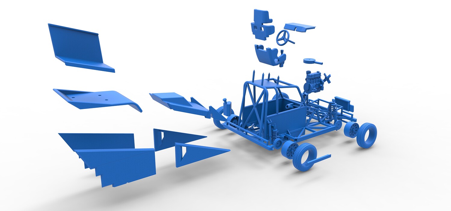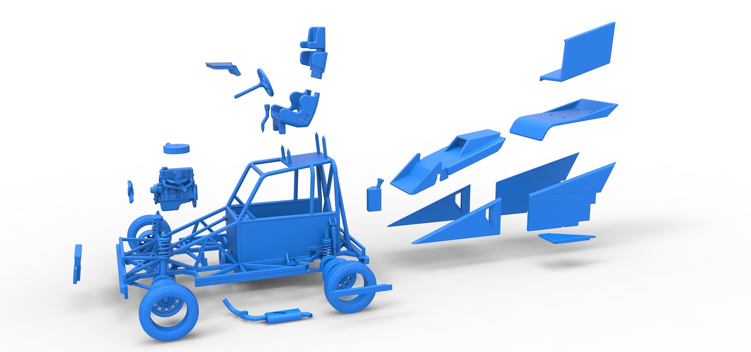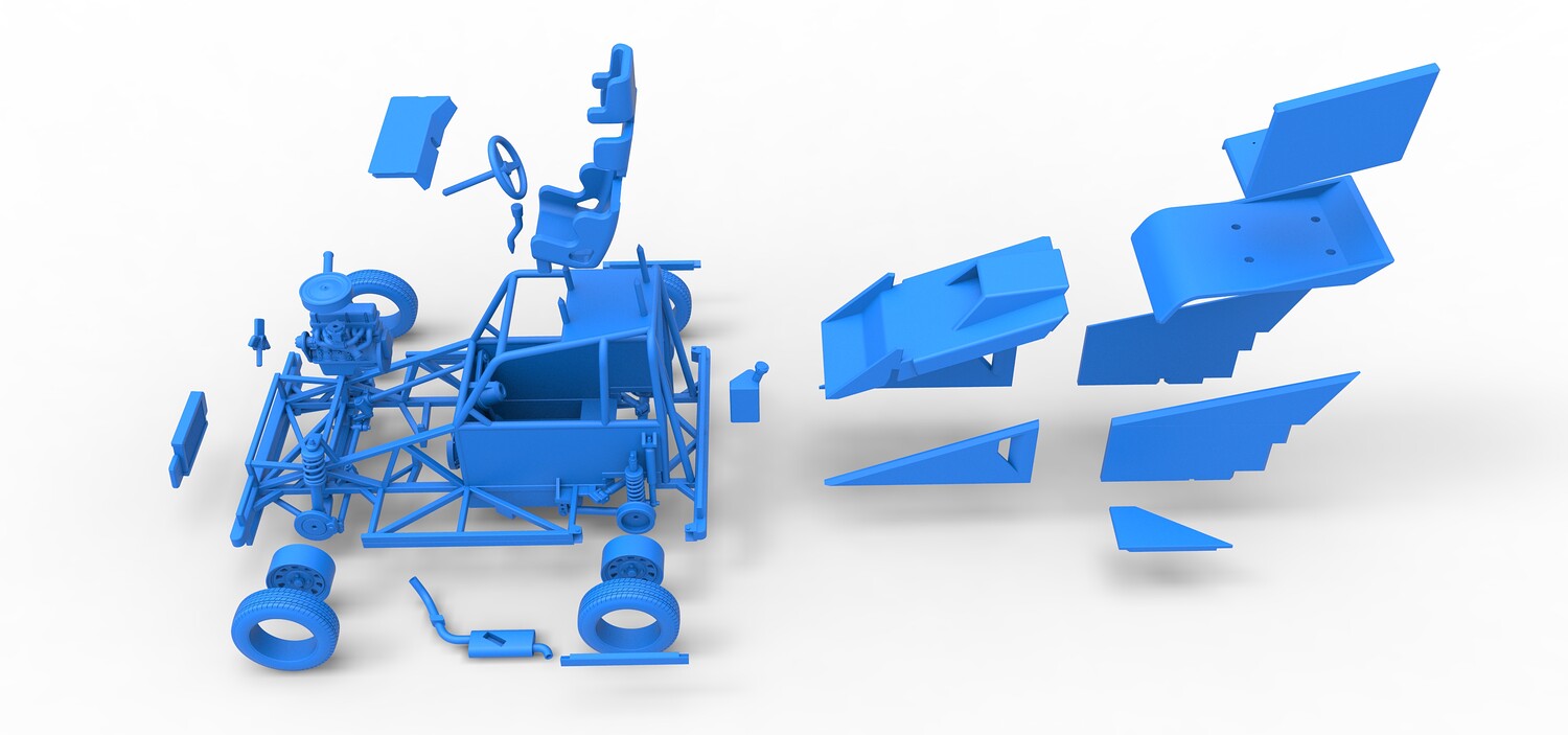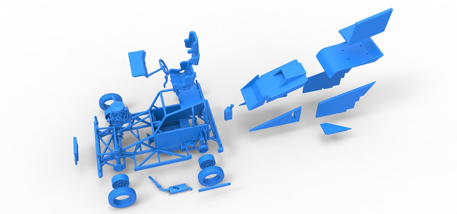 The model consists of parts: Air filter, Dashboard plate, Engine, Exhaust pipe, Fan, Frame, Hood, Left side plate 1-3, Radiator, Right side plate 1,2, Rims, Roof, Seat part 1,2, Shifter, Side bars, Steering wheel, Tank, Tire, Top wing.