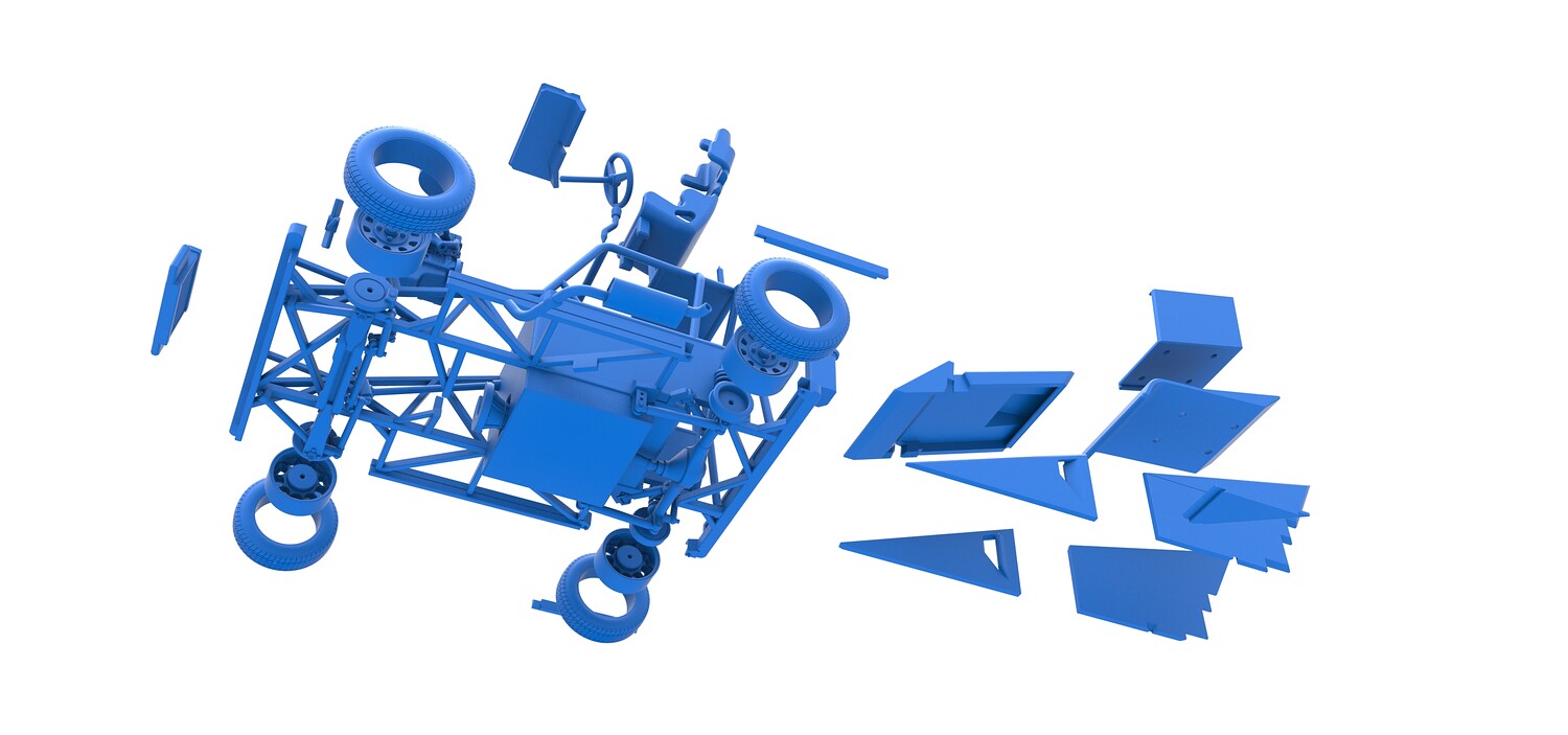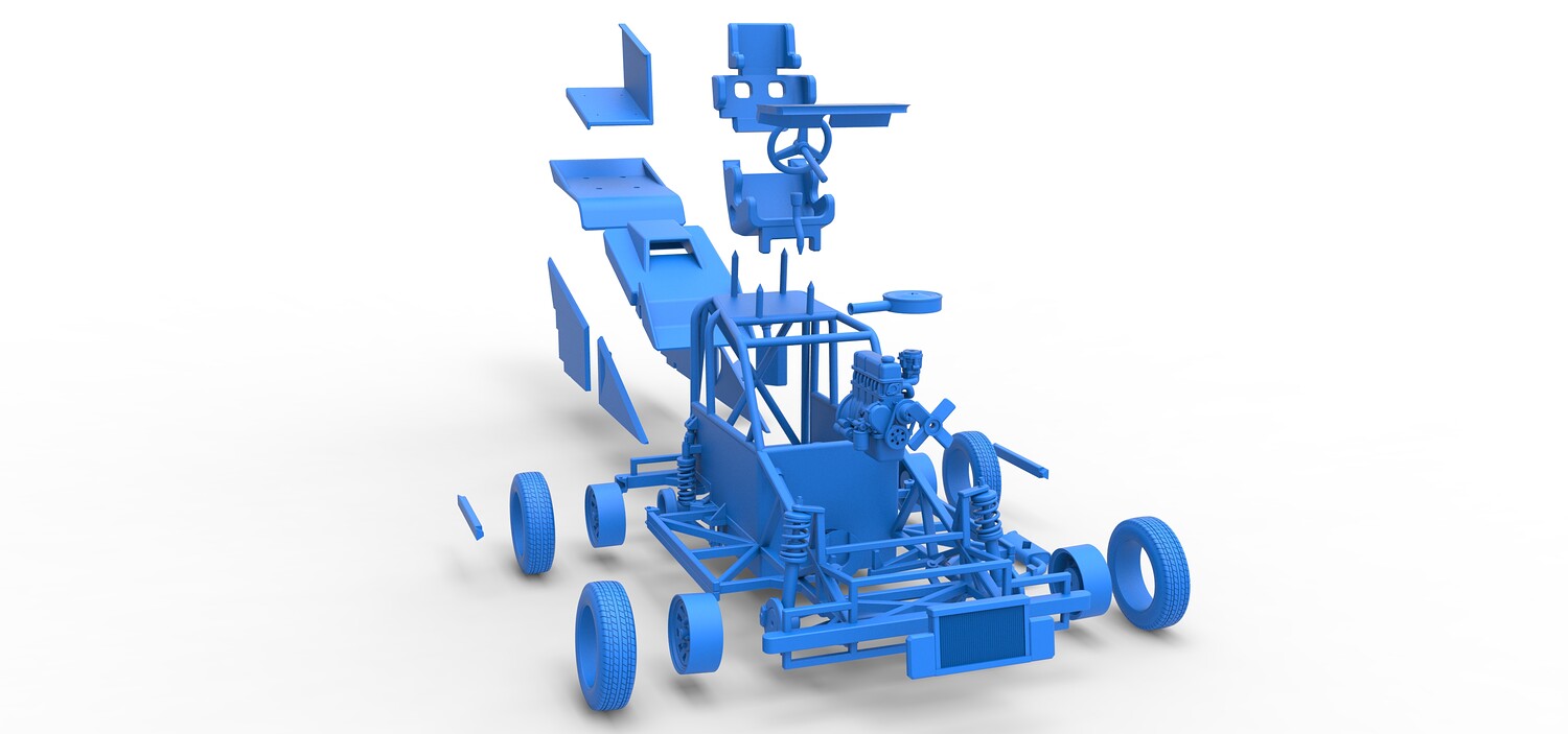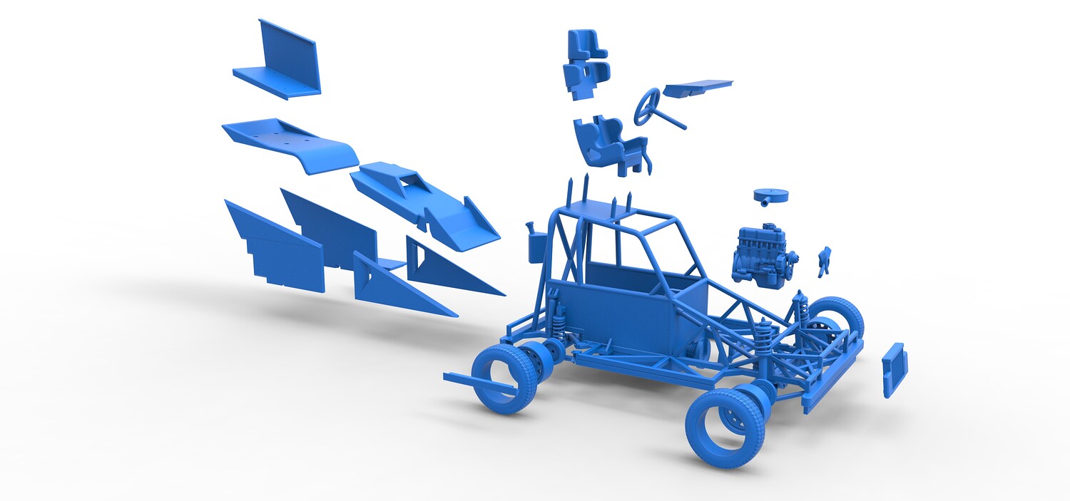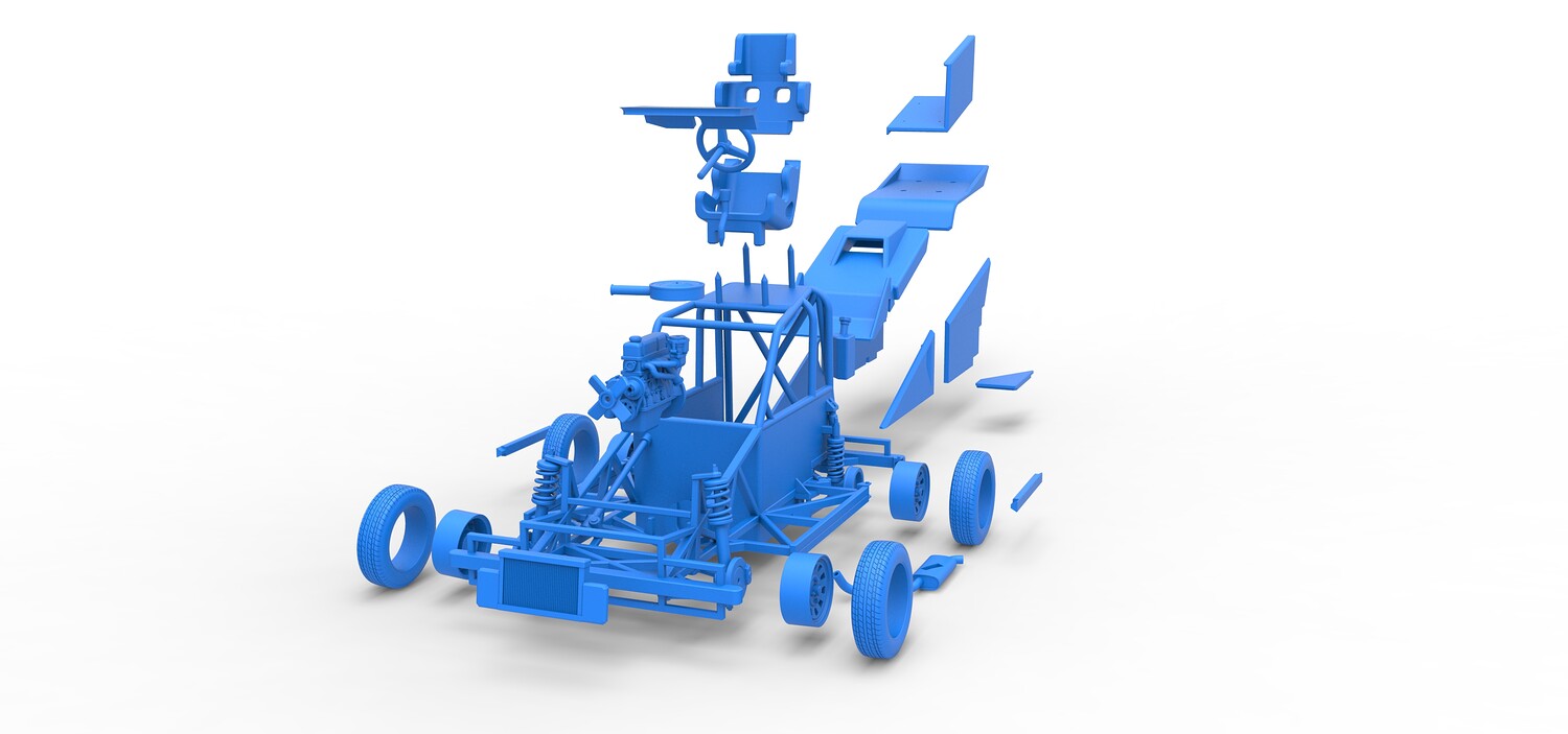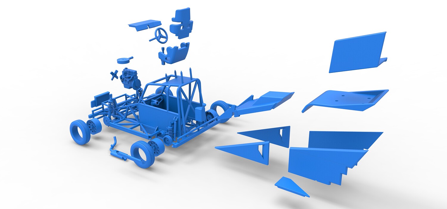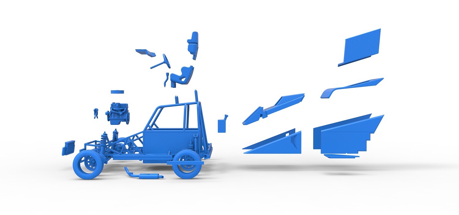 The model consists of parts: Air filter, Dashboard plate, Engine, Exhaust pipe, Fan, Frame, Hood, Left side plate 1-3, Radiator, Right side plate 1,2, Rims, Roof, Seat part 1,2, Shifter, Side bars, Steering wheel, Tank, Tire, Top wing.