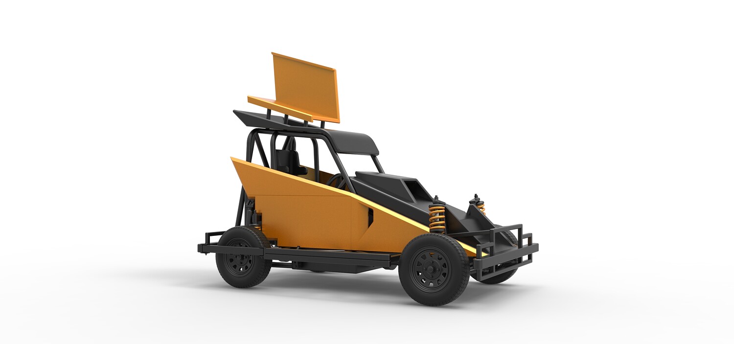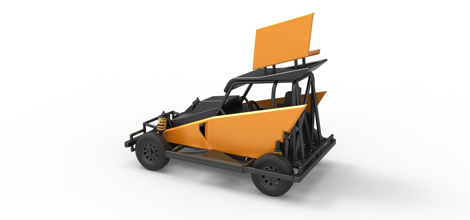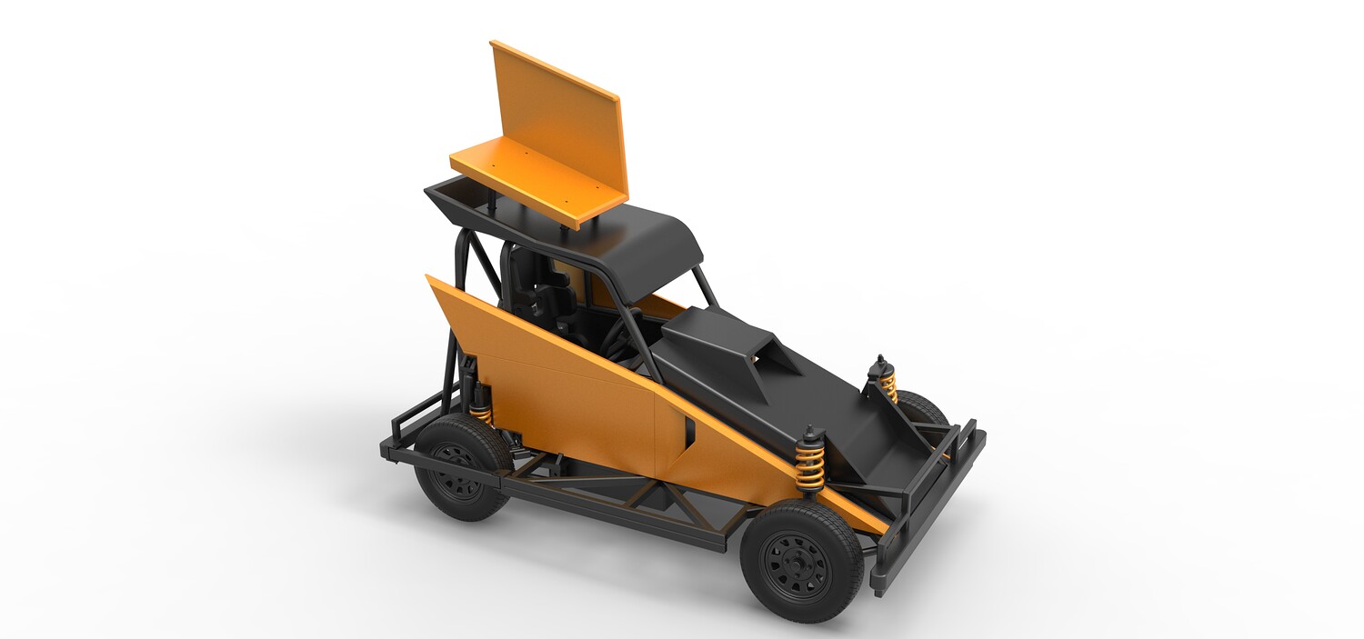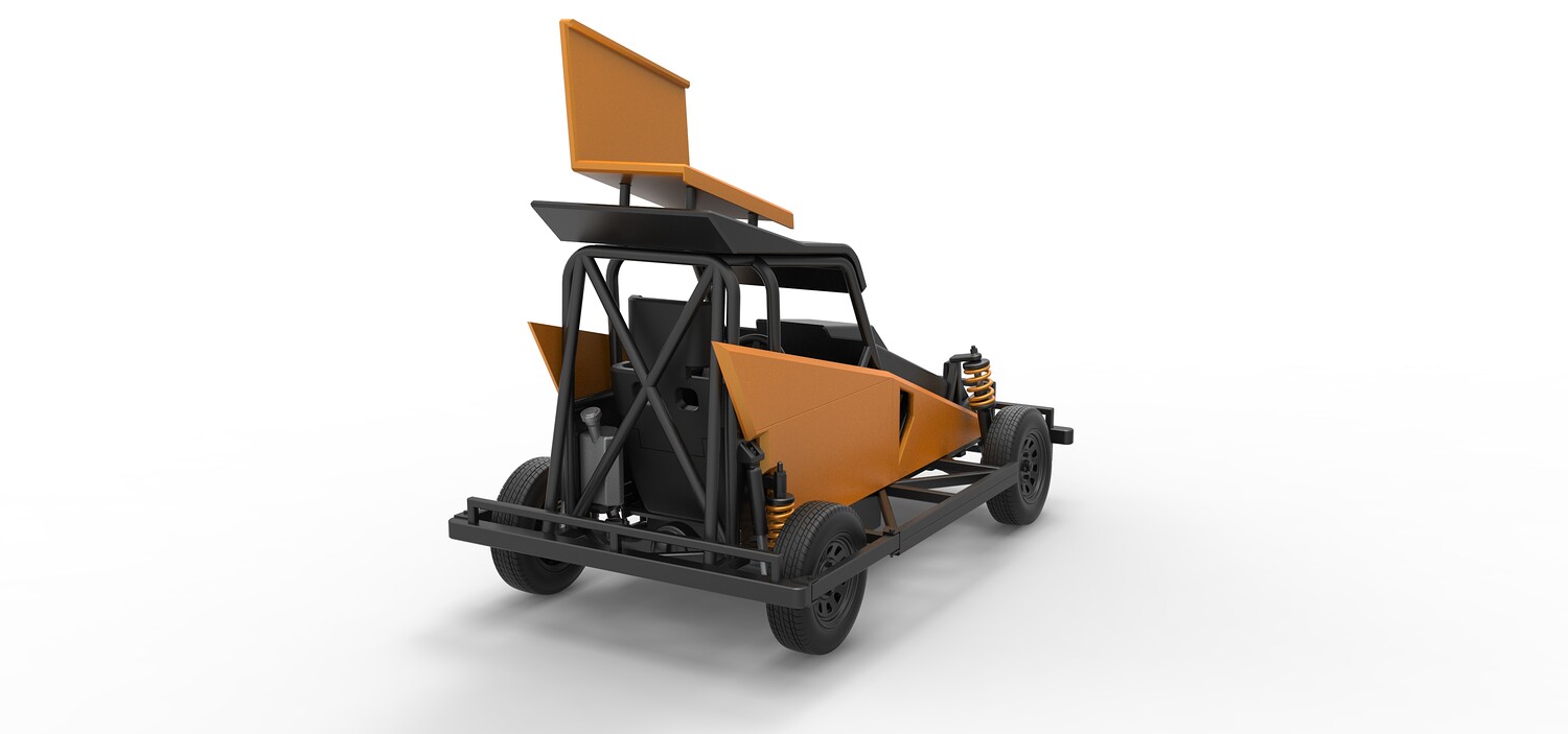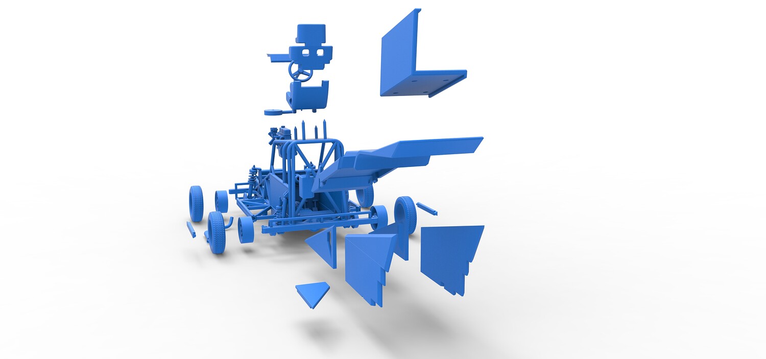 The model consists of parts: Air filter, Dashboard plate, Engine, Exhaust pipe, Fan, Frame, Hood, Left side plate 1-3, Radiator, Right side plate 1,2, Rims, Roof, Seat part 1,2, Shifter, Side bars, Steering wheel, Tank, Tire, Top wing.