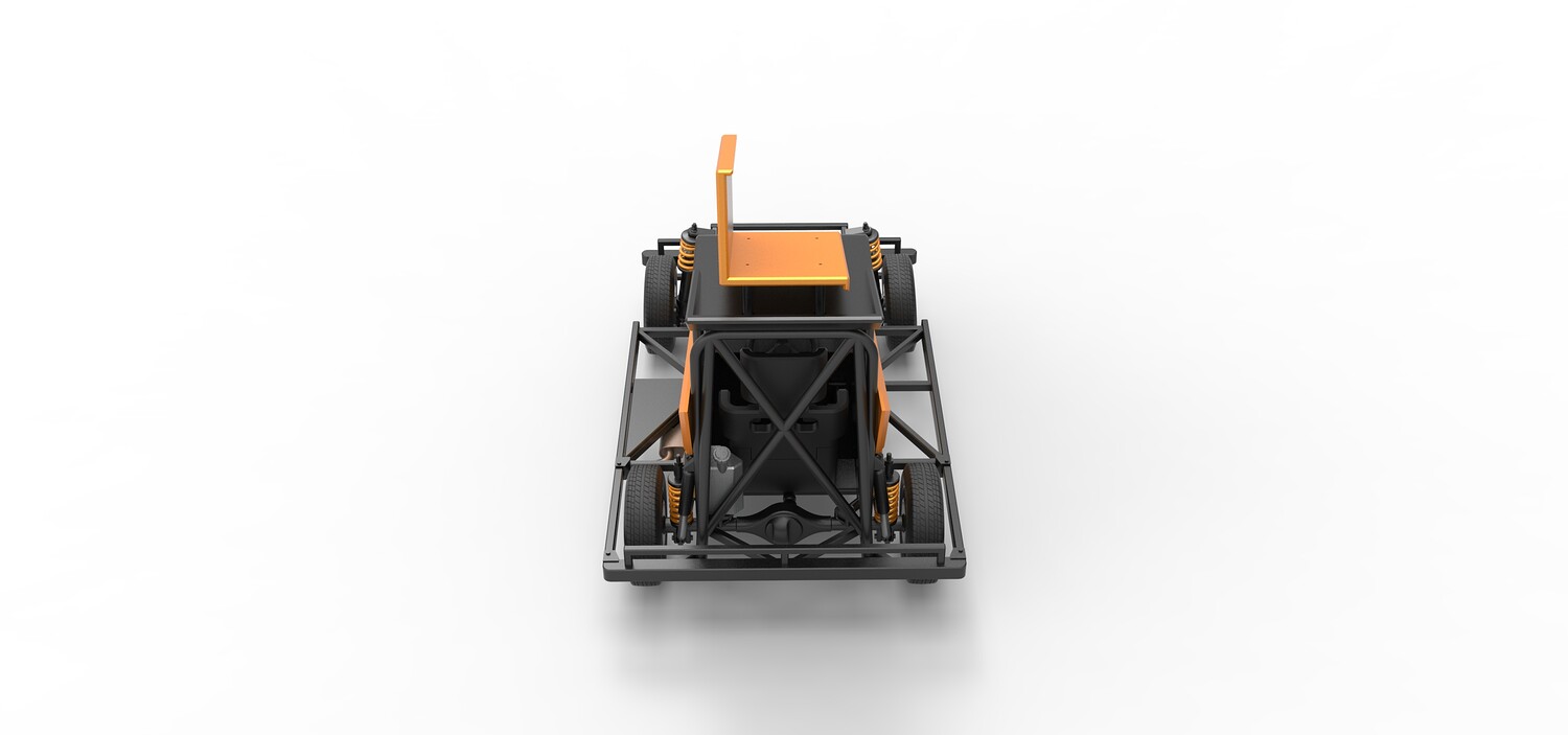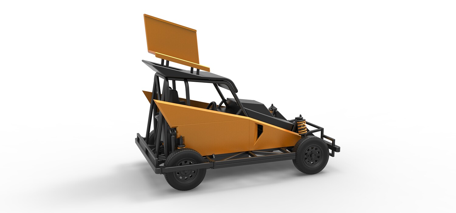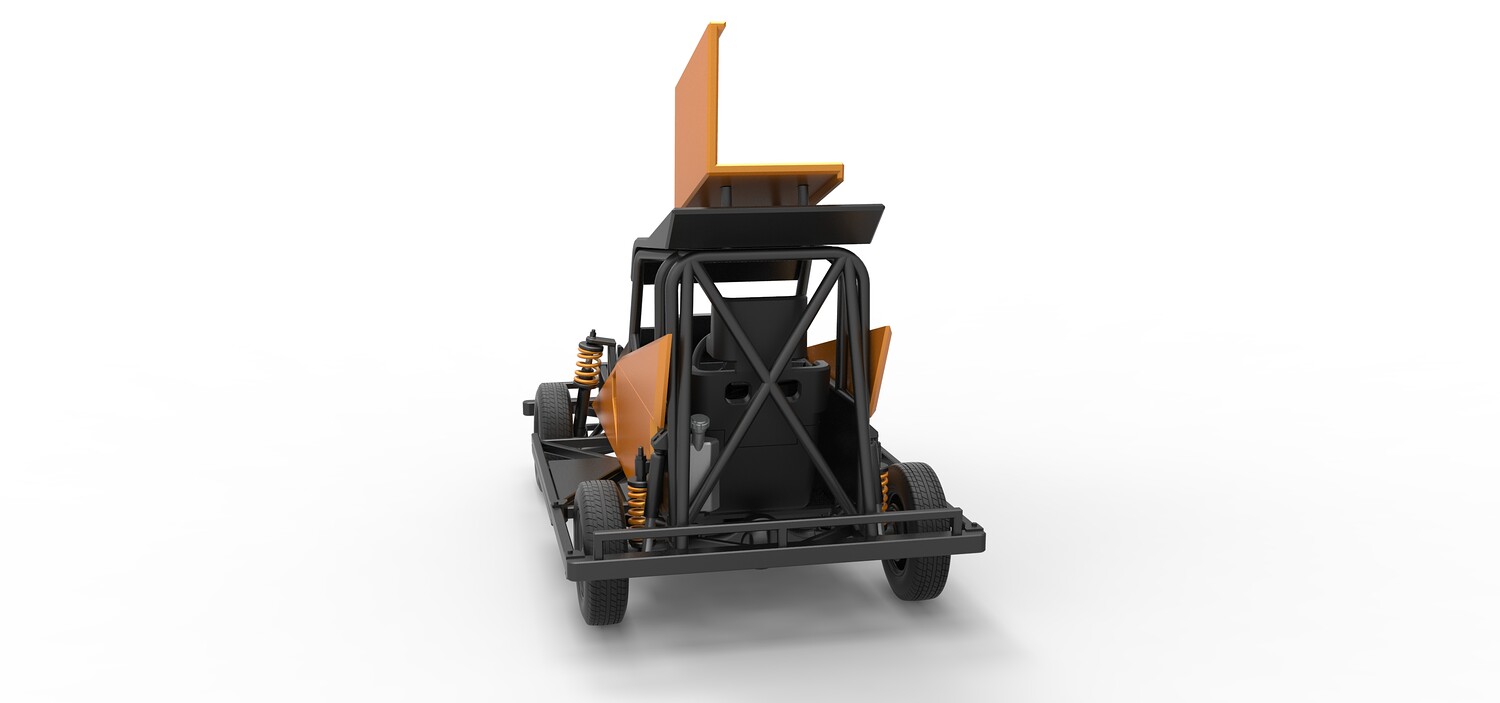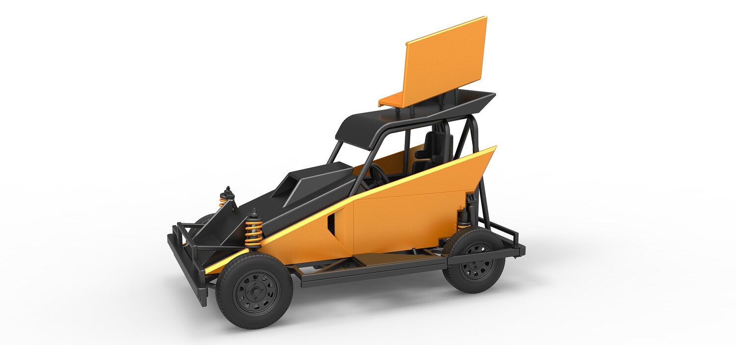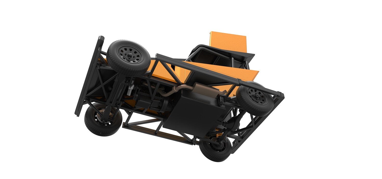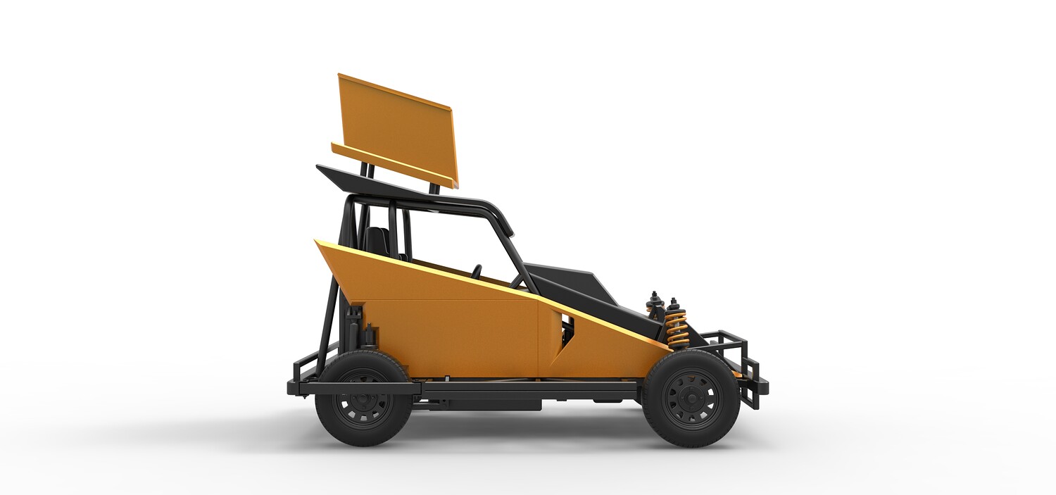 The model consists of parts: Air filter, Dashboard plate, Engine, Exhaust pipe, Fan, Frame, Hood, Left side plate 1-3, Radiator, Right side plate 1,2, Rims, Roof, Seat part 1,2, Shifter, Side bars, Steering wheel, Tank, Tire, Top wing.