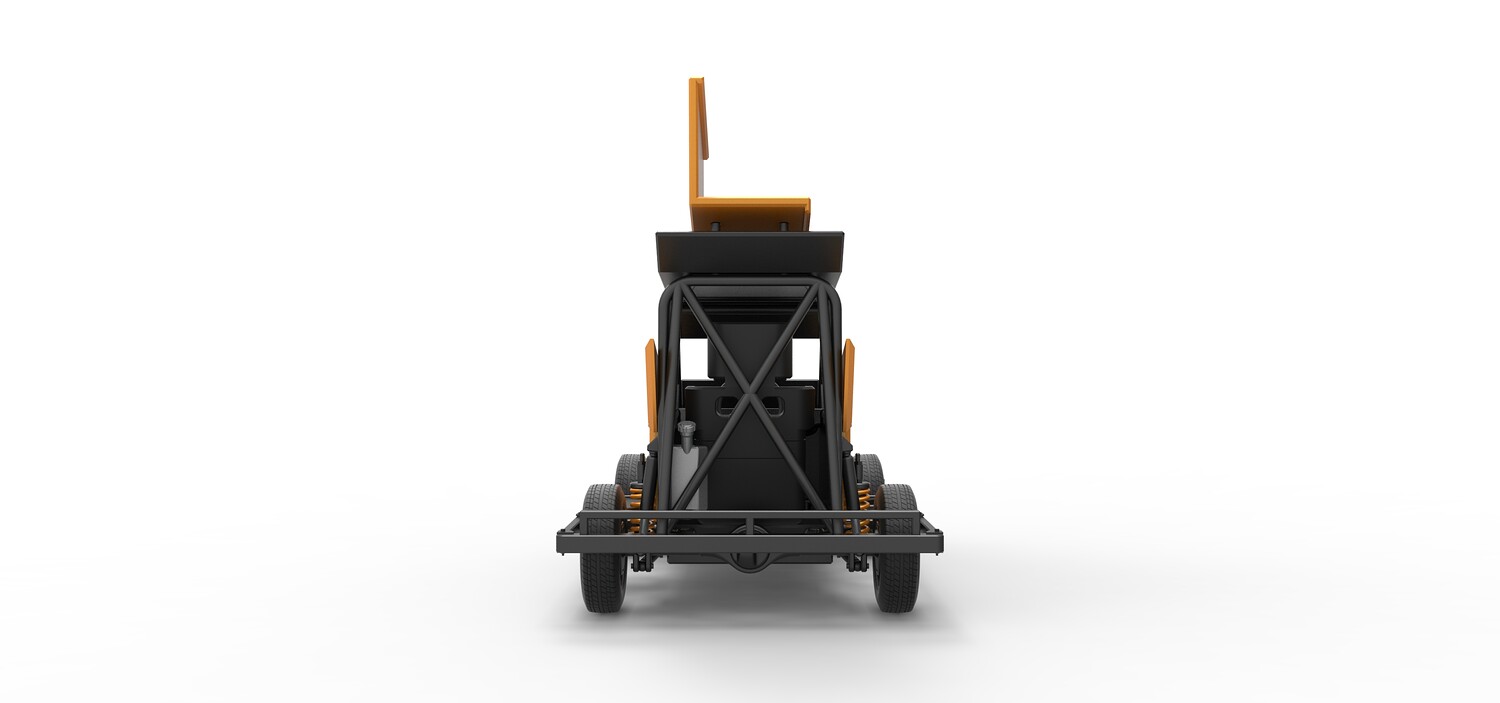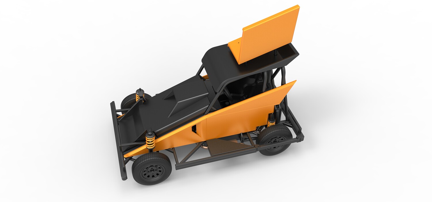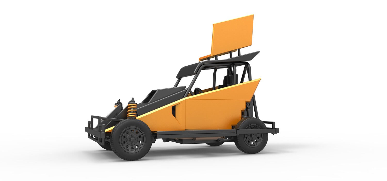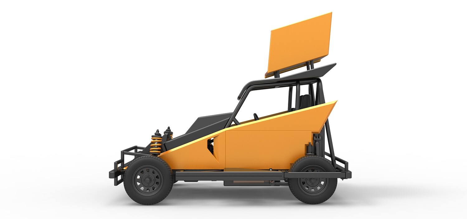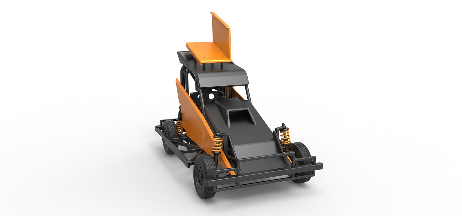 The model consists of parts: Air filter, Dashboard plate, Engine, Exhaust pipe, Fan, Frame, Hood, Left side plate 1-3, Radiator, Right side plate 1,2, Rims, Roof, Seat part 1,2, Shifter, Side bars, Steering wheel, Tank, Tire, Top wing.