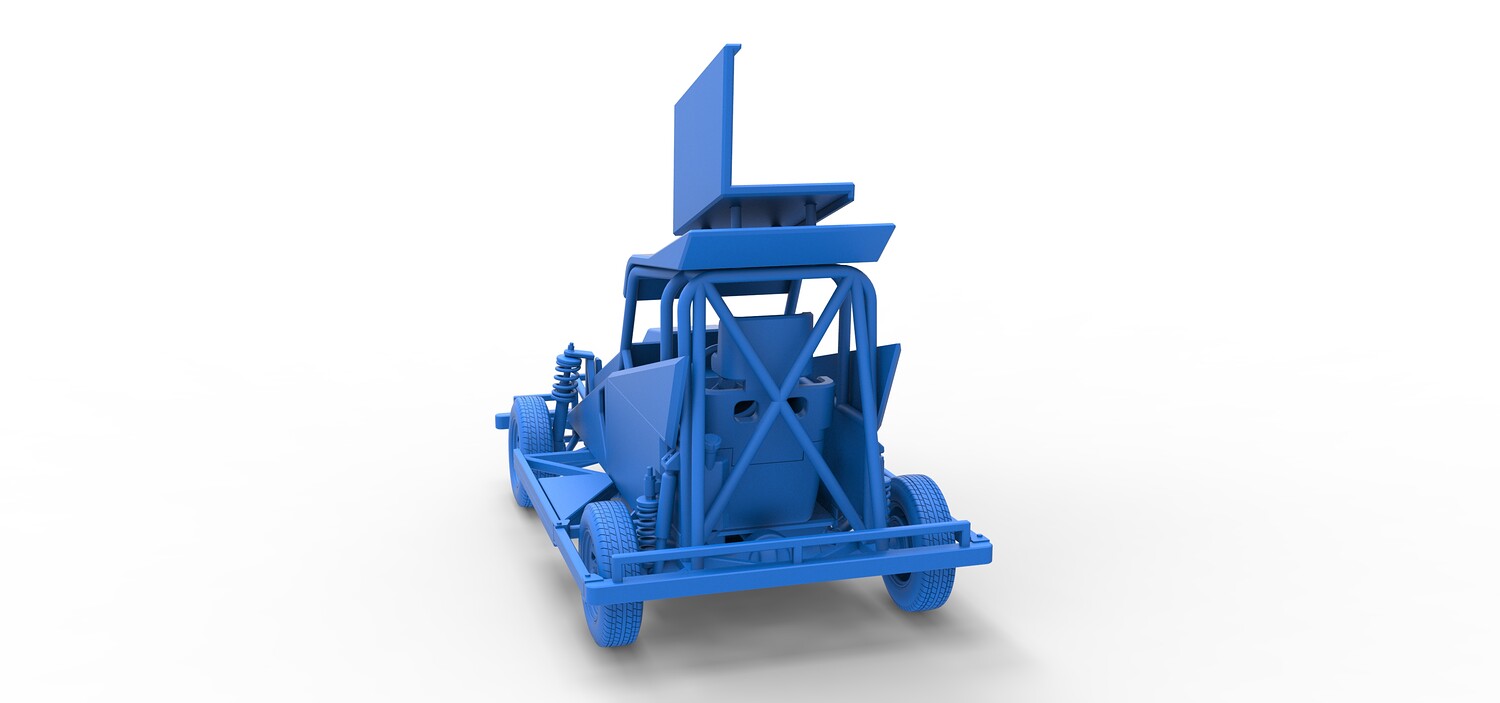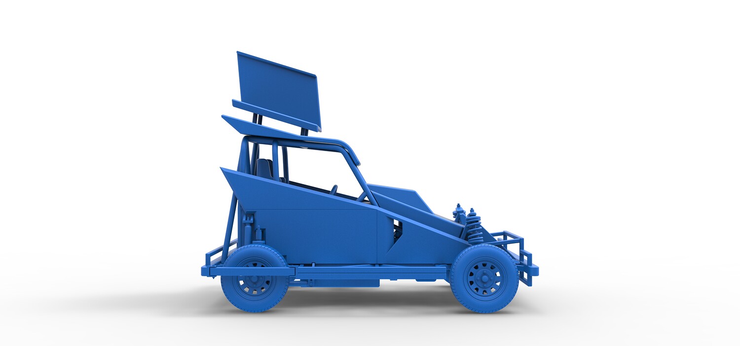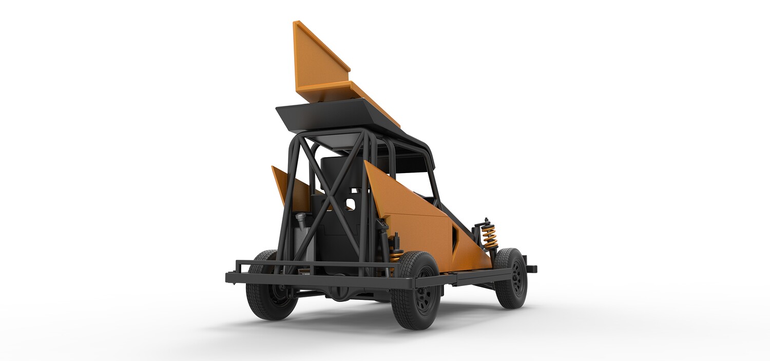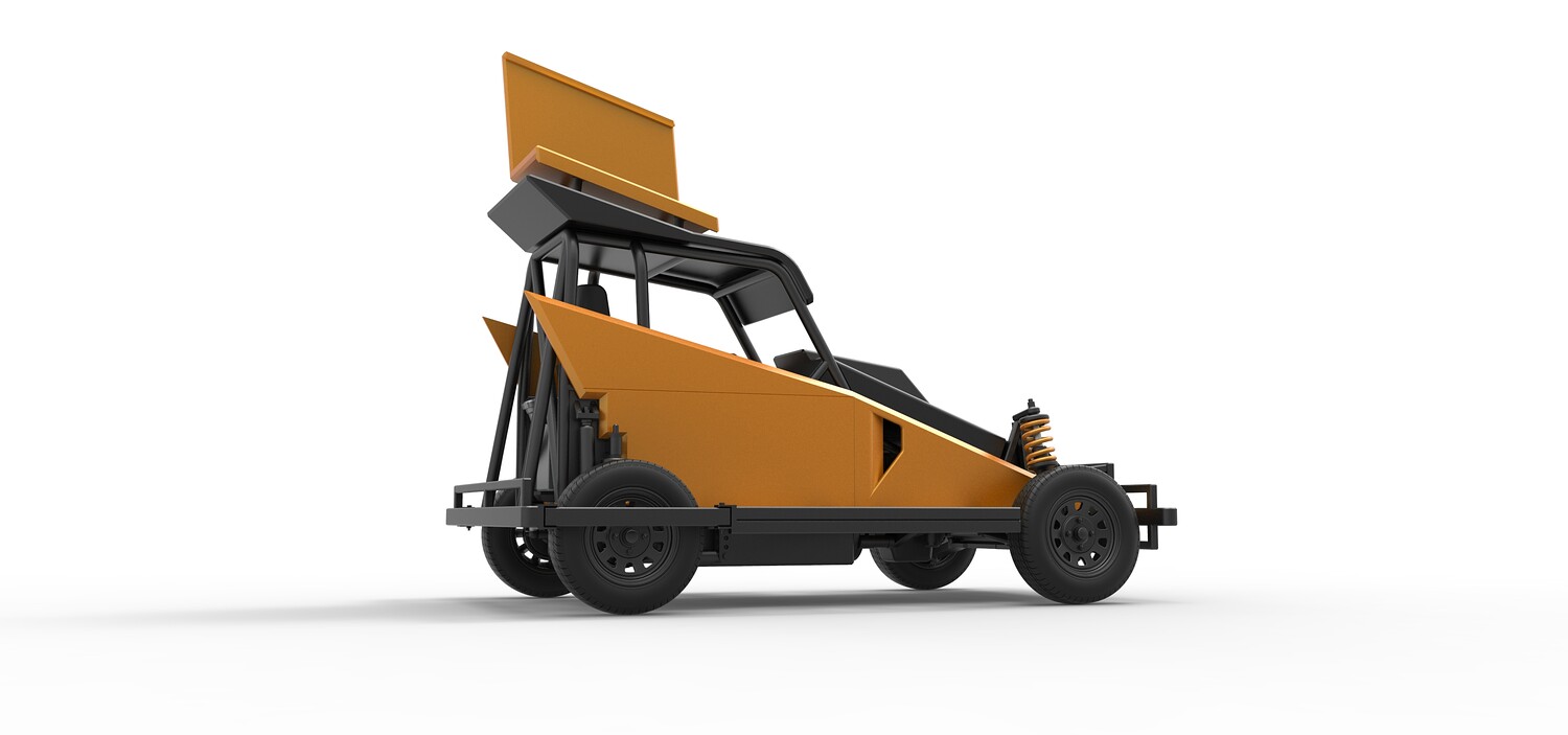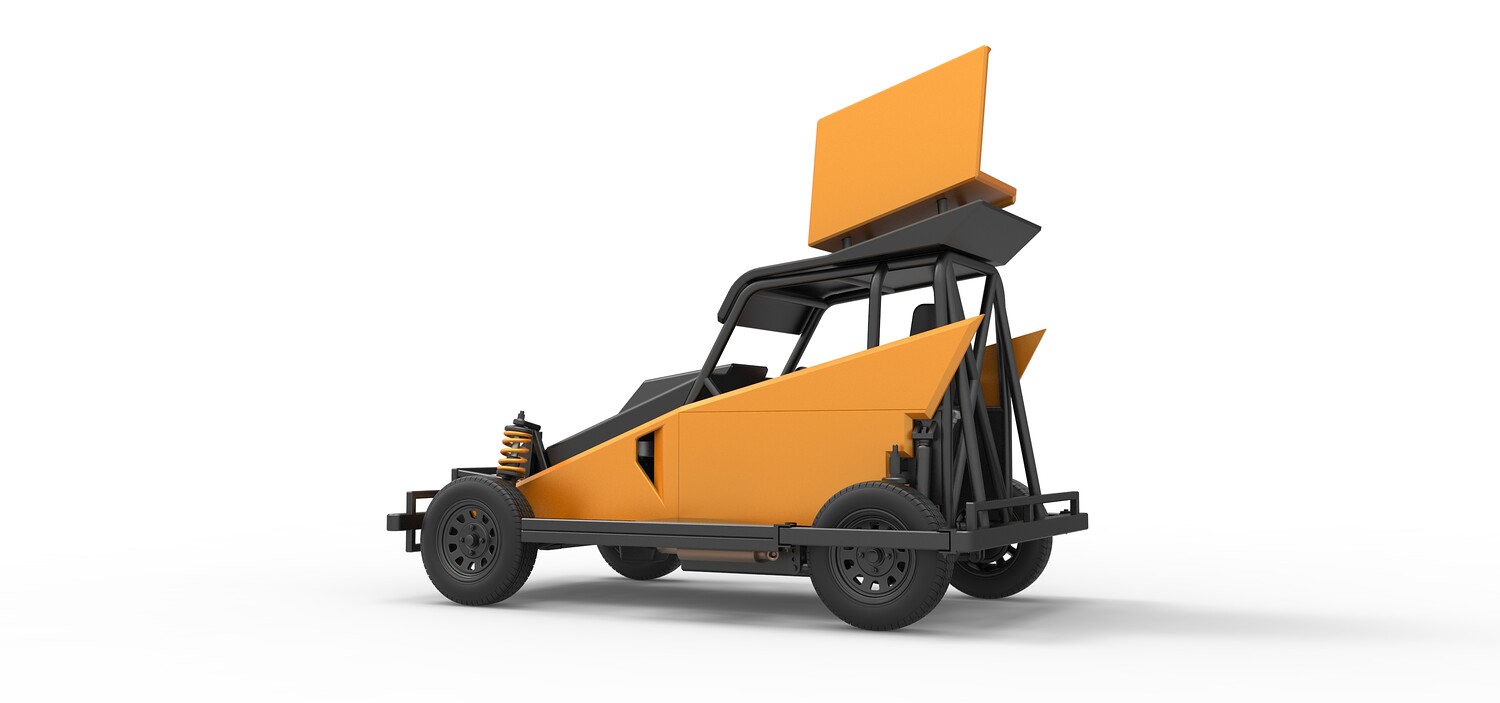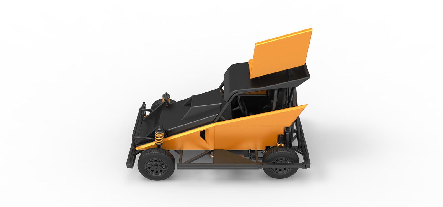 The model consists of parts: Air filter, Dashboard plate, Engine, Exhaust pipe, Fan, Frame, Hood, Left side plate 1-3, Radiator, Right side plate 1,2, Rims, Roof, Seat part 1,2, Shifter, Side bars, Steering wheel, Tank, Tire, Top wing.