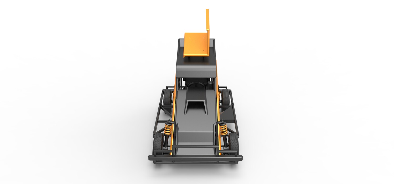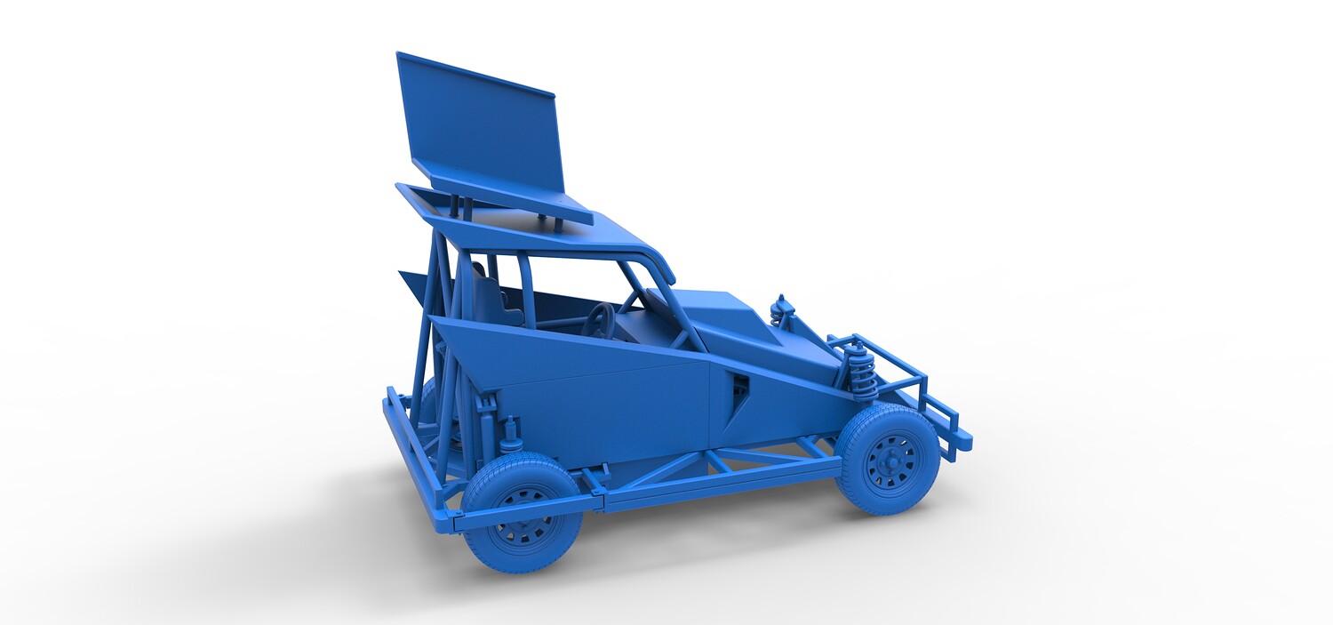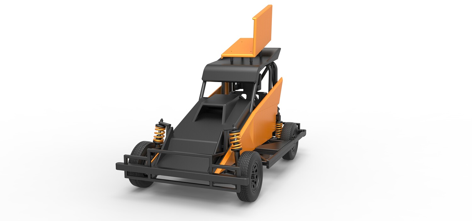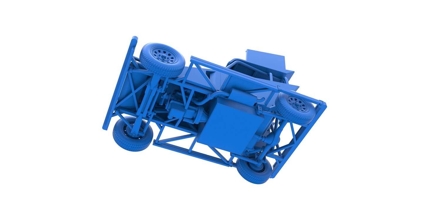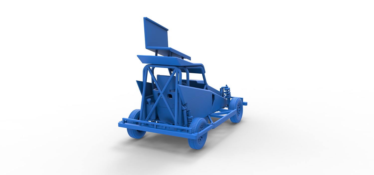 The model consists of parts: Air filter, Dashboard plate, Engine, Exhaust pipe, Fan, Frame, Hood, Left side plate 1-3, Radiator, Right side plate 1,2, Rims, Roof, Seat part 1,2, Shifter, Side bars, Steering wheel, Tank, Tire, Top wing.