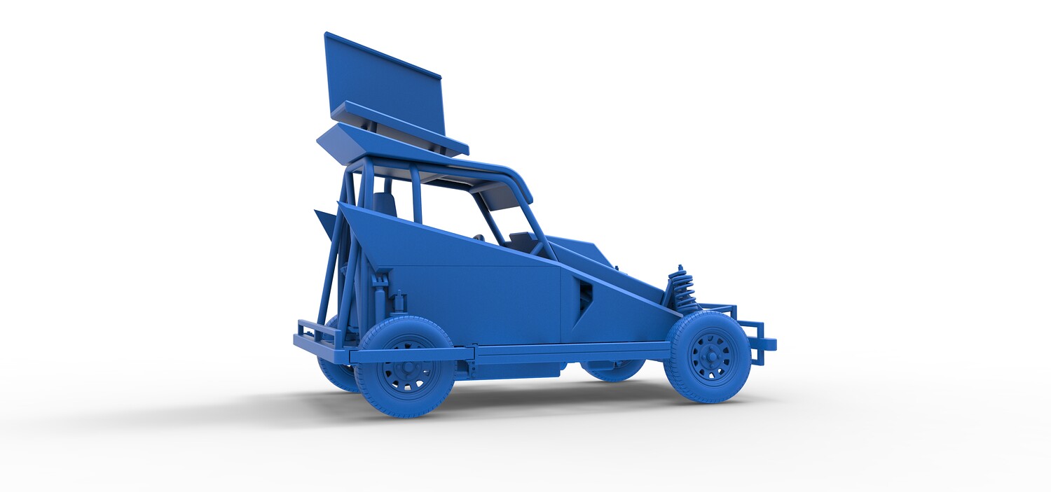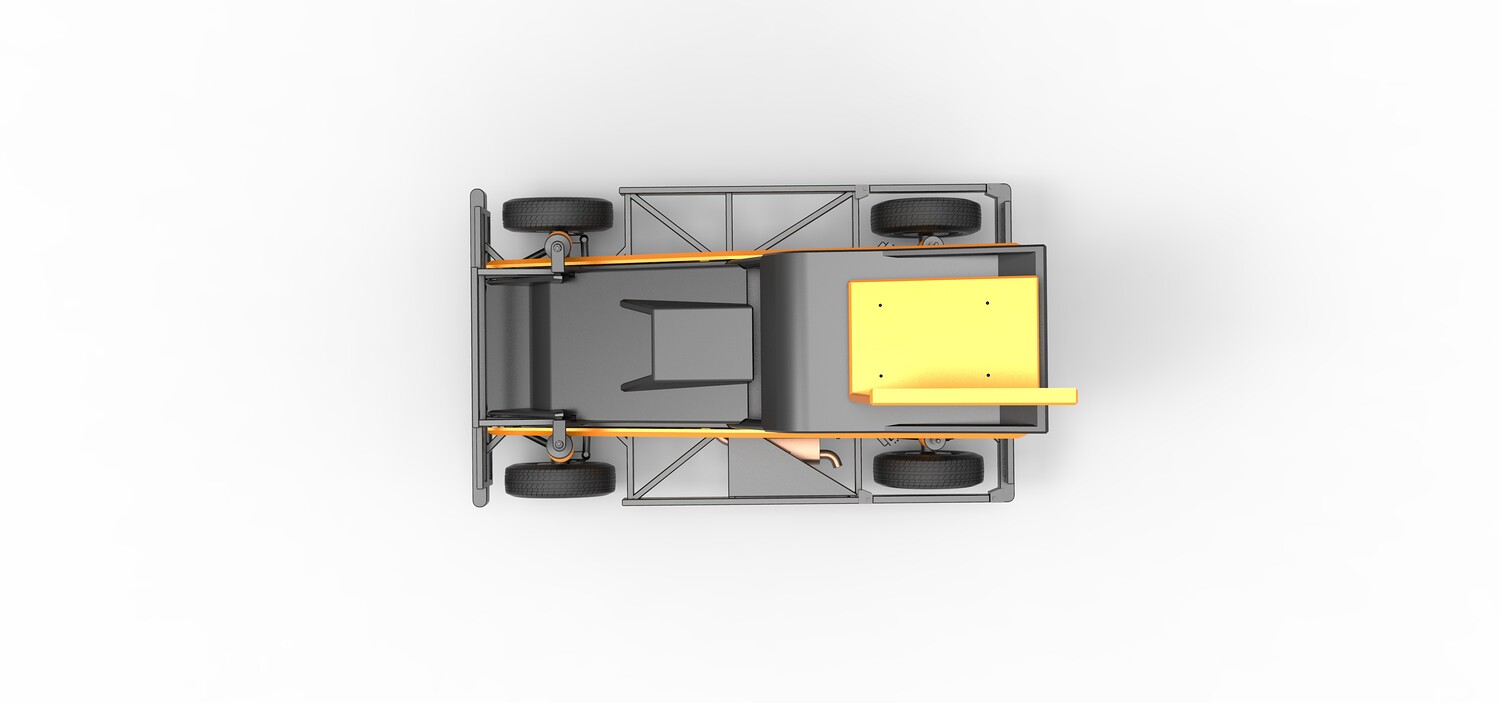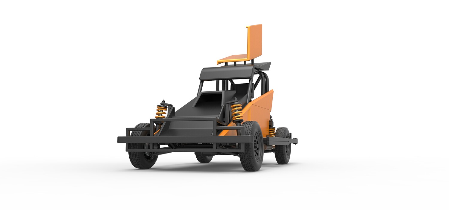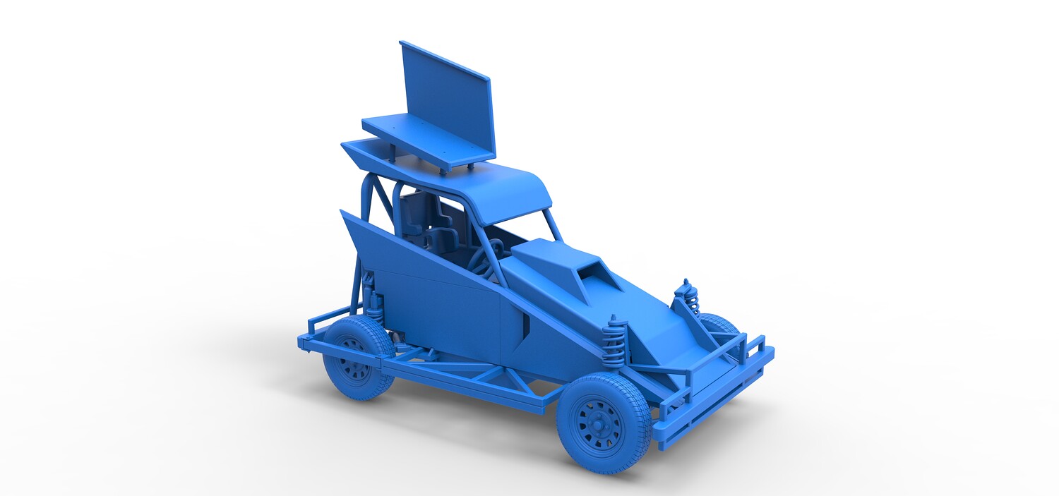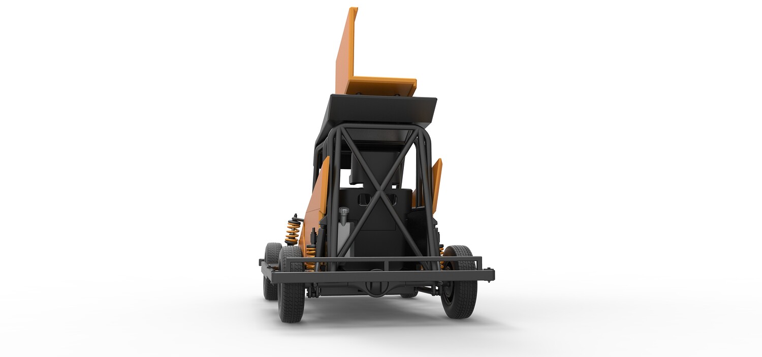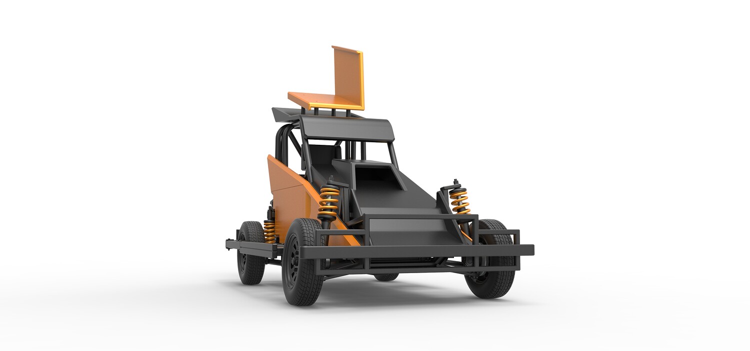 The model consists of parts: Air filter, Dashboard plate, Engine, Exhaust pipe, Fan, Frame, Hood, Left side plate 1-3, Radiator, Right side plate 1,2, Rims, Roof, Seat part 1,2, Shifter, Side bars, Steering wheel, Tank, Tire, Top wing.