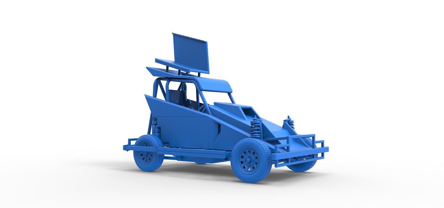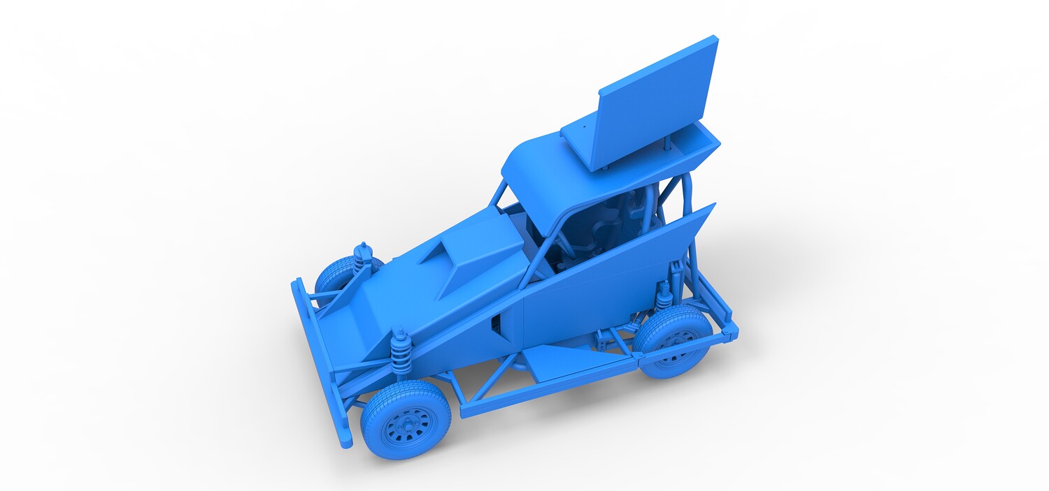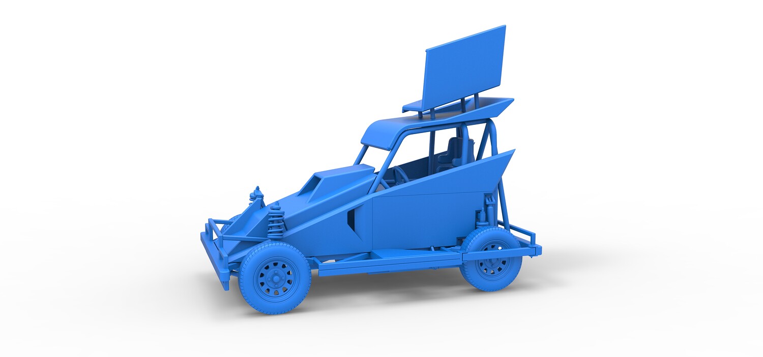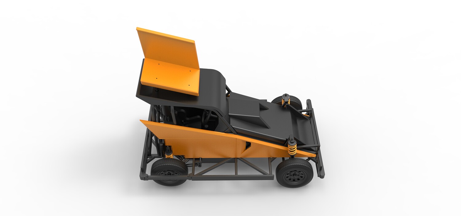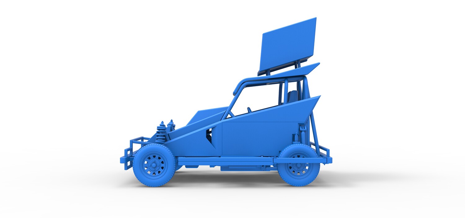 The model consists of parts: Air filter, Dashboard plate, Engine, Exhaust pipe, Fan, Frame, Hood, Left side plate 1-3, Radiator, Right side plate 1,2, Rims, Roof, Seat part 1,2, Shifter, Side bars, Steering wheel, Tank, Tire, Top wing.