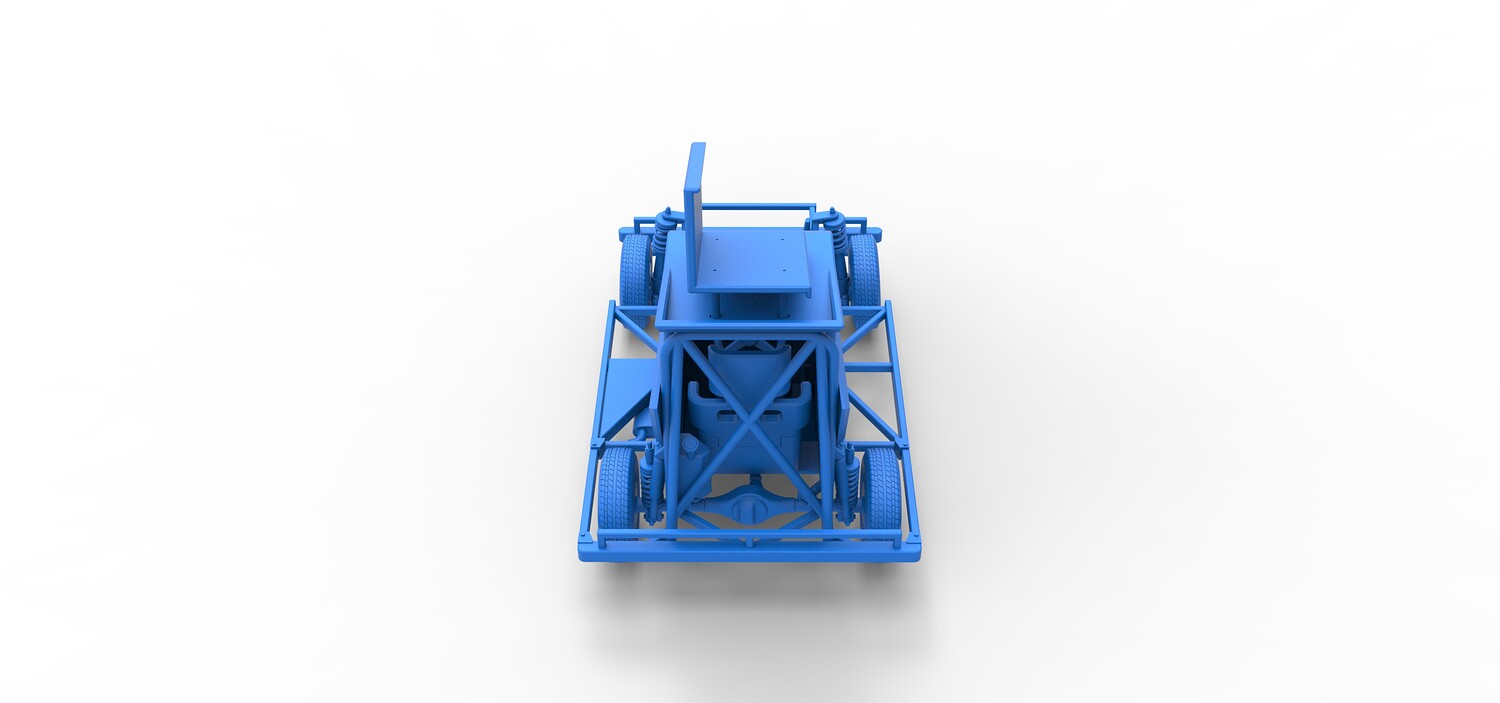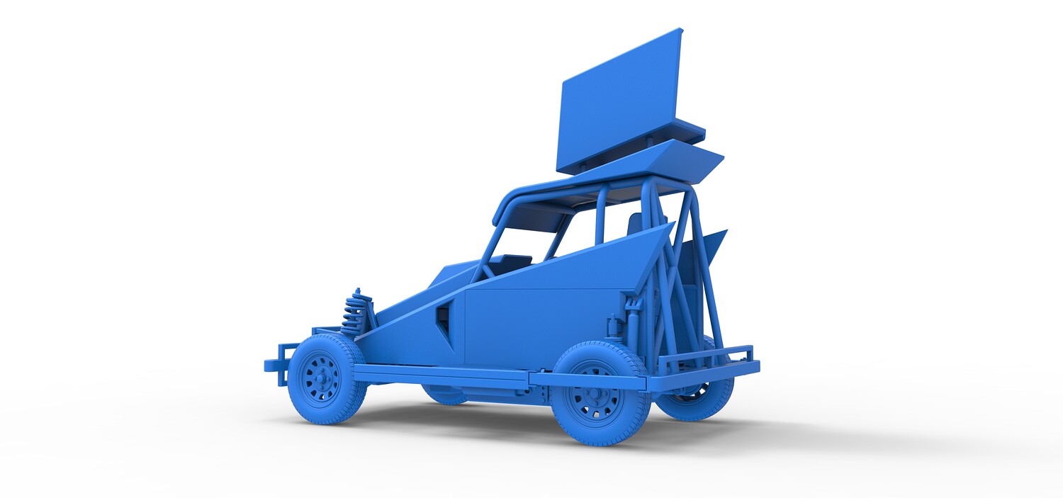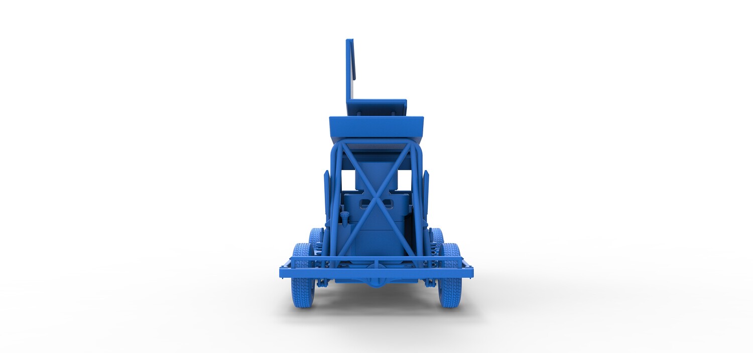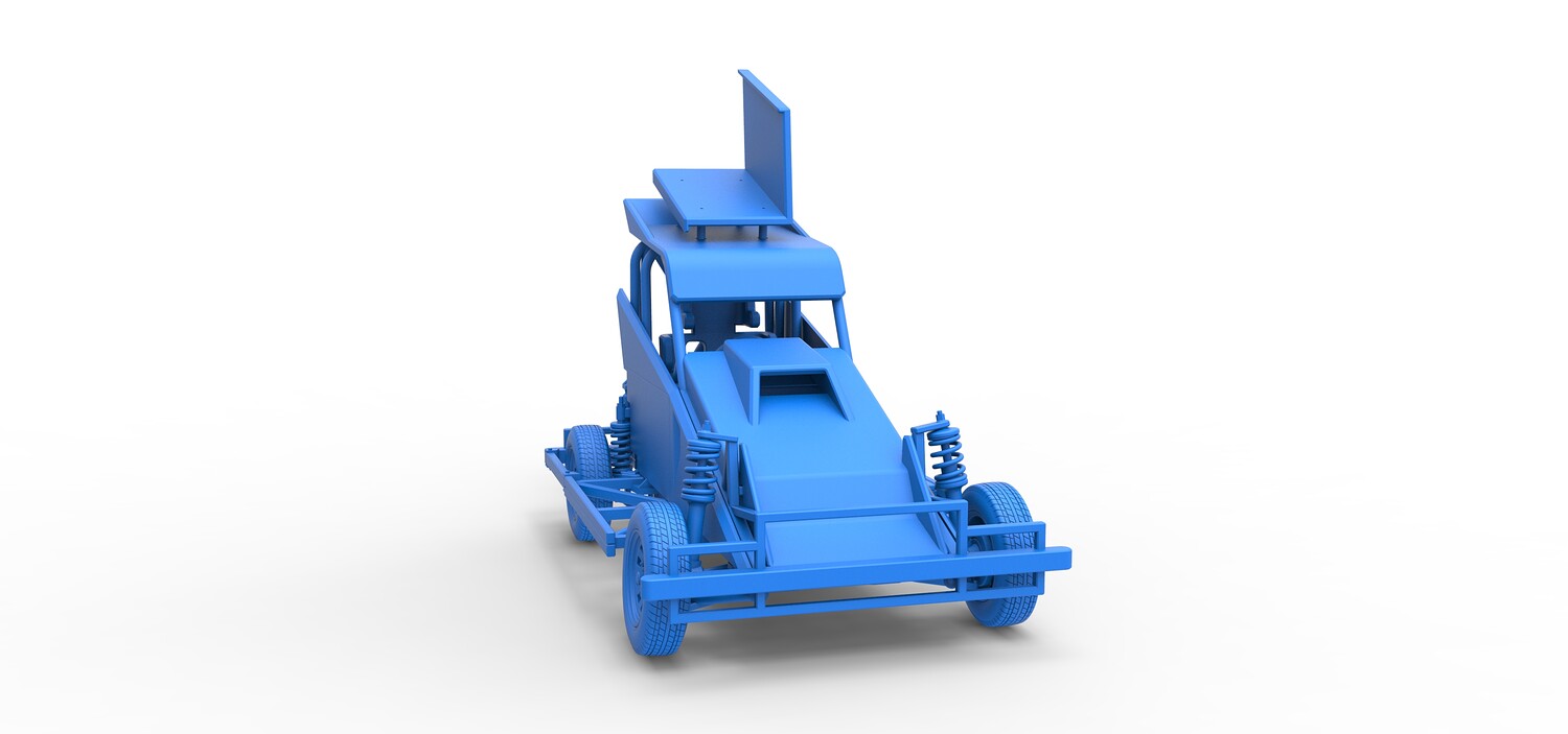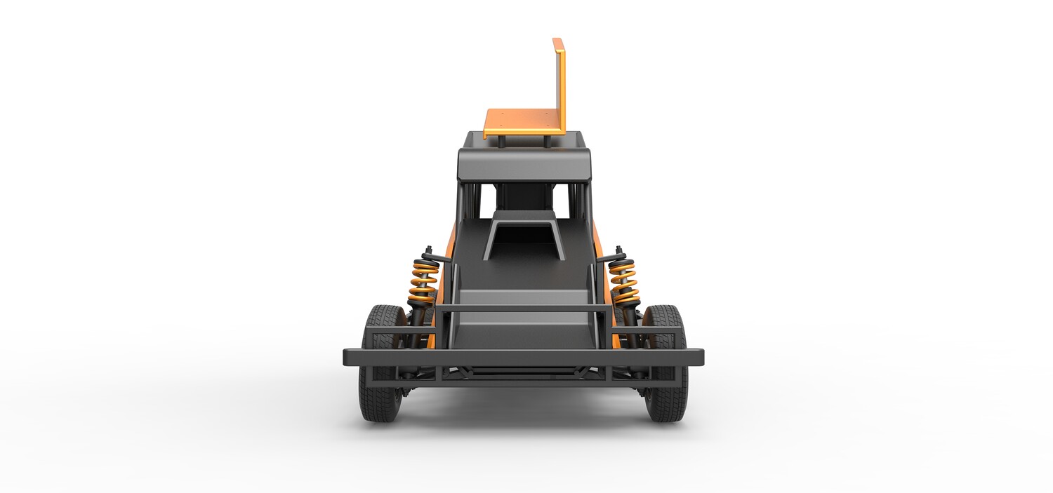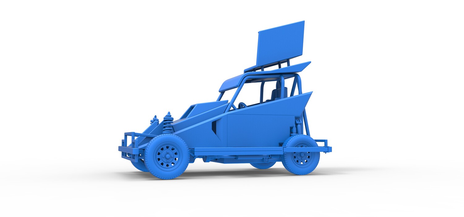 The model consists of parts: Air filter, Dashboard plate, Engine, Exhaust pipe, Fan, Frame, Hood, Left side plate 1-3, Radiator, Right side plate 1,2, Rims, Roof, Seat part 1,2, Shifter, Side bars, Steering wheel, Tank, Tire, Top wing.