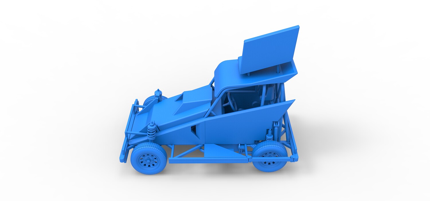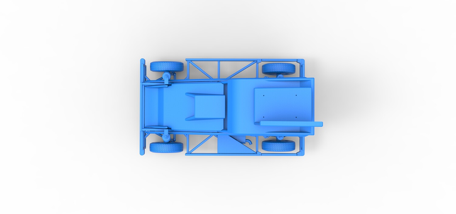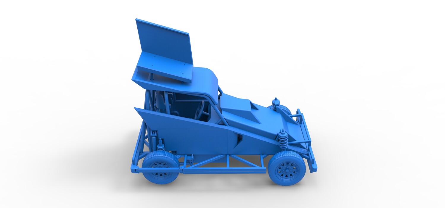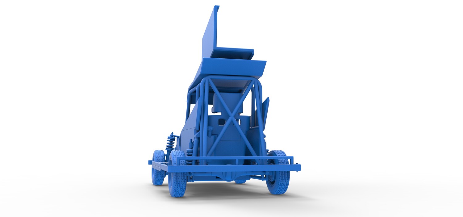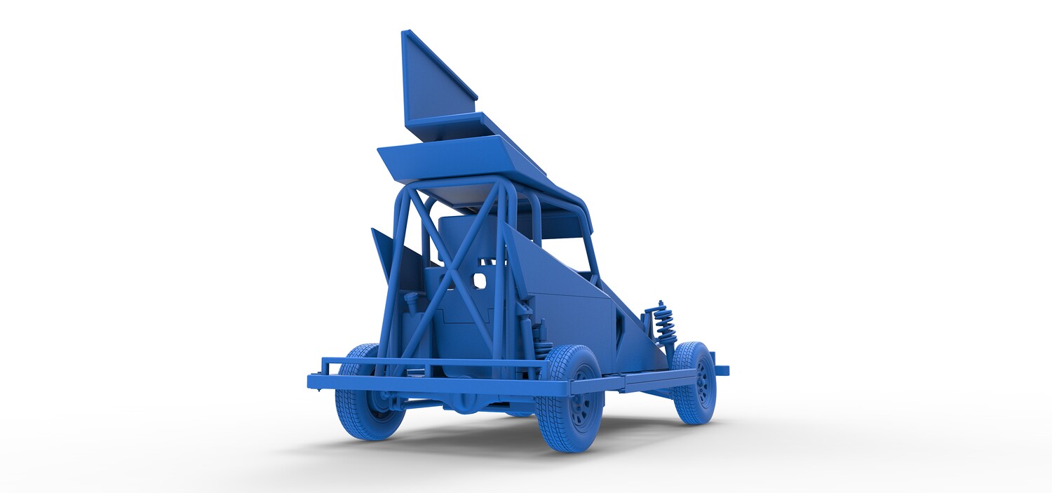 The model consists of parts: Air filter, Dashboard plate, Engine, Exhaust pipe, Fan, Frame, Hood, Left side plate 1-3, Radiator, Right side plate 1,2, Rims, Roof, Seat part 1,2, Shifter, Side bars, Steering wheel, Tank, Tire, Top wing.
