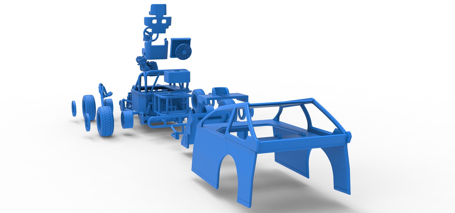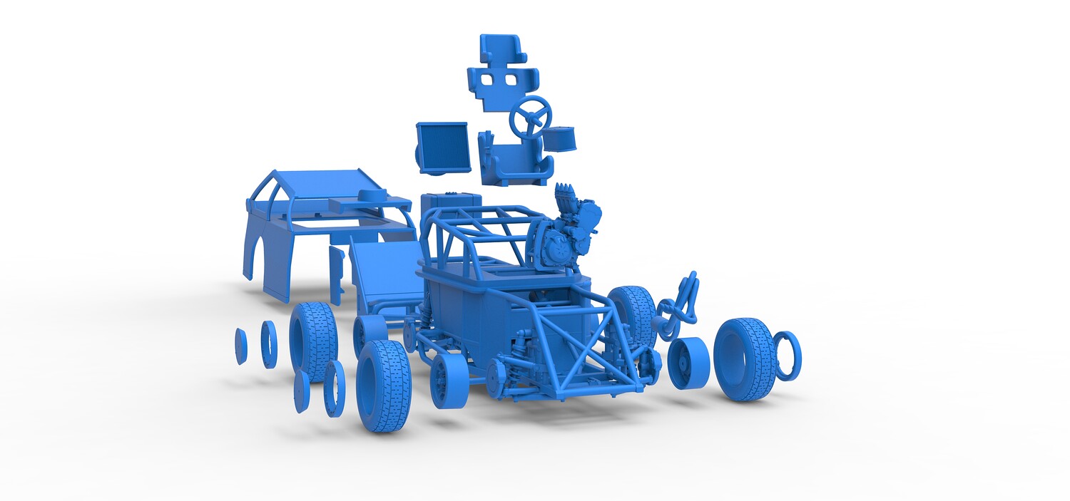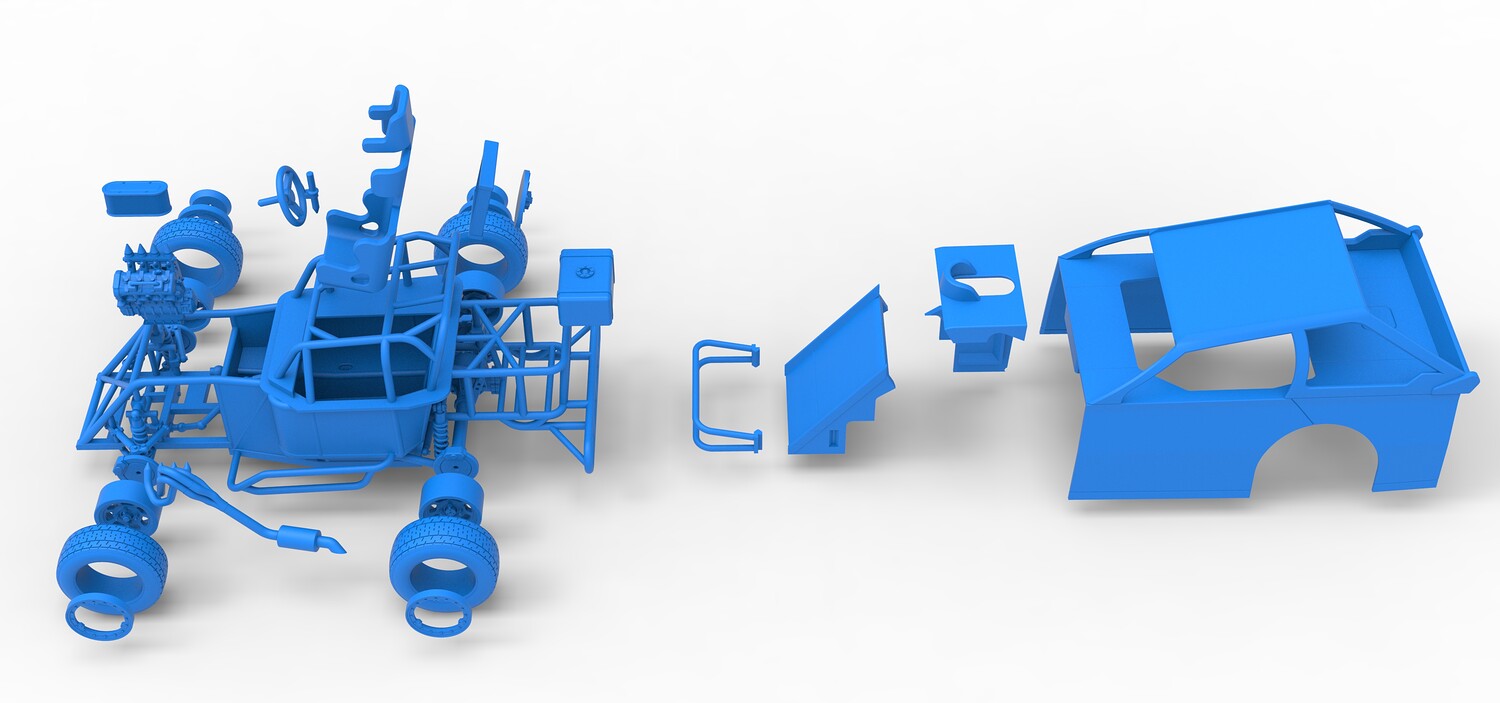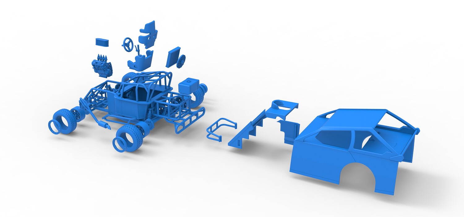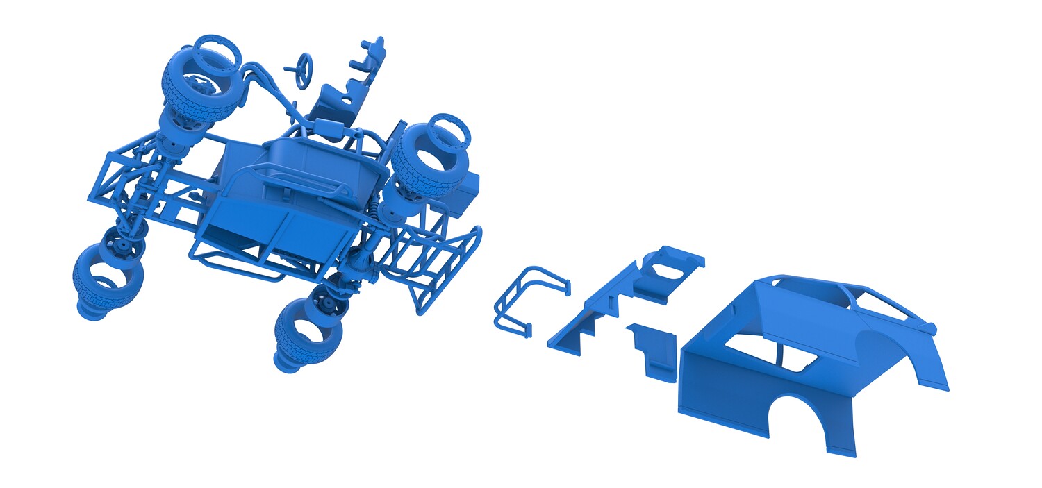 The model consists of parts: Air filter, Beadlock rings, Beadlock rings for mud guard, Engine, Exhaust, Fan, Frame, Front bumper, Front rims, Front tires, Hood, Mud guards, Nose, Radiator, Rear rims, Rear tires, Seat part 1,2, Shell main part, Shell side pannel, Shifter, Steering wheel, Tank.