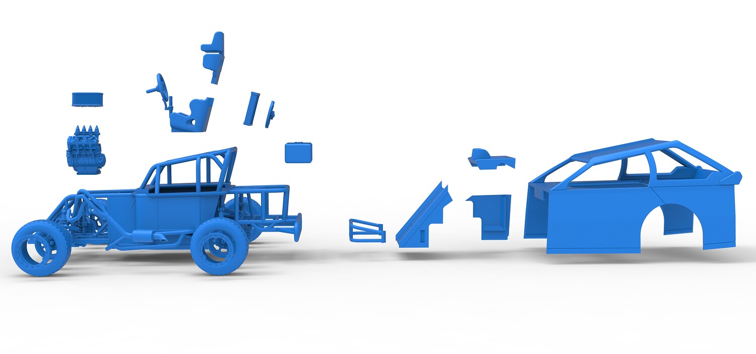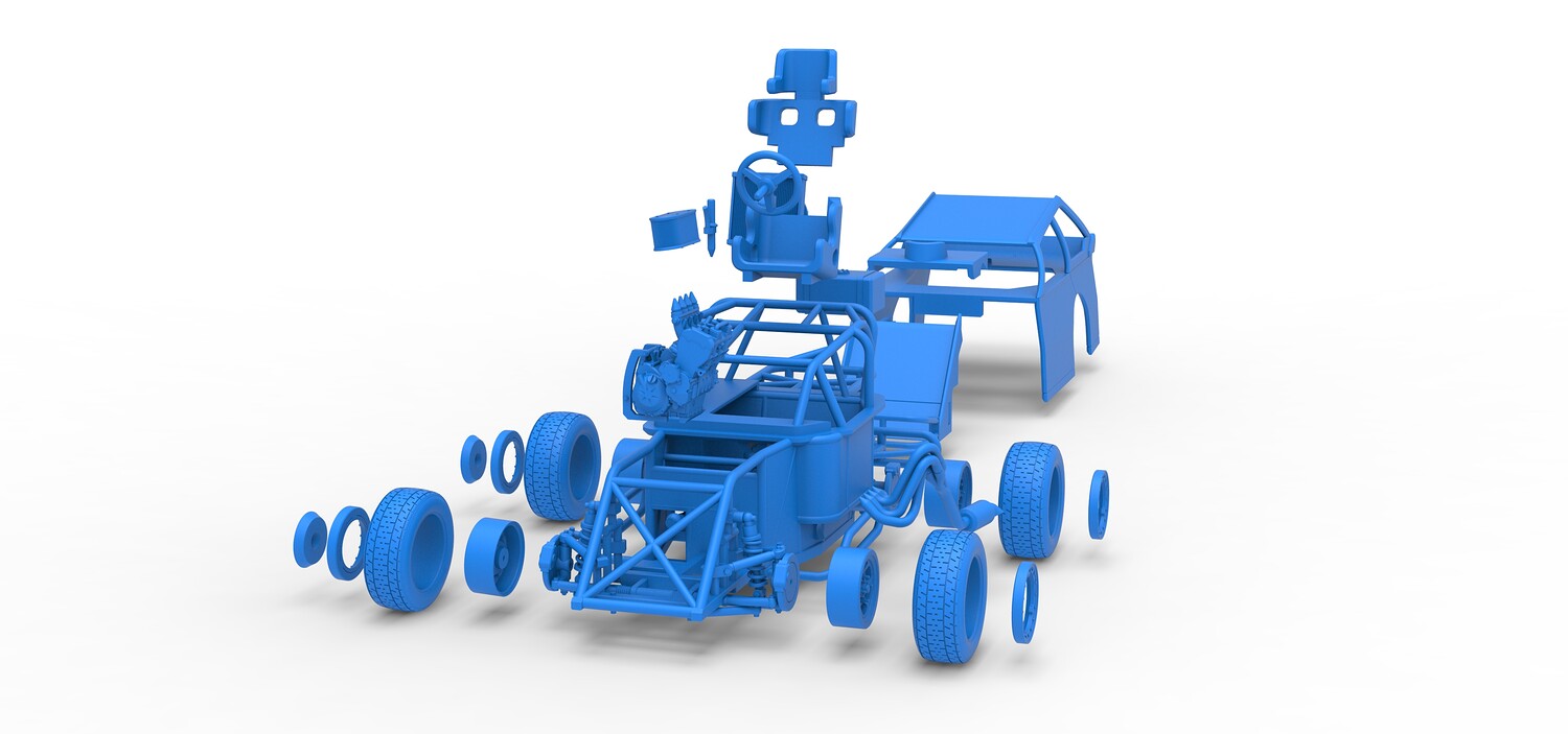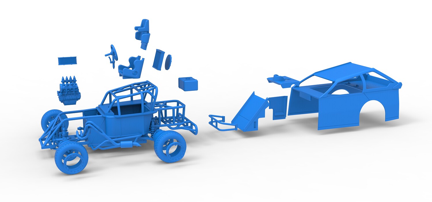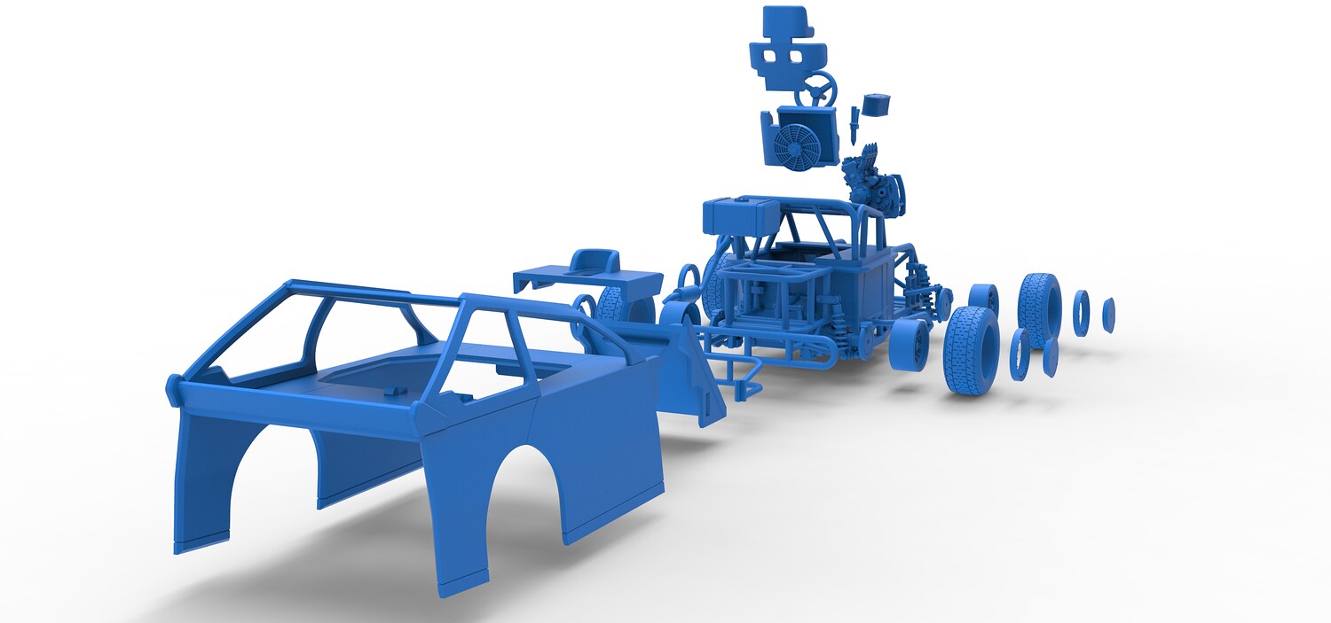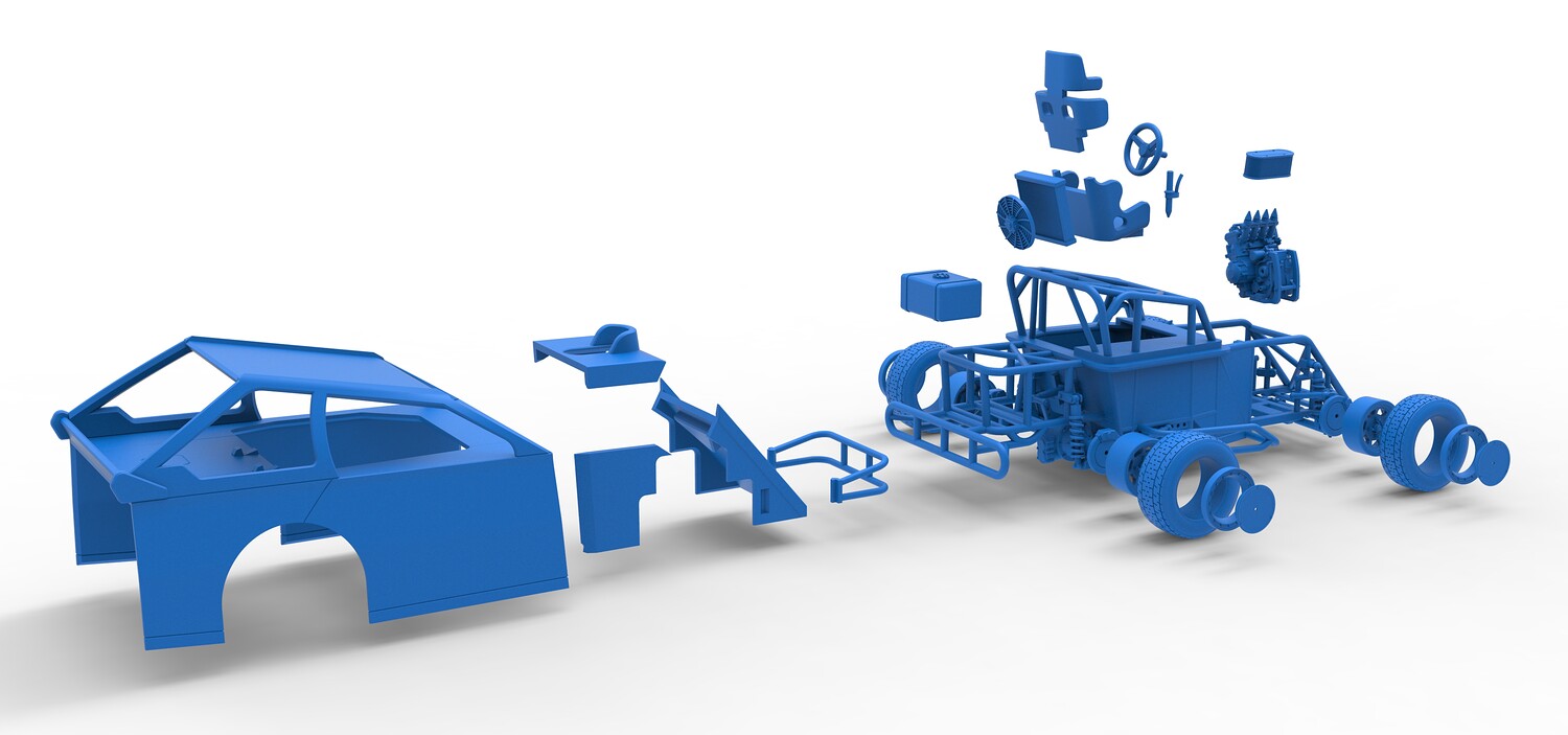 The model consists of parts: Air filter, Beadlock rings, Beadlock rings for mud guard, Engine, Exhaust, Fan, Frame, Front bumper, Front rims, Front tires, Hood, Mud guards, Nose, Radiator, Rear rims, Rear tires, Seat part 1,2, Shell main part, Shell side pannel, Shifter, Steering wheel, Tank.