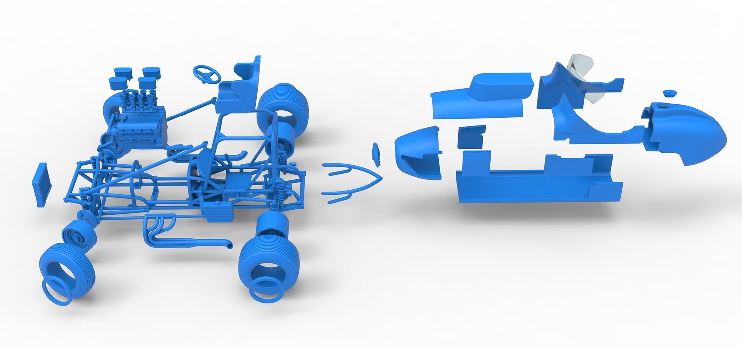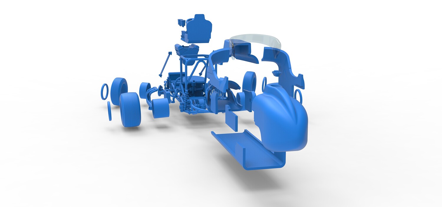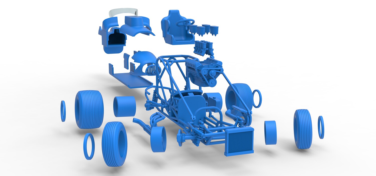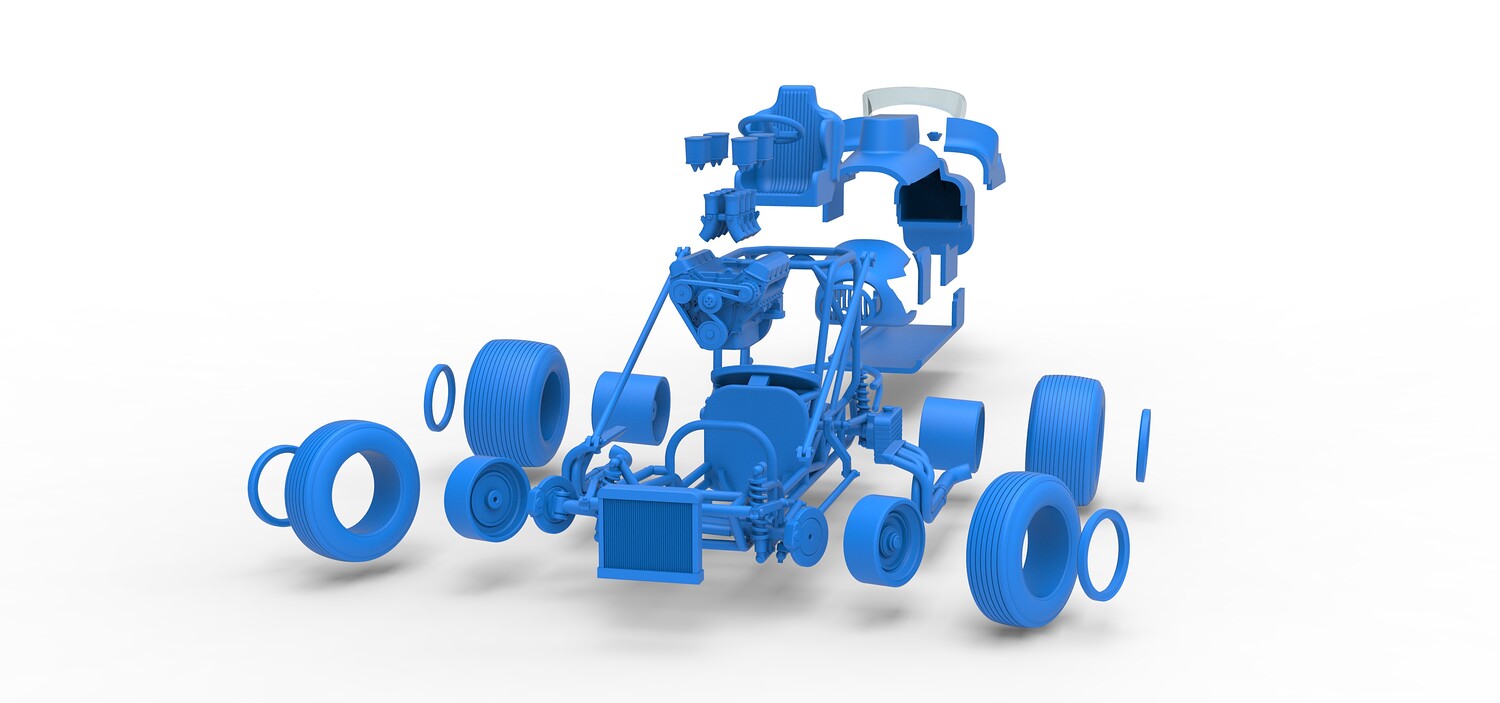 The model consists of parts: Air filters, Air intake, Beadlock rings, Engine, Frame, Front grid, Front rims, Front tires, Fuel cap, Hood, Left bar, Left exhaust, Nose, Oil tank, Radiator, Rear bumper, Rear left rim, Rear left tire, Rear right rim, Rear right tire, Right bar, Right exhaust, Seat, Shell bottom part, Shell left part 1-3, Shell right part 1,2, Steering wheel, Tank, Windshield.