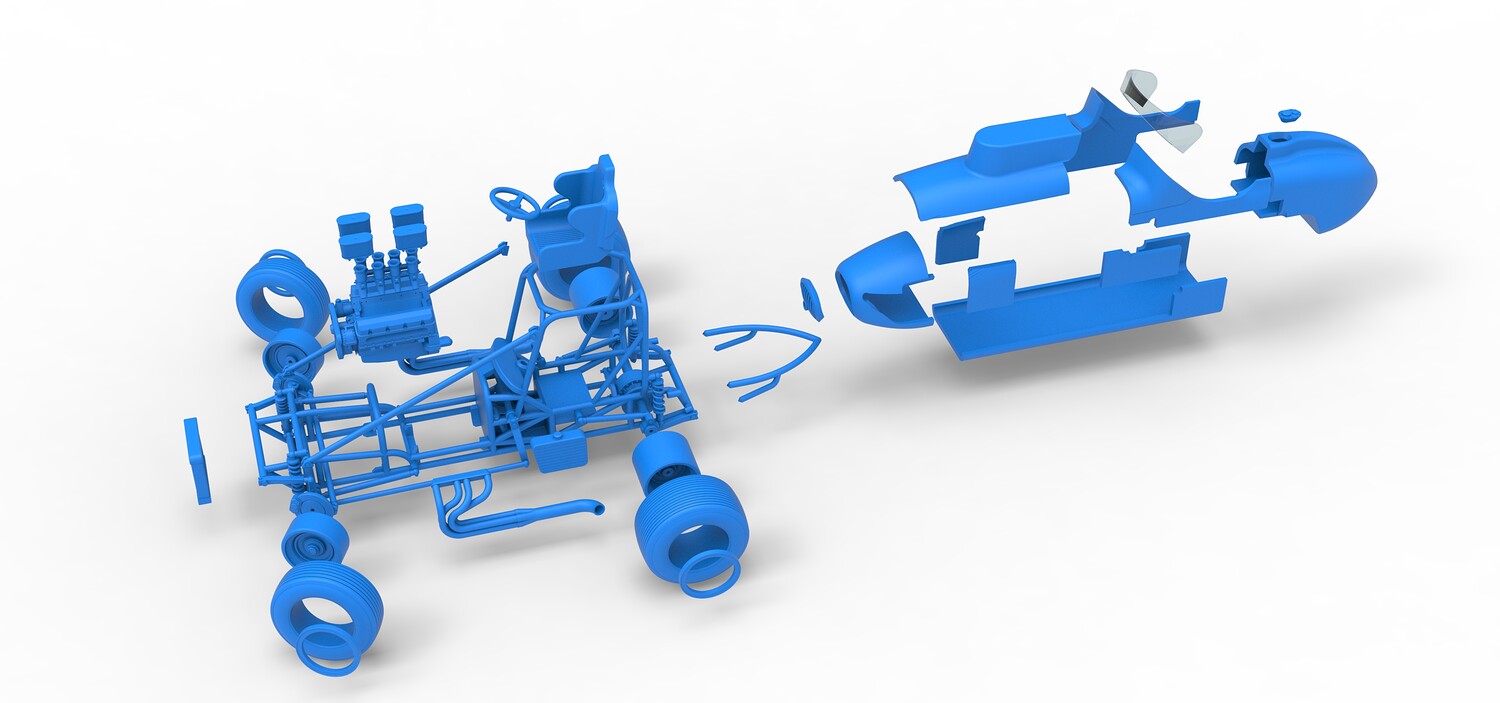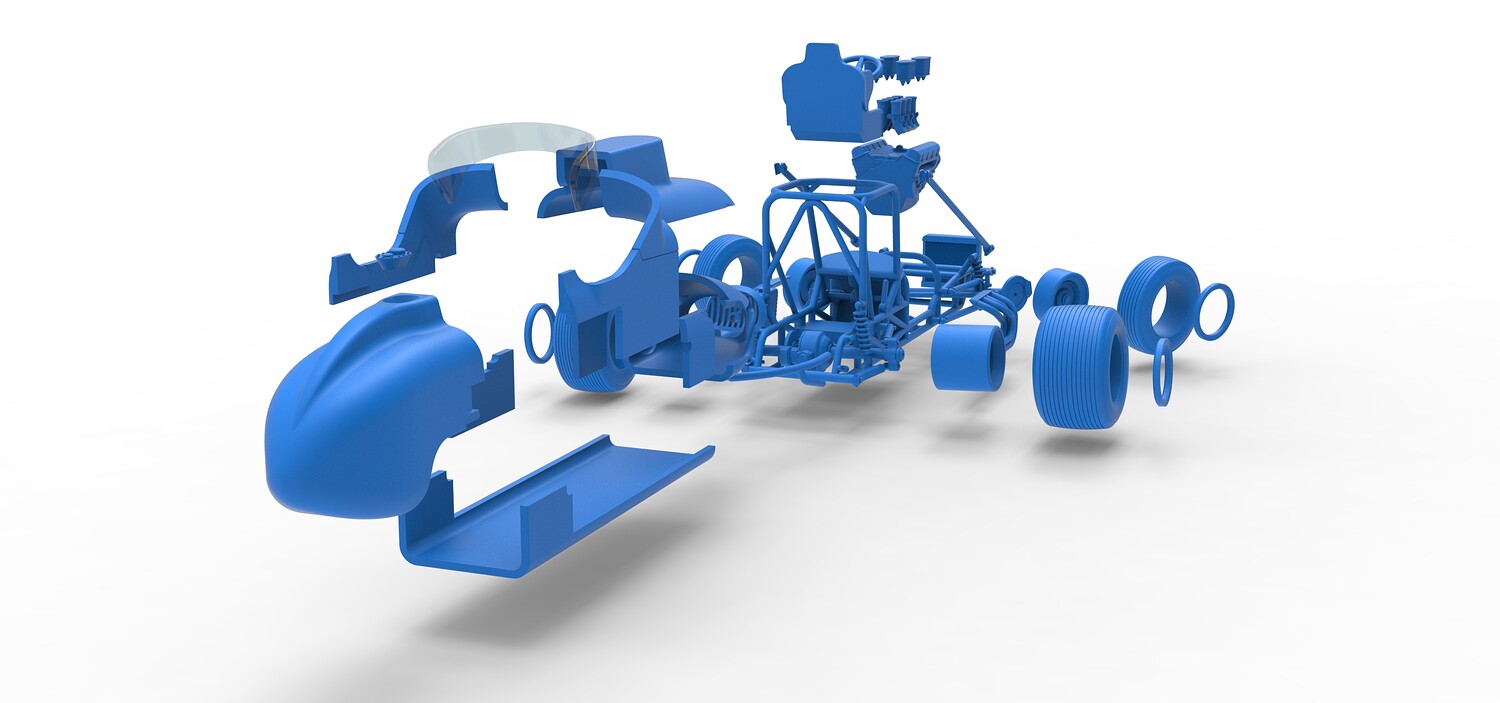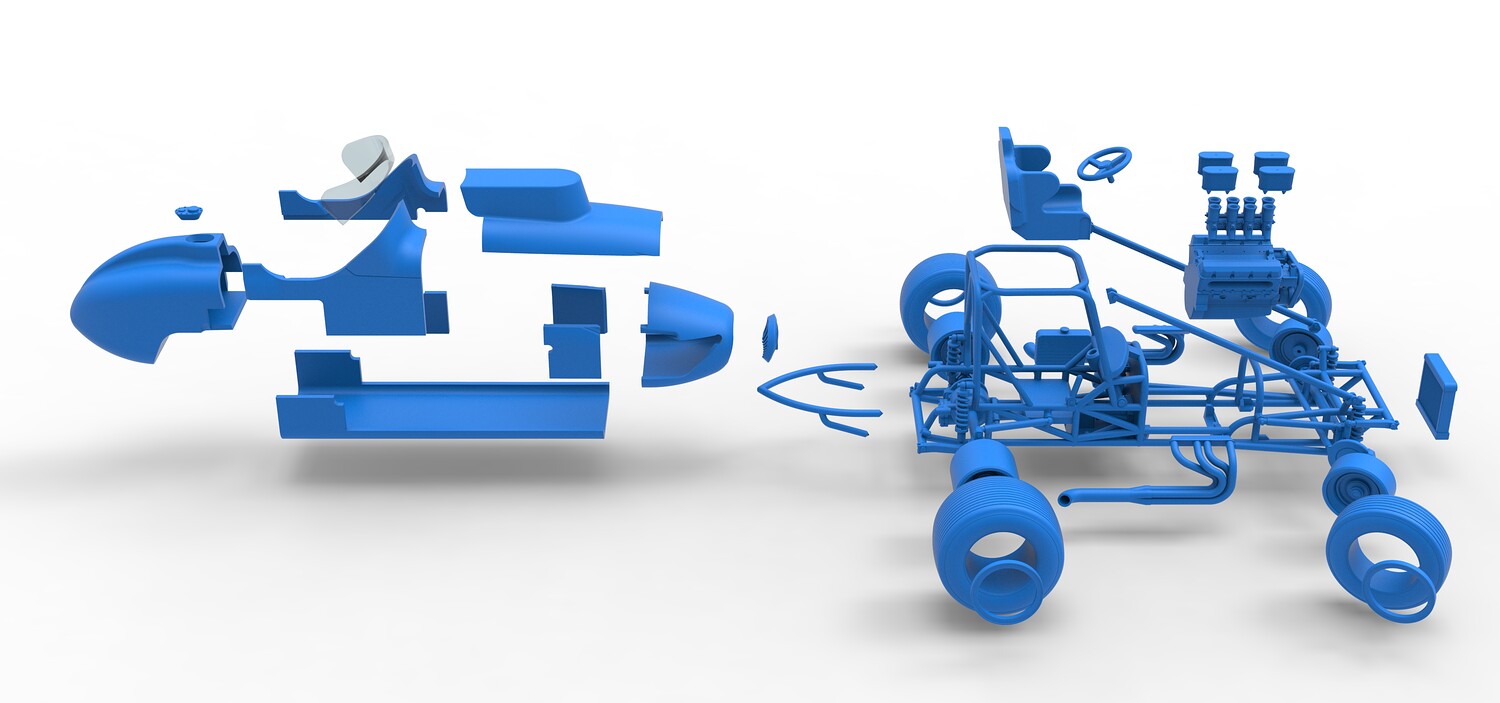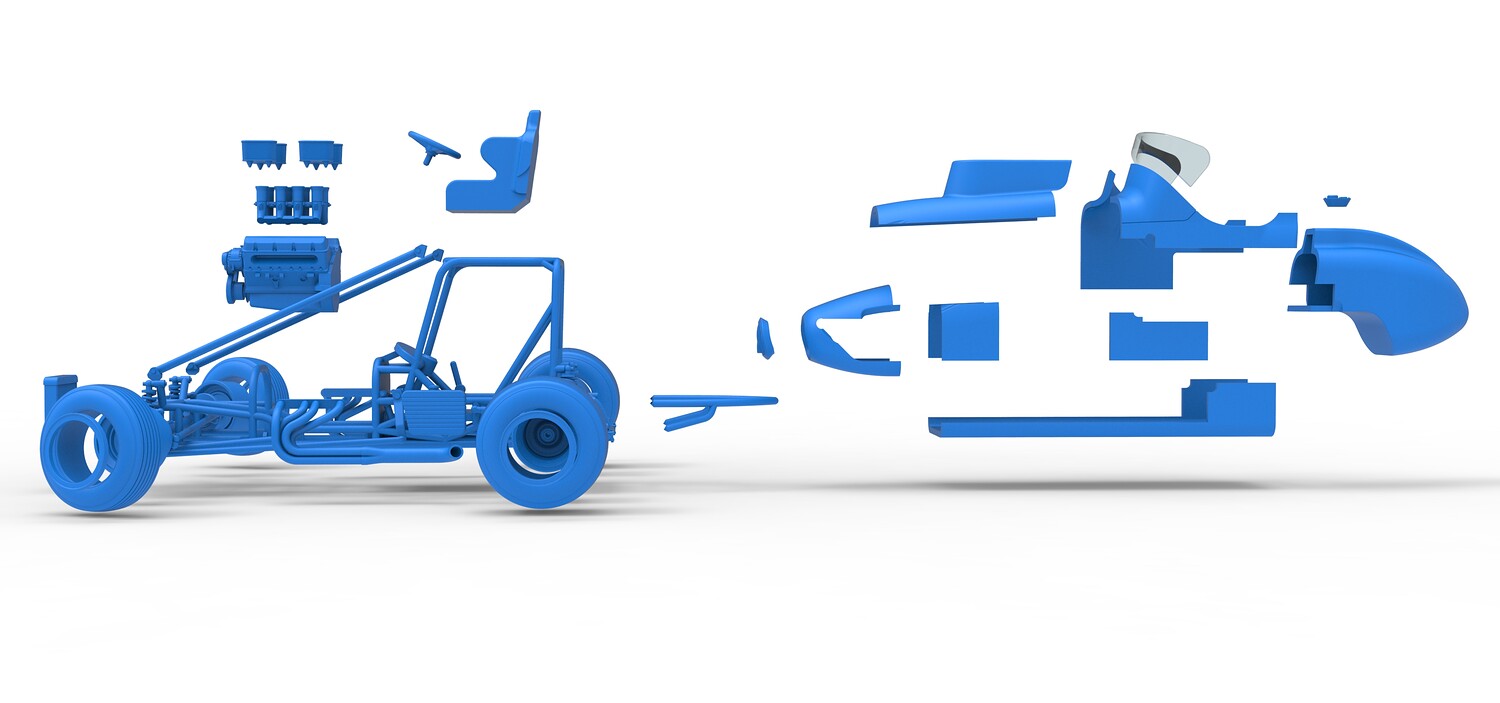 The model consists of parts: Air filters, Air intake, Beadlock rings, Engine, Frame, Front grid, Front rims, Front tires, Fuel cap, Hood, Left bar, Left exhaust, Nose, Oil tank, Radiator, Rear bumper, Rear left rim, Rear left tire, Rear right rim, Rear right tire, Right bar, Right exhaust, Seat, Shell bottom part, Shell left part 1-3, Shell right part 1,2, Steering wheel, Tank, Windshield.
