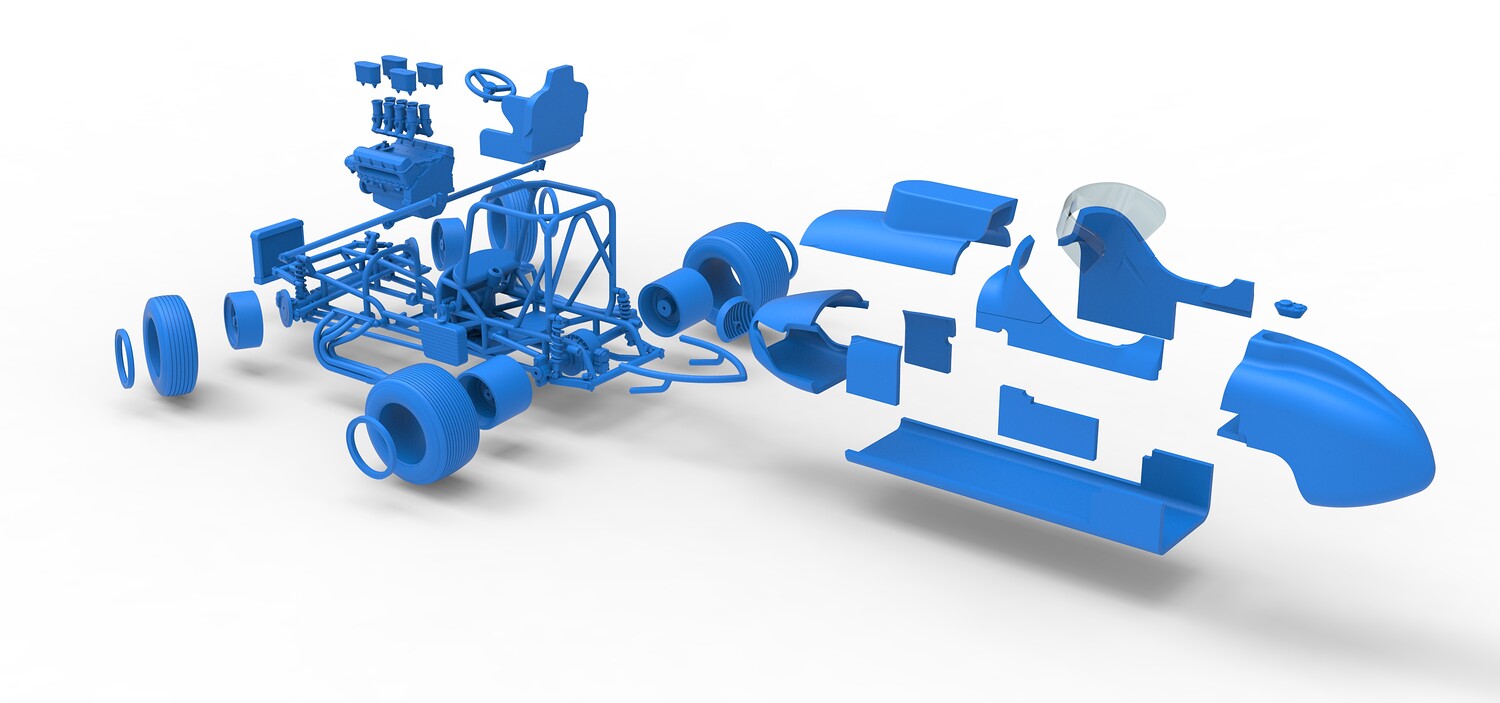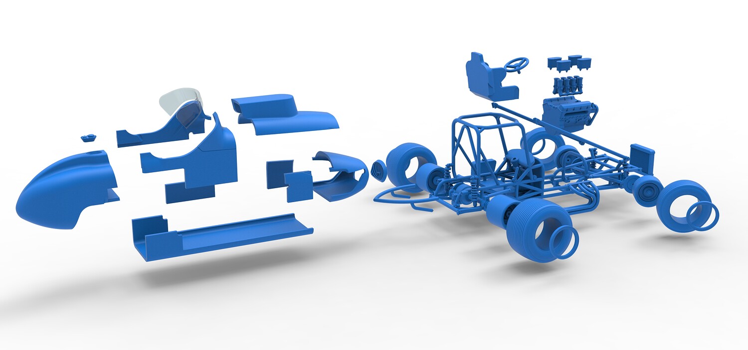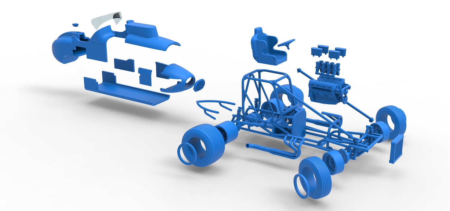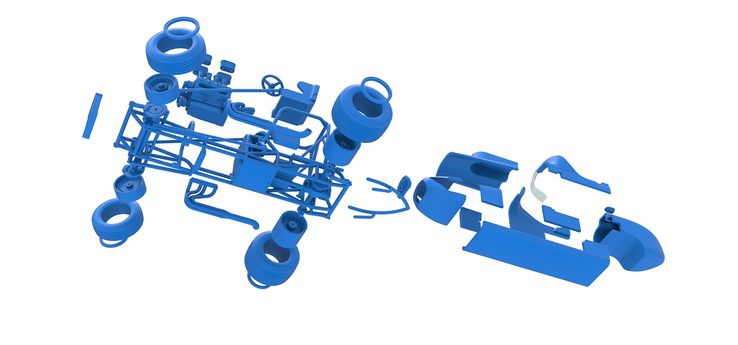 The model consists of parts: Air filters, Air intake, Beadlock rings, Engine, Frame, Front grid, Front rims, Front tires, Fuel cap, Hood, Left bar, Left exhaust, Nose, Oil tank, Radiator, Rear bumper, Rear left rim, Rear left tire, Rear right rim, Rear right tire, Right bar, Right exhaust, Seat, Shell bottom part, Shell left part 1-3, Shell right part 1,2, Steering wheel, Tank, Windshield.