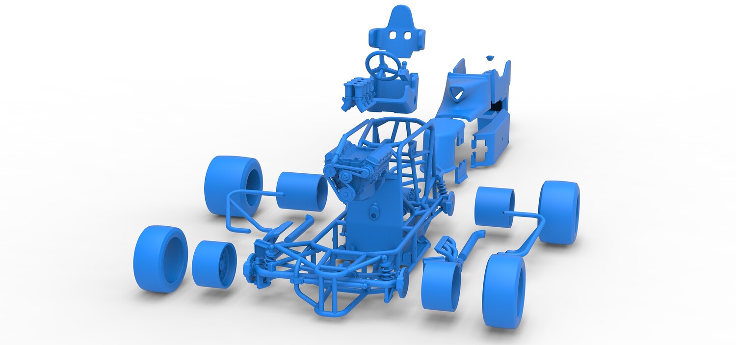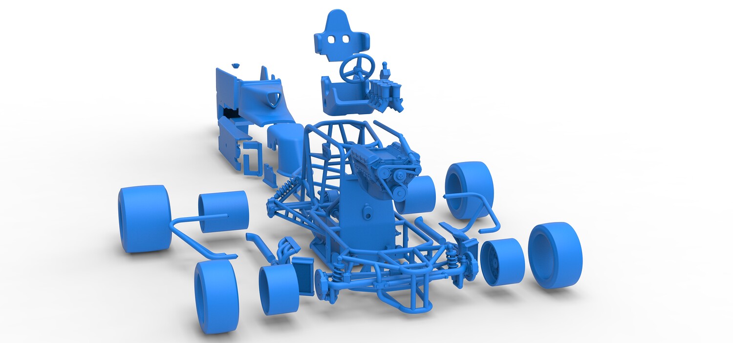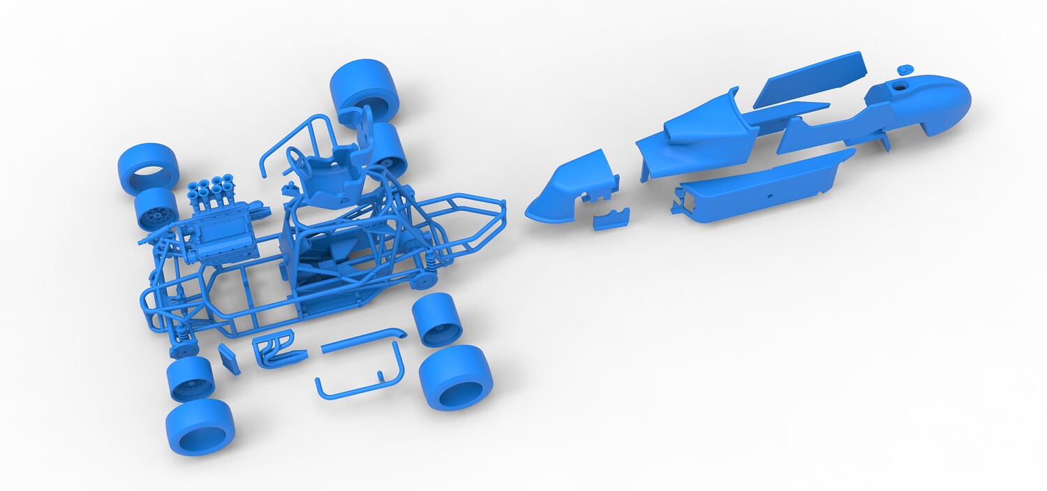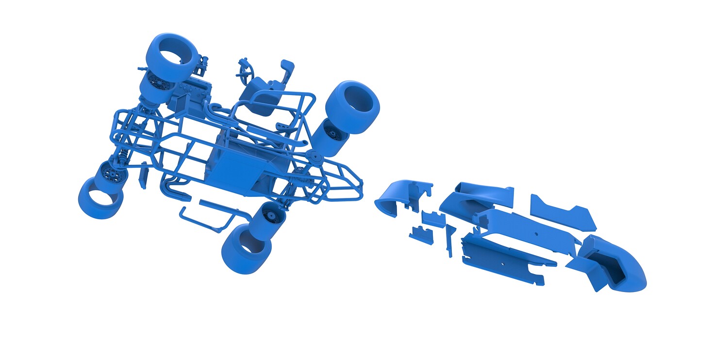 The model consists of parts: Air intake, Engine main part, Exhaust tubes, Frame, Front rims, Front tires, Fuel tank bottom plate, Fuel tank insert, Fuel tank, Hood, Left bumper, Left exhaust pipes, Left shell part 1,2, Nose central part, Nose left part, Nose right part, Radiator, Rear left rim, Rear left tire, Rear right rim, Rear right tire, Right bumper, Right exhaust pipes, Right shell part 1-3, Seat part 1,2, Shifter, Steering shaft, Steering wheel.