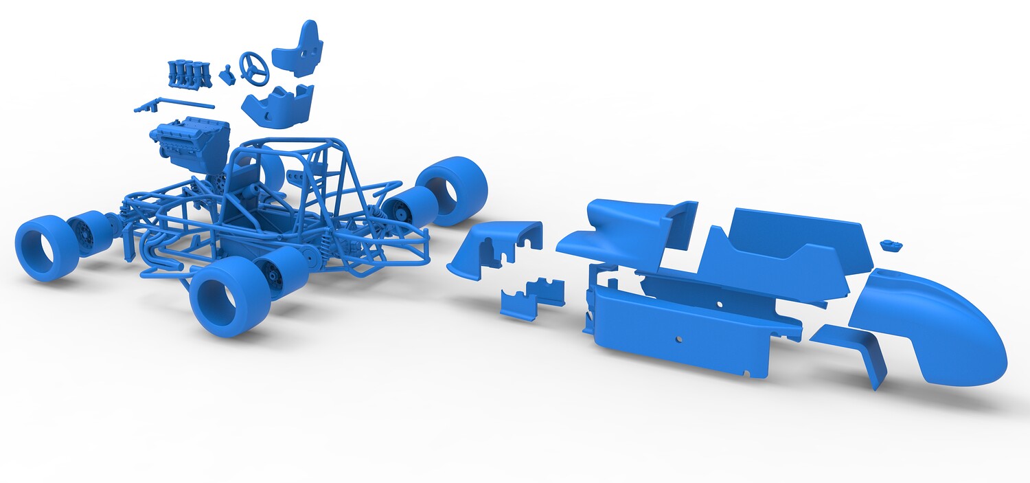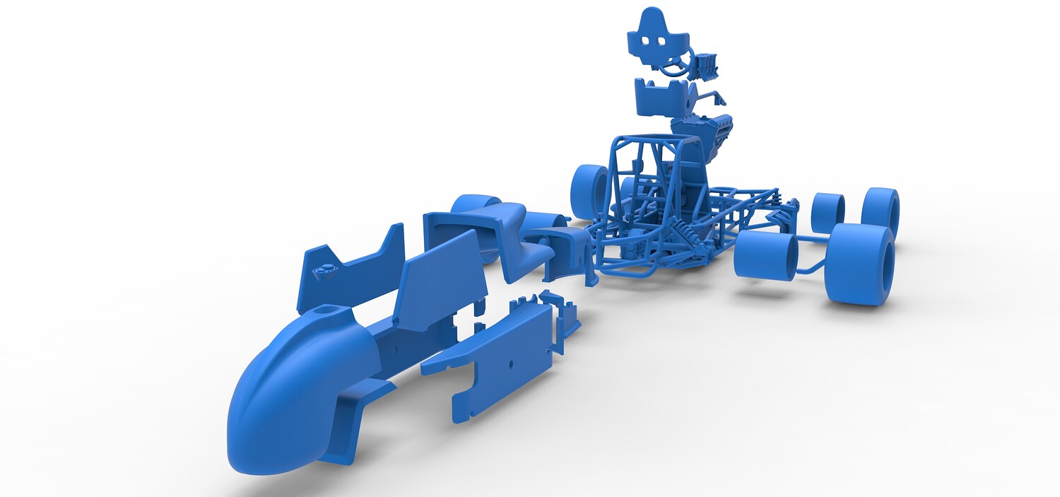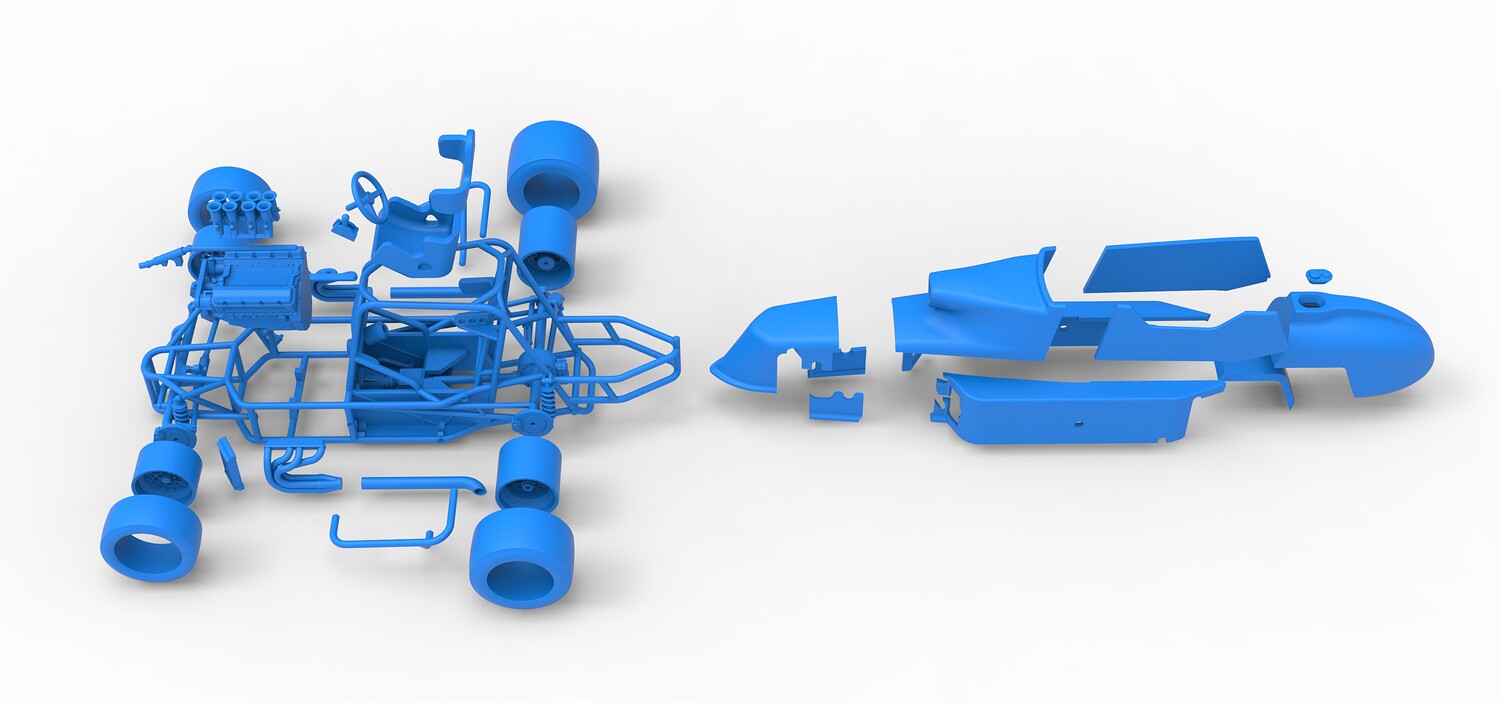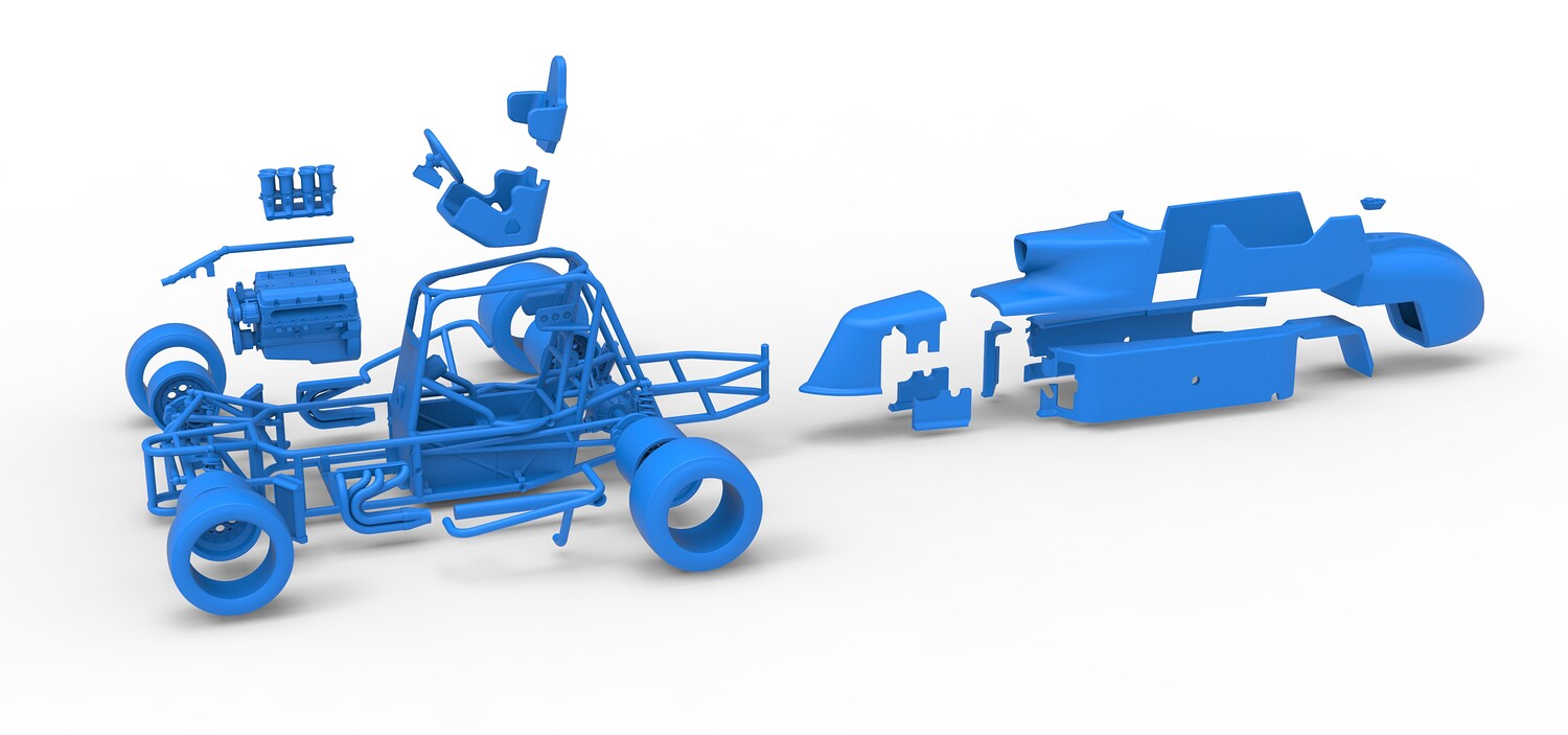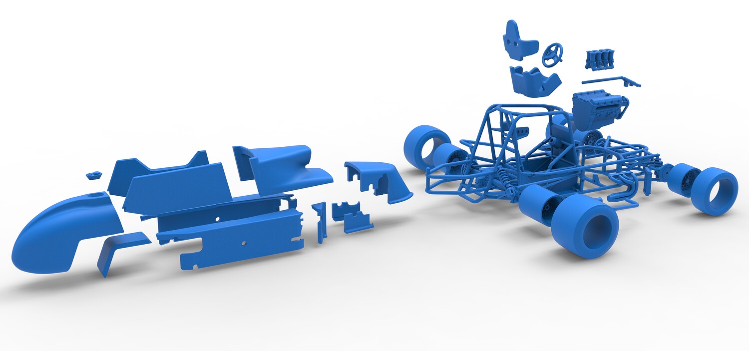The model consists of parts: Air intake, Engine main part, Exhaust tubes, Frame, Front rims, Front tires, Fuel tank bottom plate, Fuel tank insert, Fuel tank, Hood, Left bumper, Left exhaust pipes, Left shell part 1,2, Nose central part, Nose left part, Nose right part, Radiator, Rear left rim, Rear left tire, Rear right rim, Rear right tire, Right bumper, Right exhaust pipes, Right shell part 1-3, Seat part 1,2, Shifter, Steering shaft, Steering wheel.