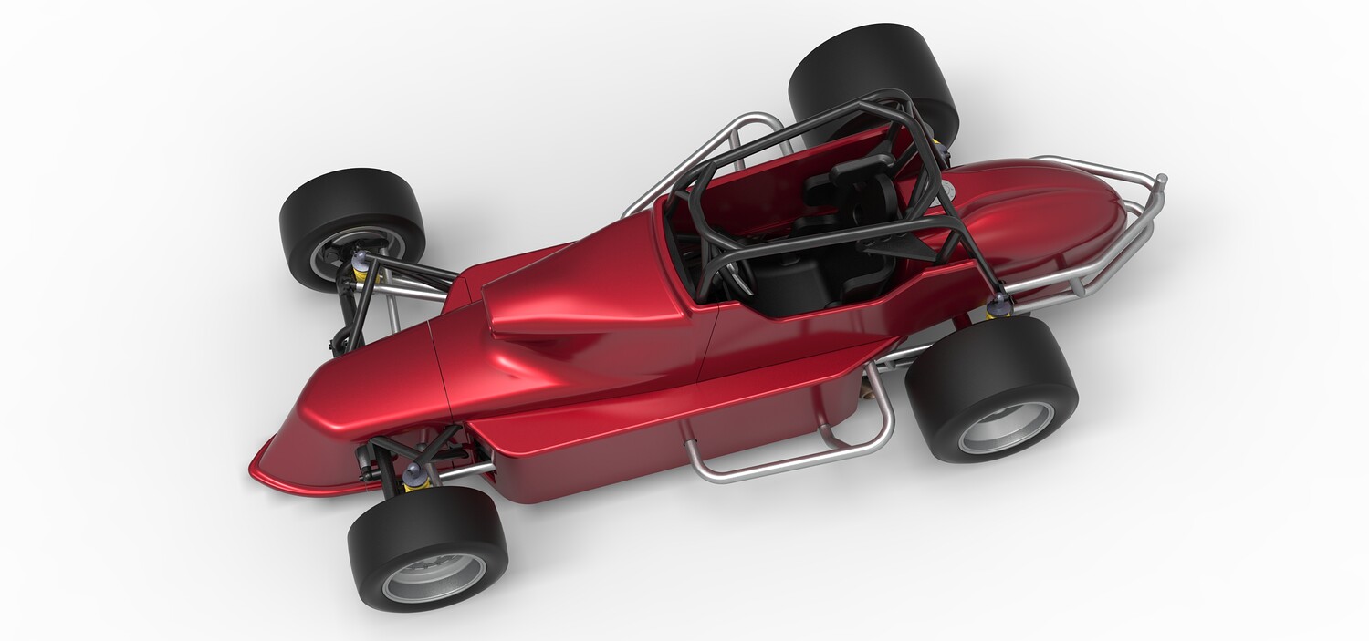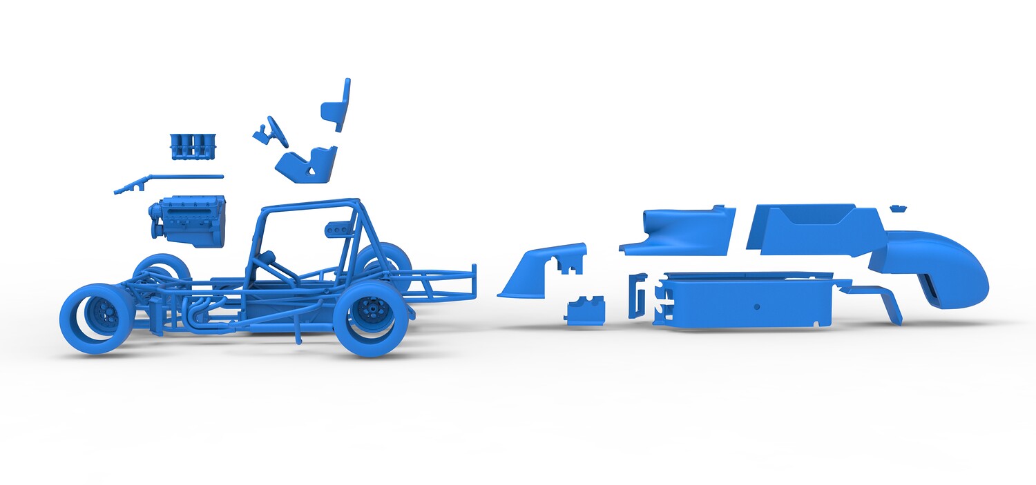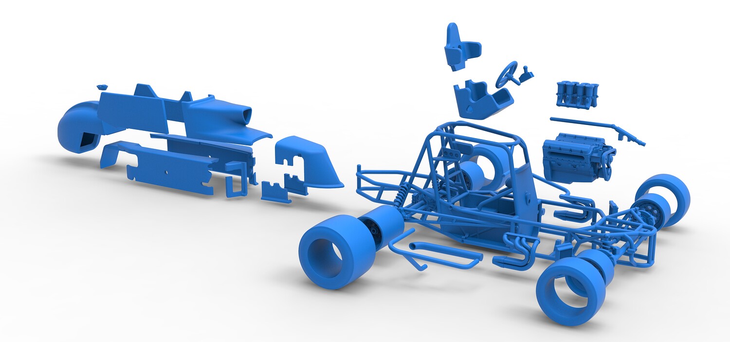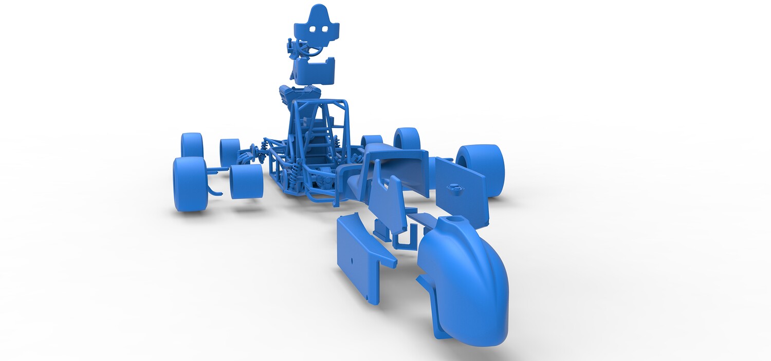 The model consists of parts: Air intake, Engine main part, Exhaust tubes, Frame, Front rims, Front tires, Fuel tank bottom plate, Fuel tank insert, Fuel tank, Hood, Left bumper, Left exhaust pipes, Left shell part 1,2, Nose central part, Nose left part, Nose right part, Radiator, Rear left rim, Rear left tire, Rear right rim, Rear right tire, Right bumper, Right exhaust pipes, Right shell part 1-3, Seat part 1,2, Shifter, Steering shaft, Steering wheel.