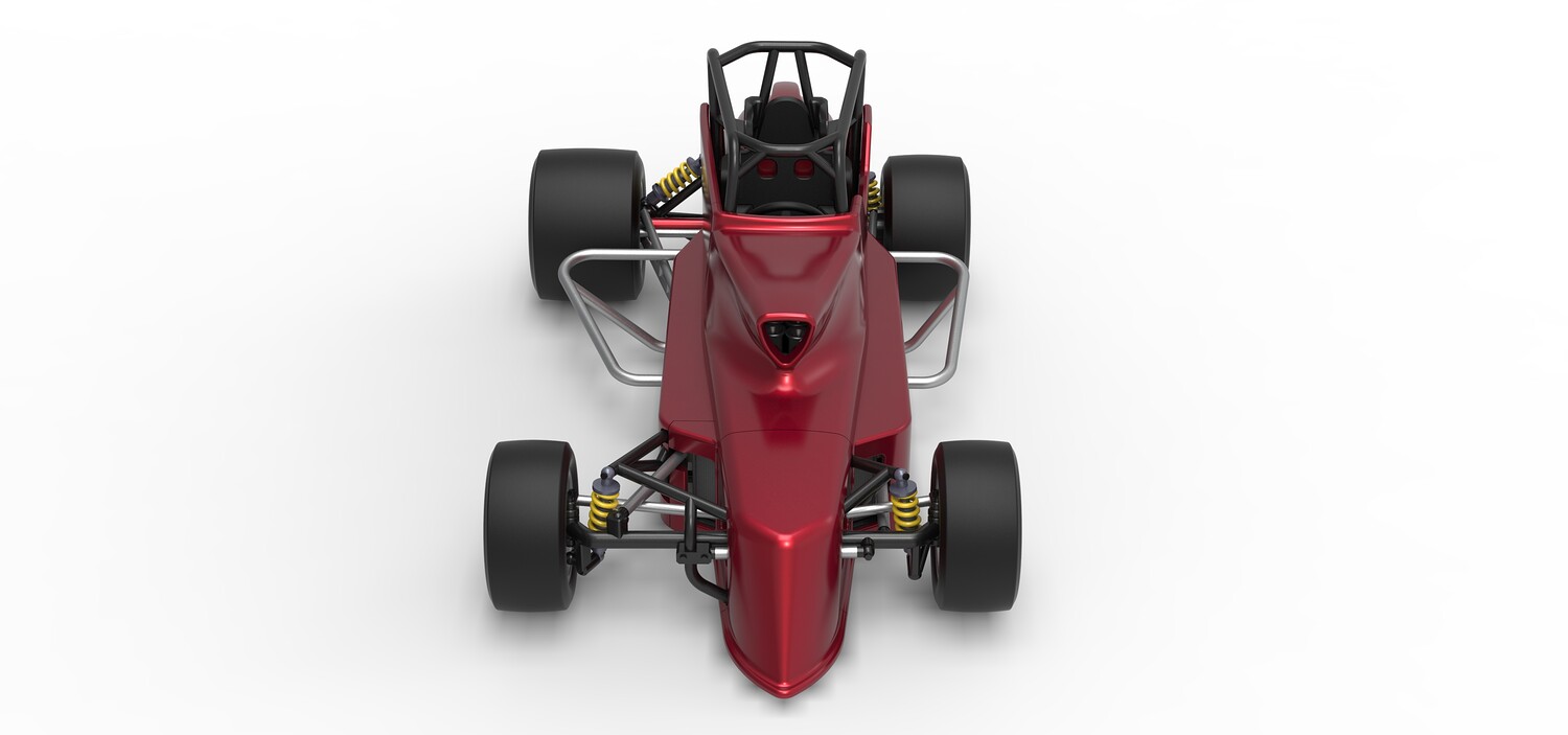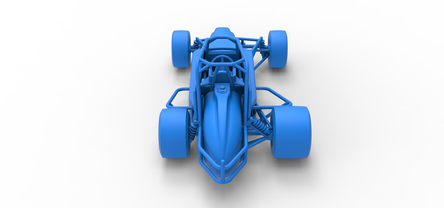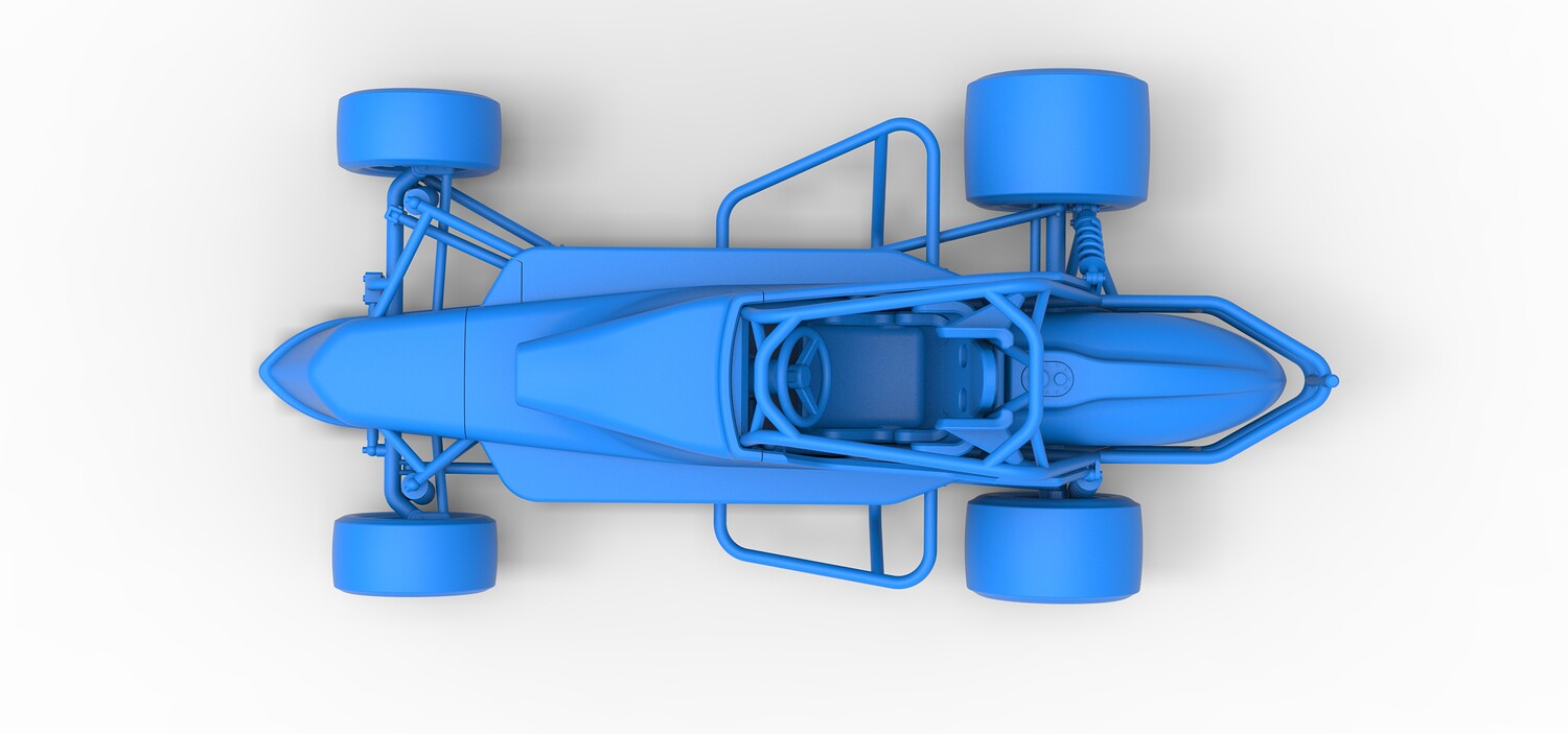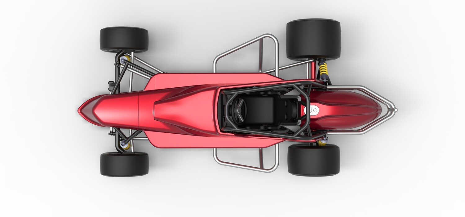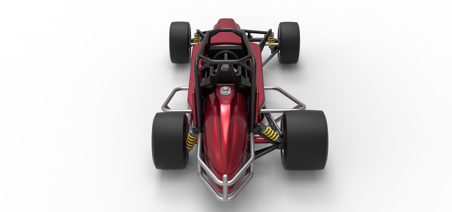 The model consists of parts: Air intake, Engine main part, Exhaust tubes, Frame, Front rims, Front tires, Fuel tank bottom plate, Fuel tank insert, Fuel tank, Hood, Left bumper, Left exhaust pipes, Left shell part 1,2, Nose central part, Nose left part, Nose right part, Radiator, Rear left rim, Rear left tire, Rear right rim, Rear right tire, Right bumper, Right exhaust pipes, Right shell part 1-3, Seat part 1,2, Shifter, Steering shaft, Steering wheel.
