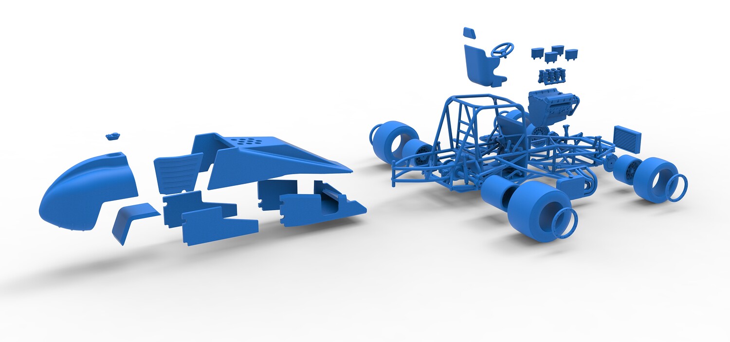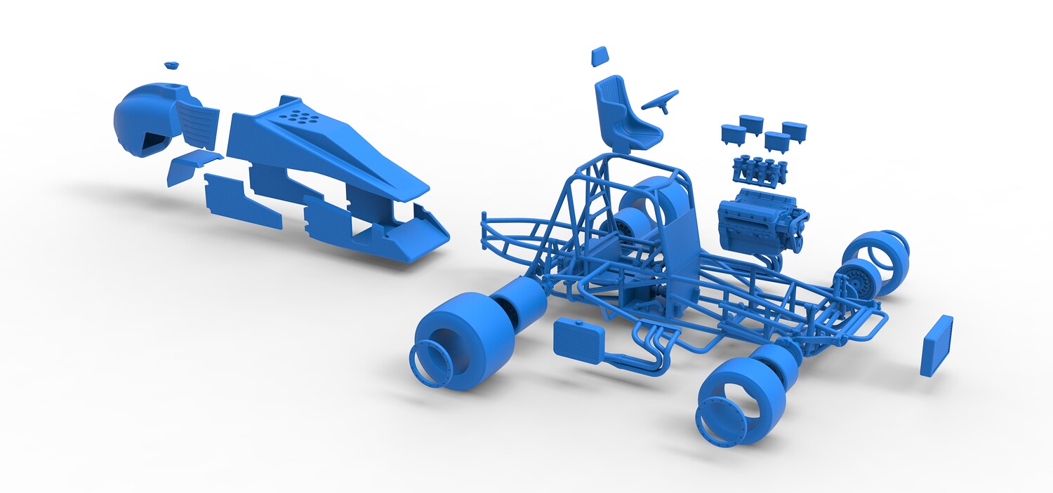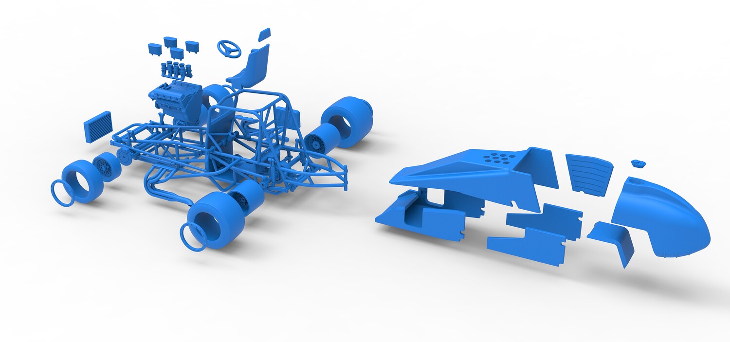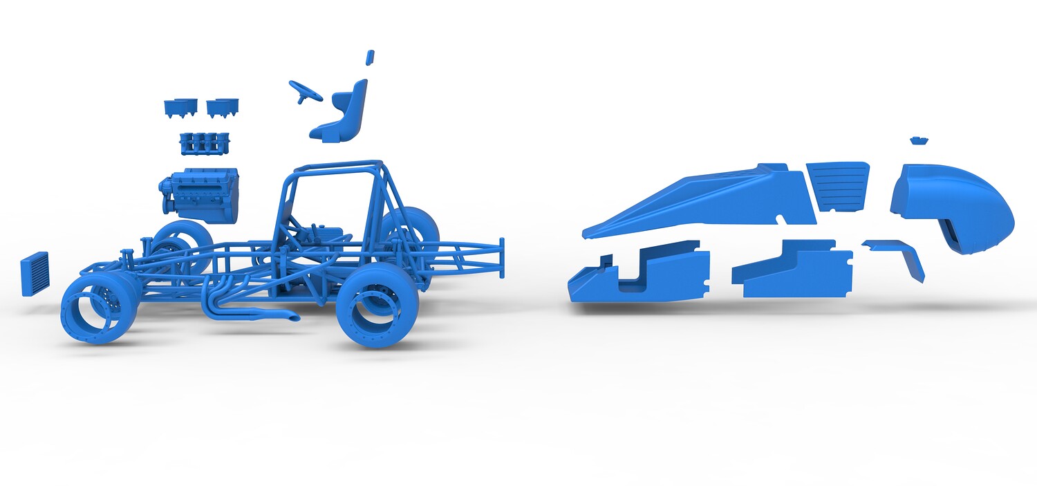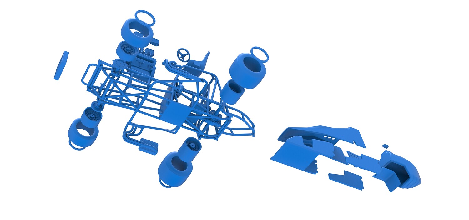 The model consists of parts: Air filters, Air intake, Beadlock rings, Engine, Frame, Front left rim, Front left tire, Front right rim, Front right tire, Fuel tank bottom plate, Fuel tank insert, Fuel tank, Headrest, Hood, Left exhaust, Nose, Oil tank, Radiator, Rear left rim, Rear left tire, Rear right rim, Rear right tire, Right exhaust, Right side shield, Seat, Side plates, Steering wheel.