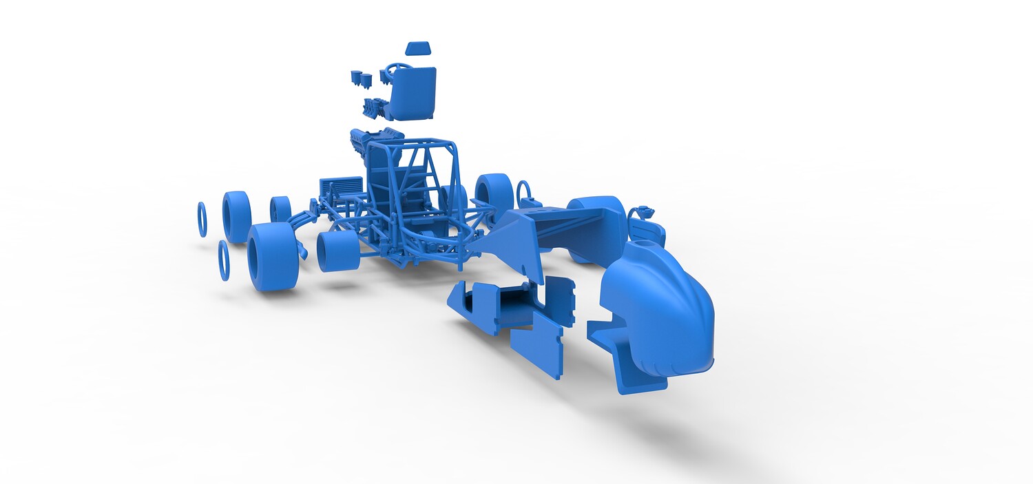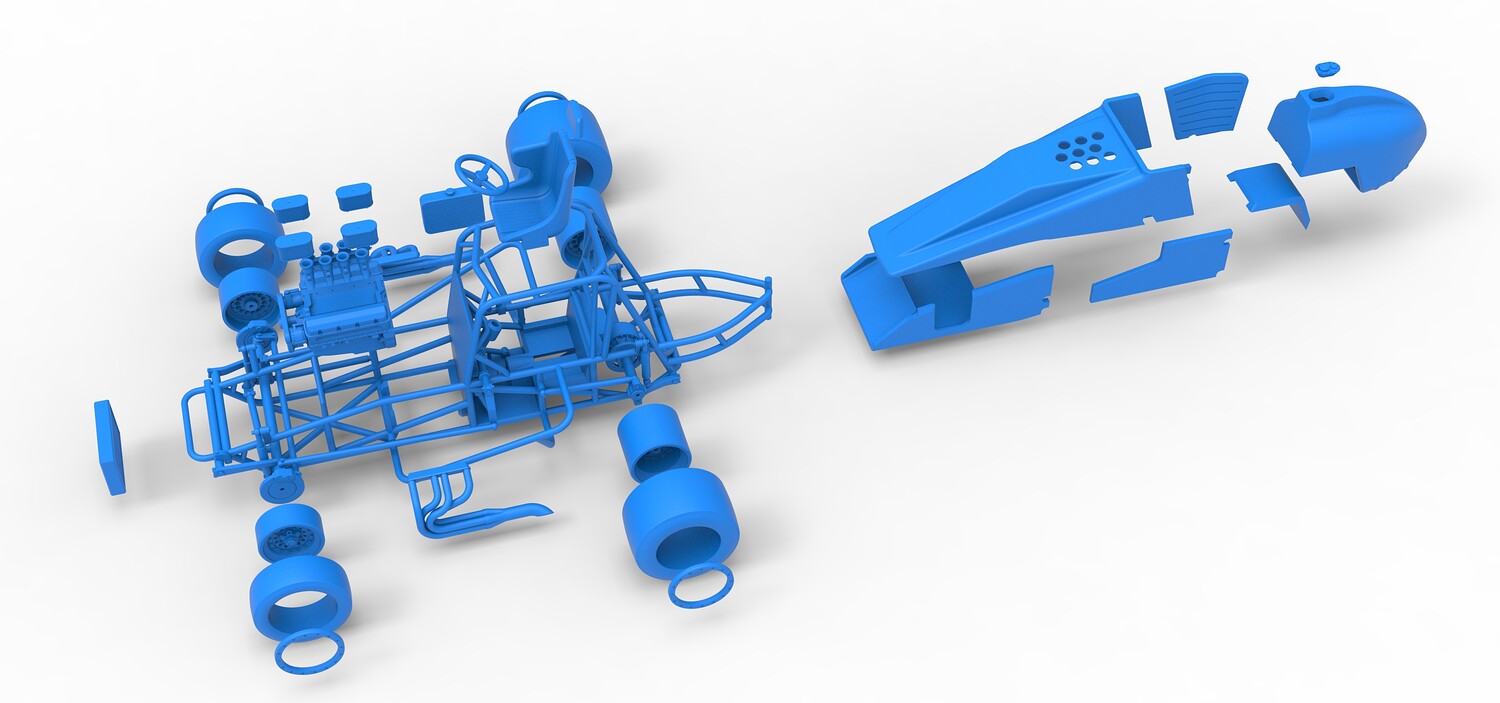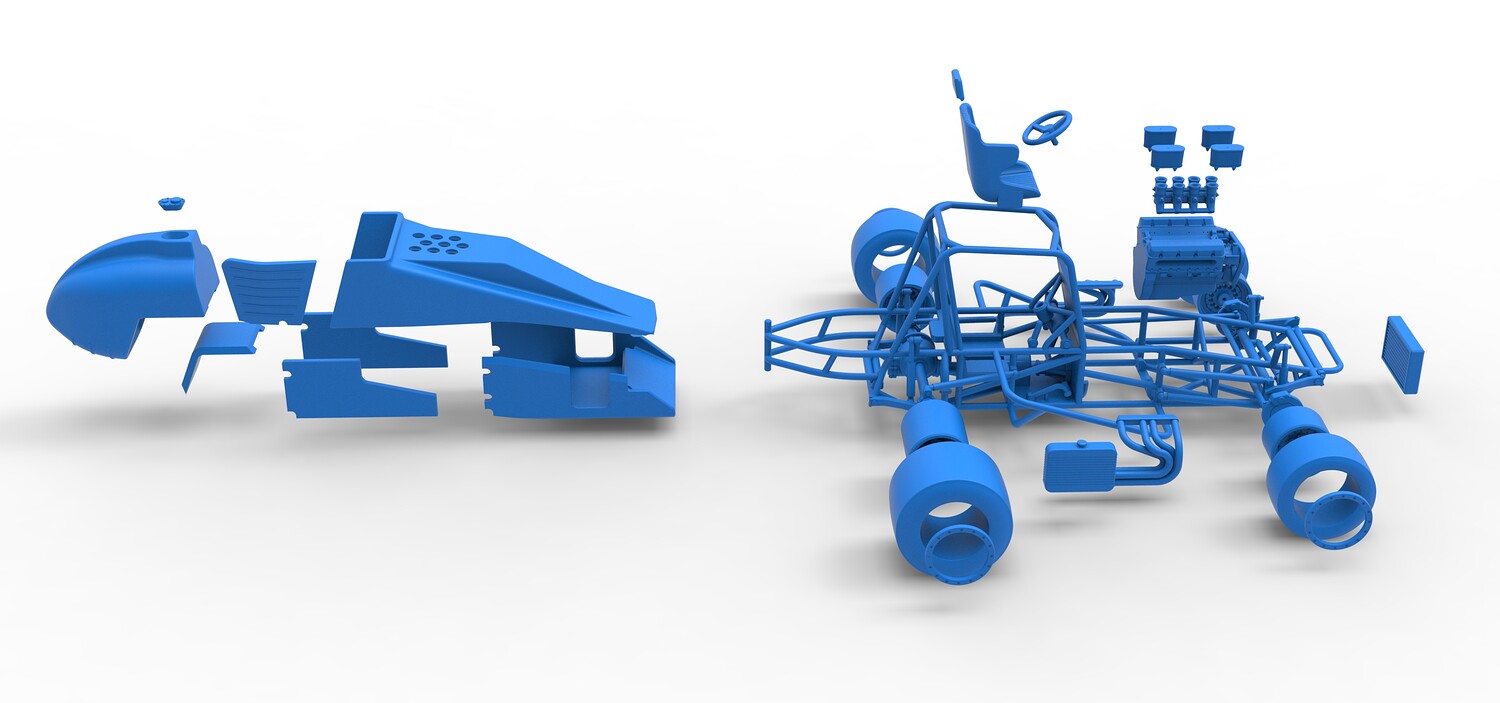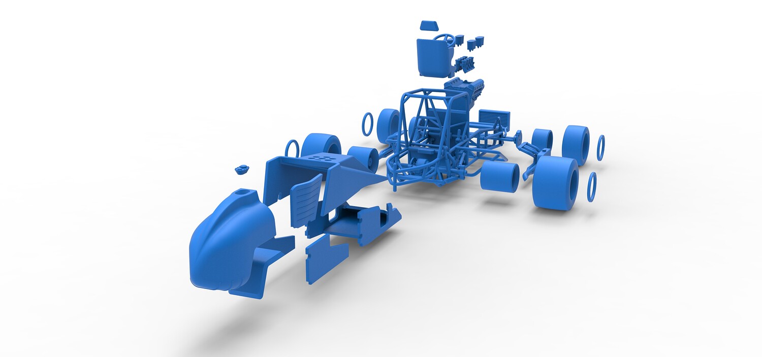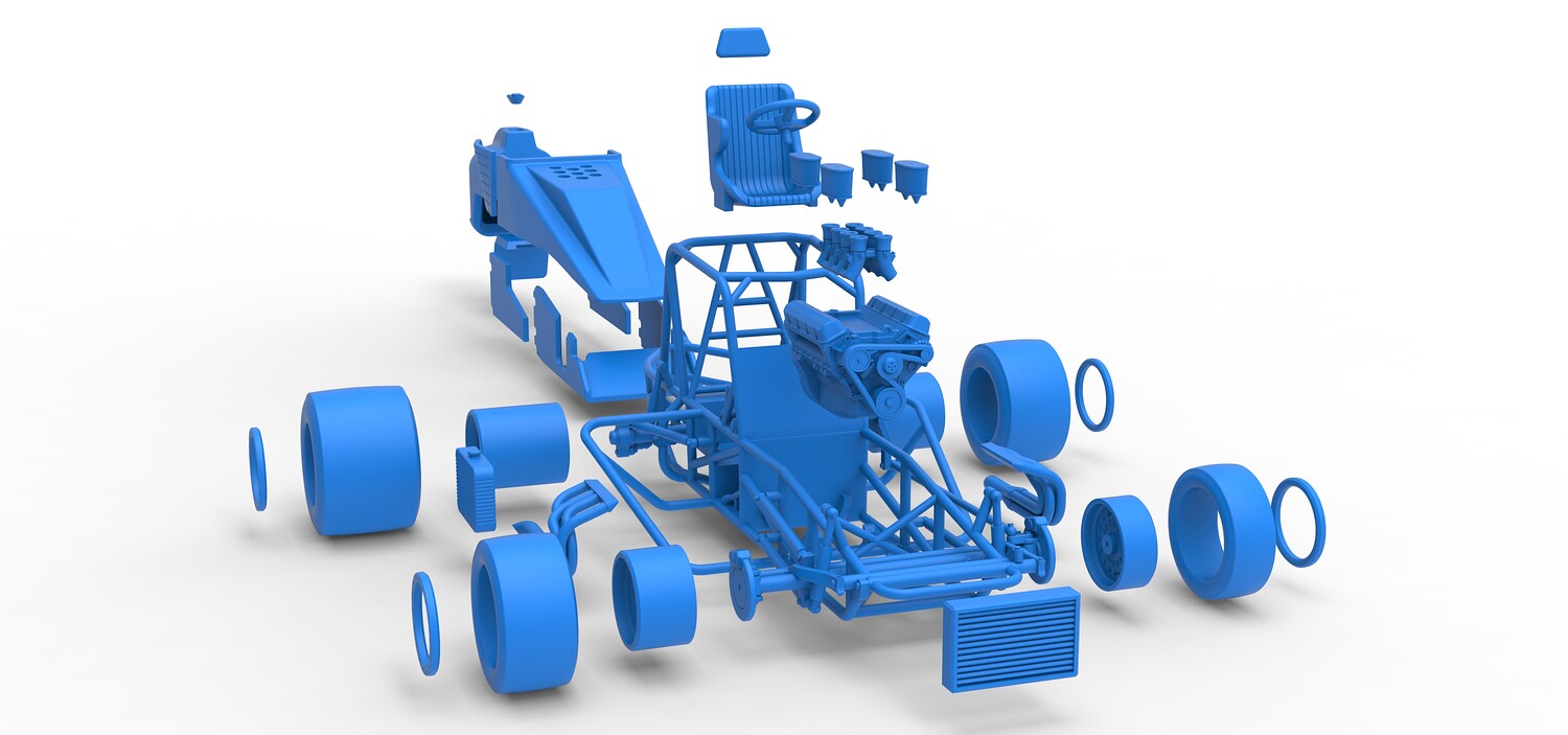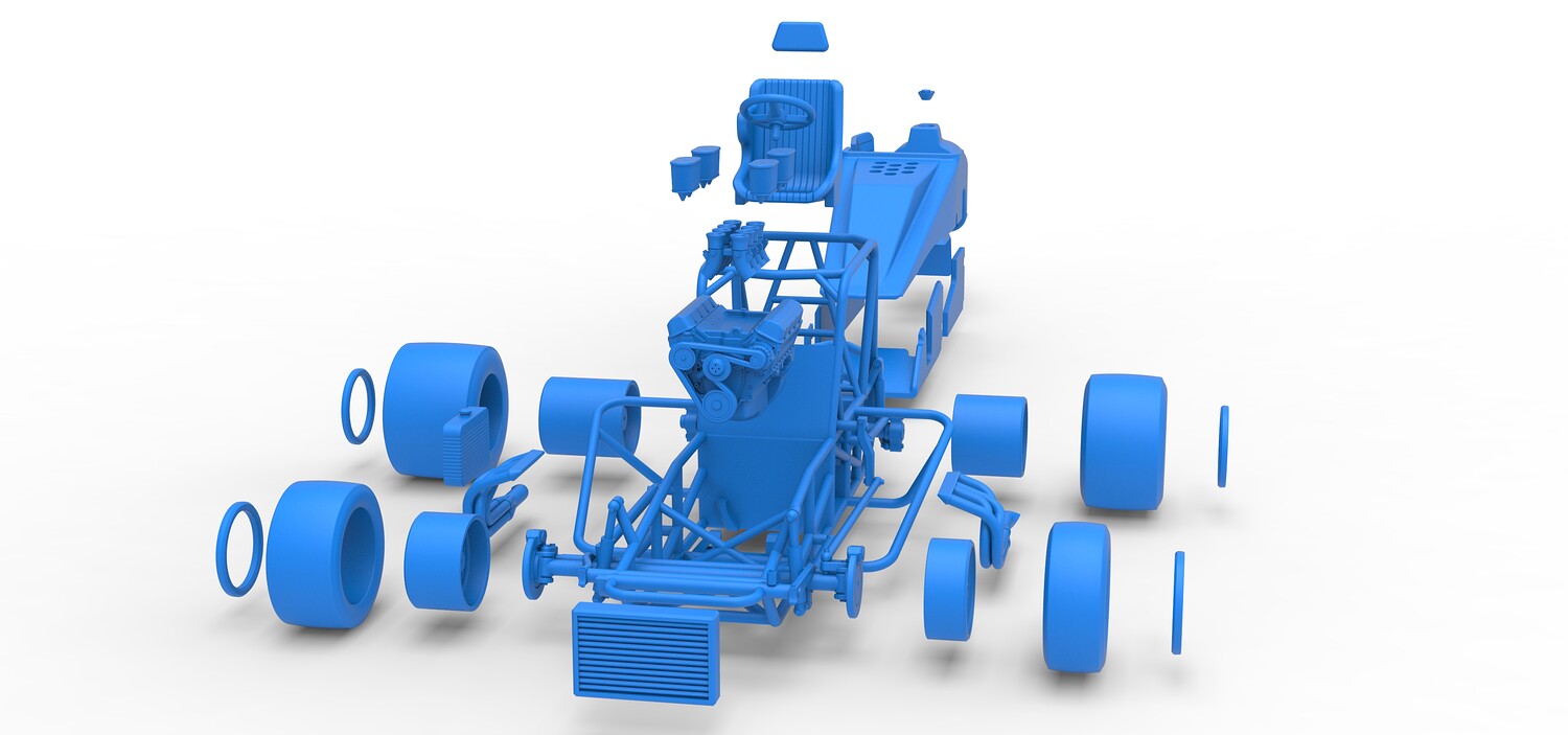 The model consists of parts: Air filters, Air intake, Beadlock rings, Engine, Frame, Front left rim, Front left tire, Front right rim, Front right tire, Fuel tank bottom plate, Fuel tank insert, Fuel tank, Headrest, Hood, Left exhaust, Nose, Oil tank, Radiator, Rear left rim, Rear left tire, Rear right rim, Rear right tire, Right exhaust, Right side shield, Seat, Side plates, Steering wheel.